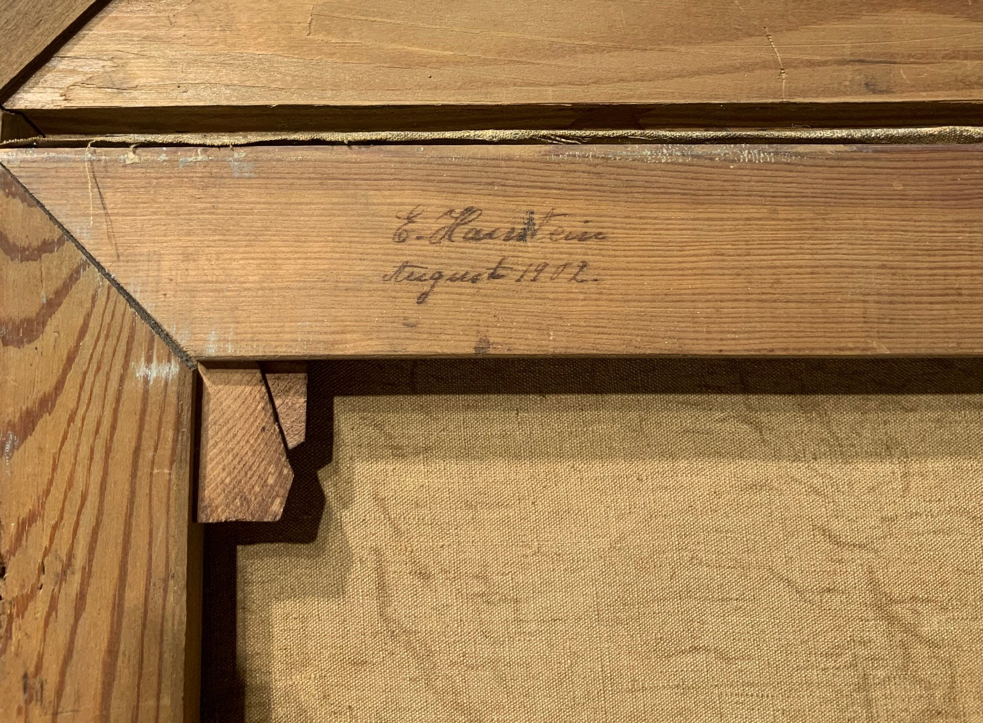 Dipinto olio su tela raffigurante giovani amanti con levriero in vesti...