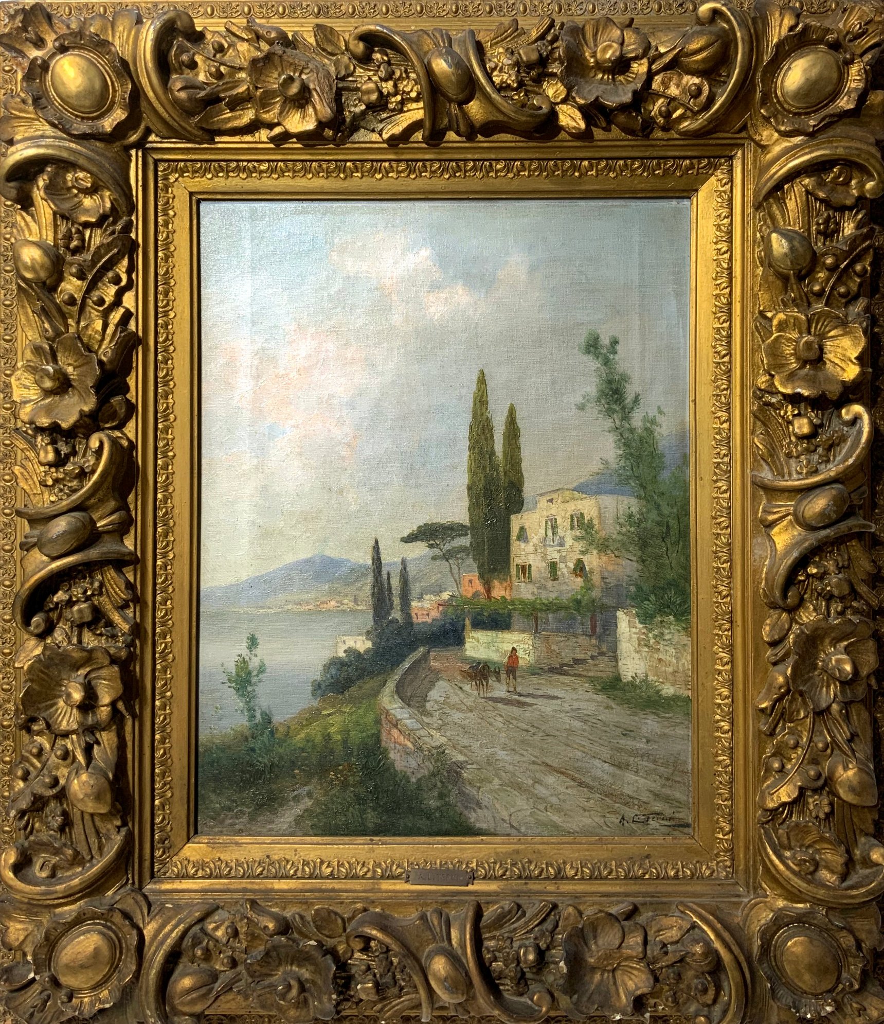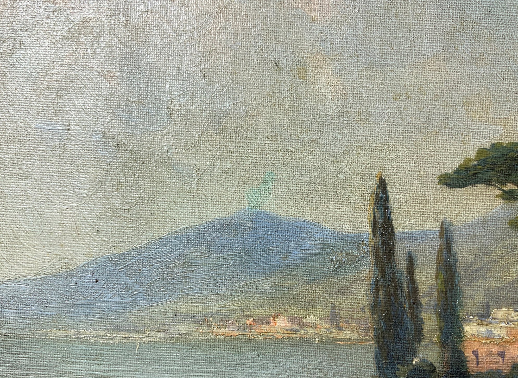 Dipinto olio su tela raffigurante paesaggio dell’Etna vista da Taormina. Firmato in basso a destra A.L. Terni (Georg Fischhof) (1859-1914). Cm 51x39, in bella cornice dorata 80x68.