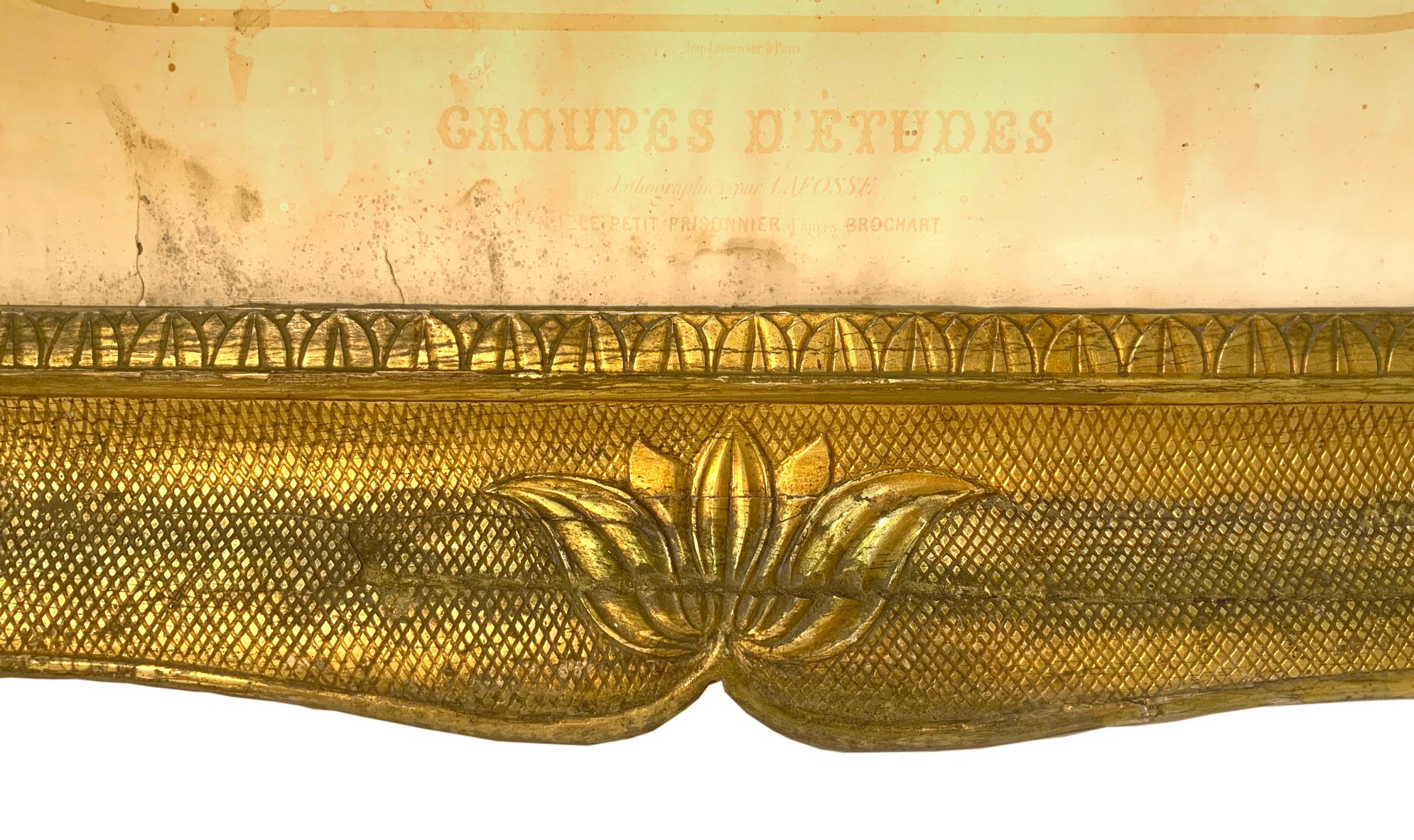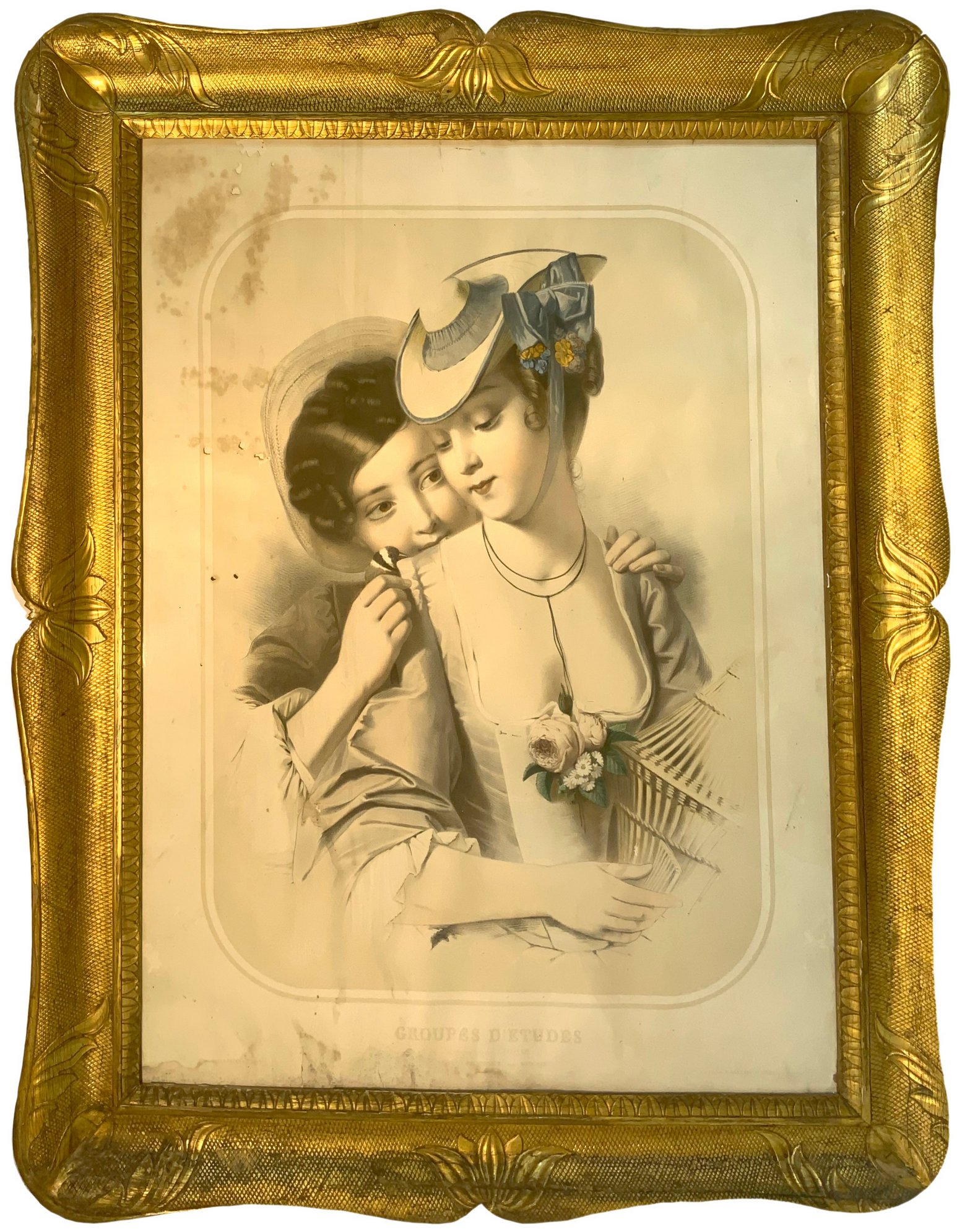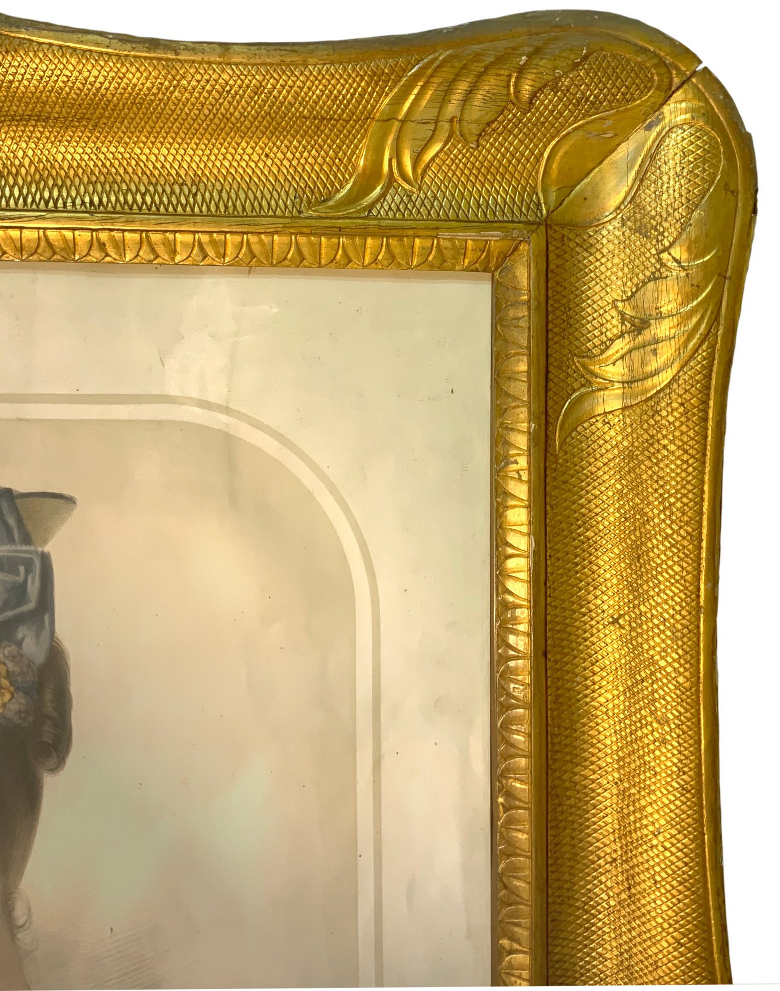 Cornice a vassoio in legno dorato a mecca, inizi XIX secolo, Sicilia. Con stampa raffigurante due donne con cappello. Cm 105x83
