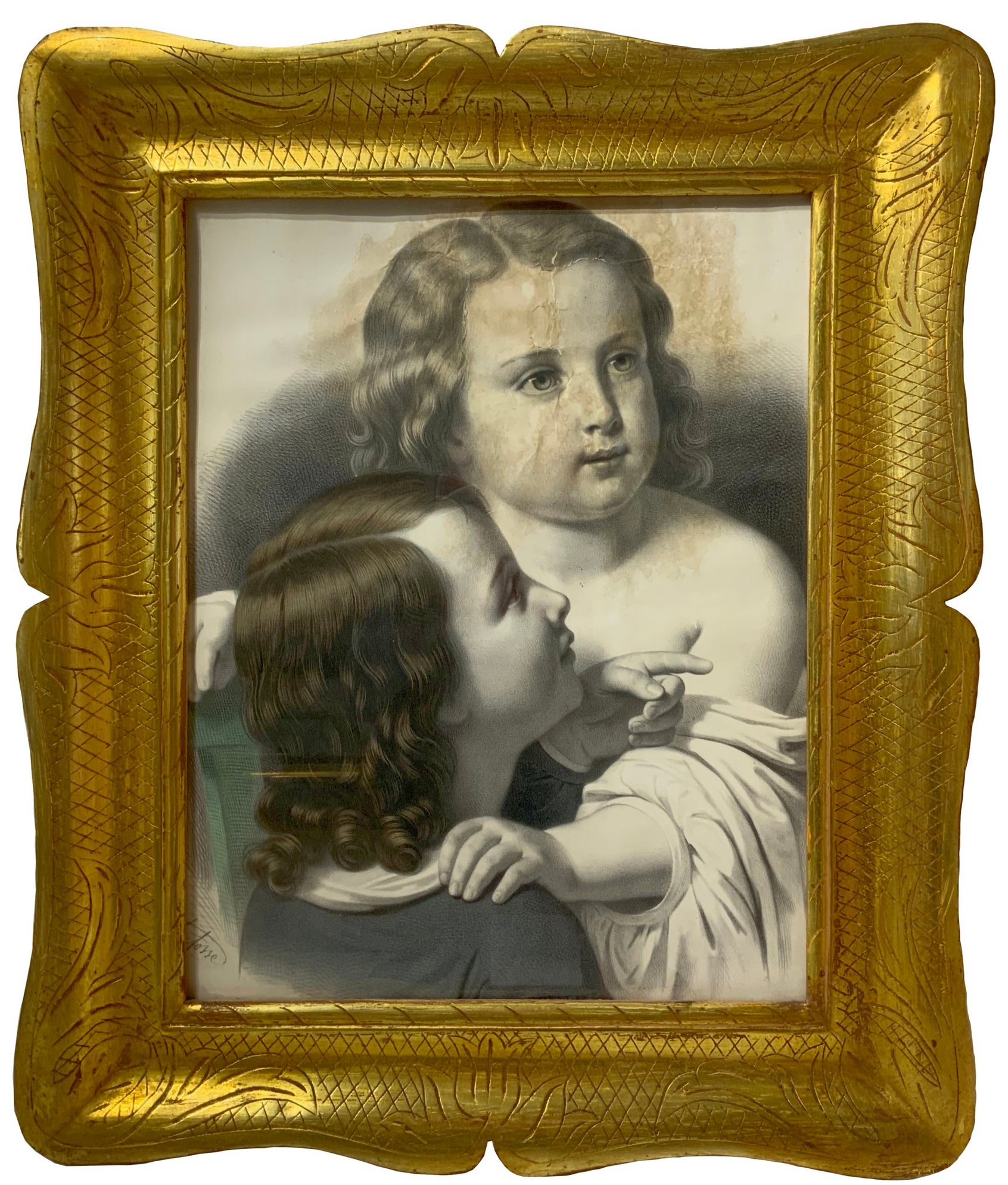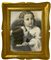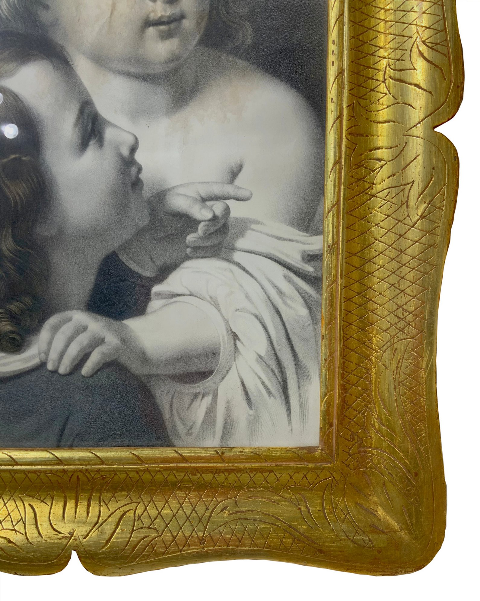 Cornice a vassoio in legno dorata a mecca, inizi XX secolo. Con stampa di giovani donne con cappello. Cm 70x59.