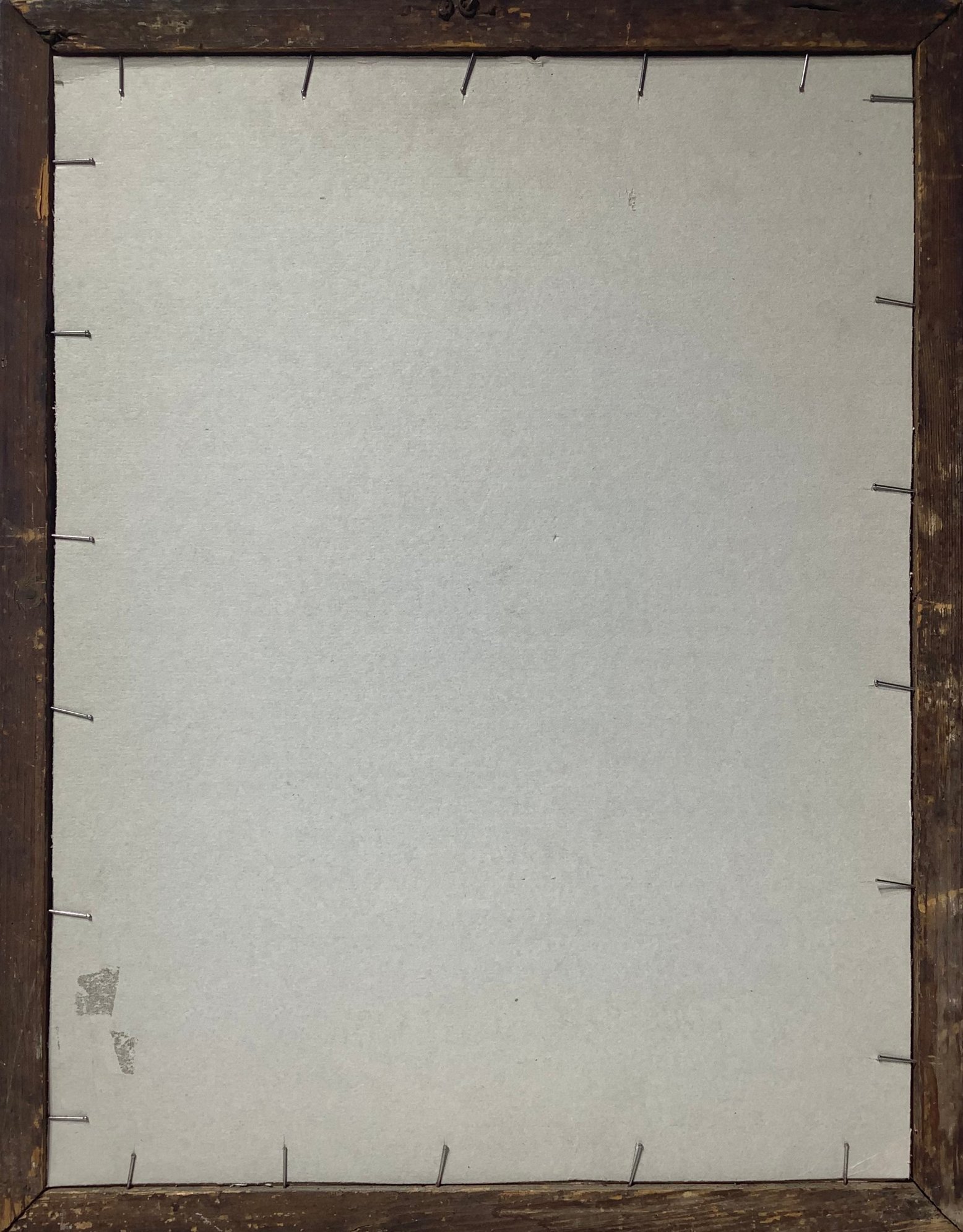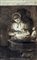 Disegno di autore ignoto raffigurante donna con gatto che si scalda. Disegno su carta a inchiostro marrone. Mm 270x172, con cornice 465x365. Datato in testa Catania 1873.