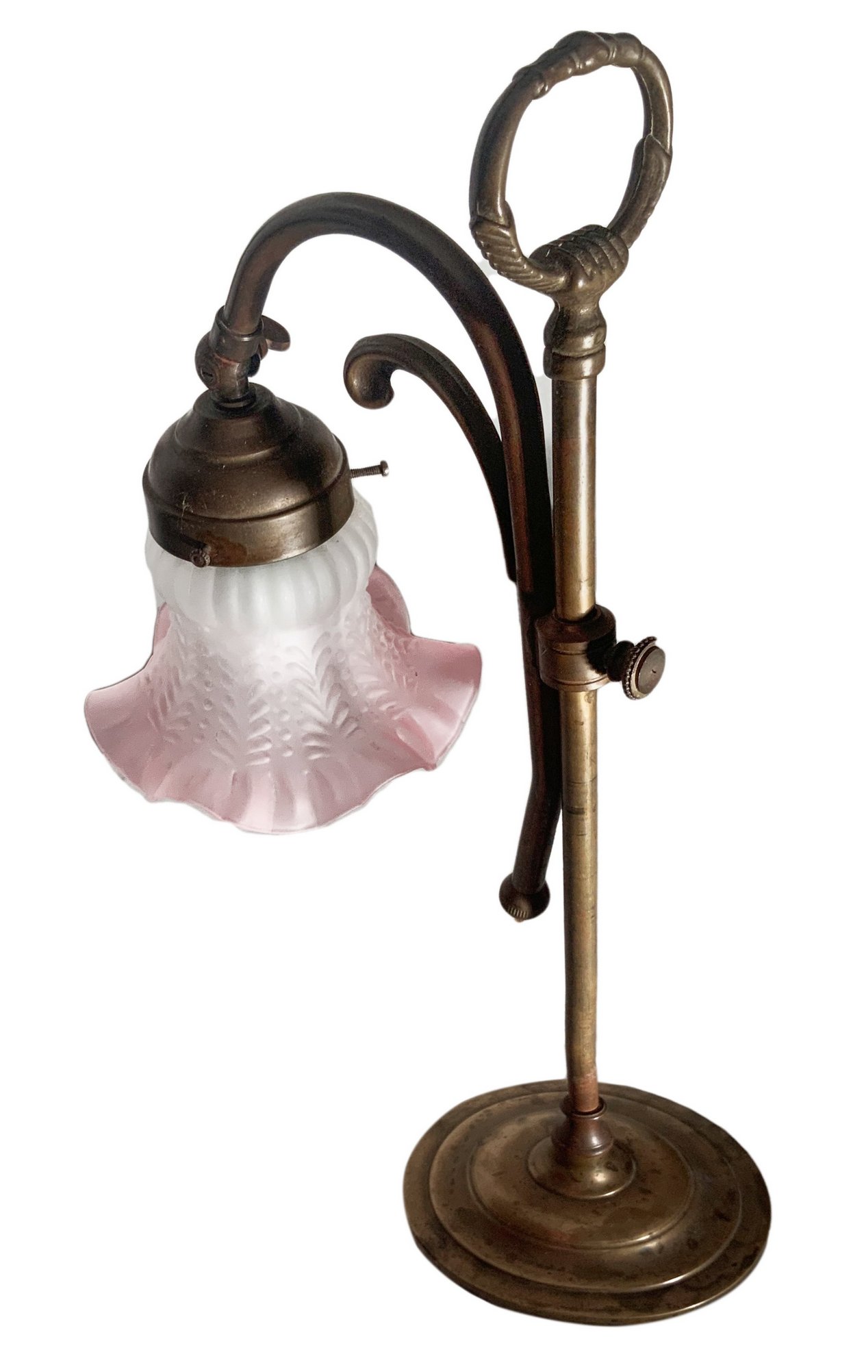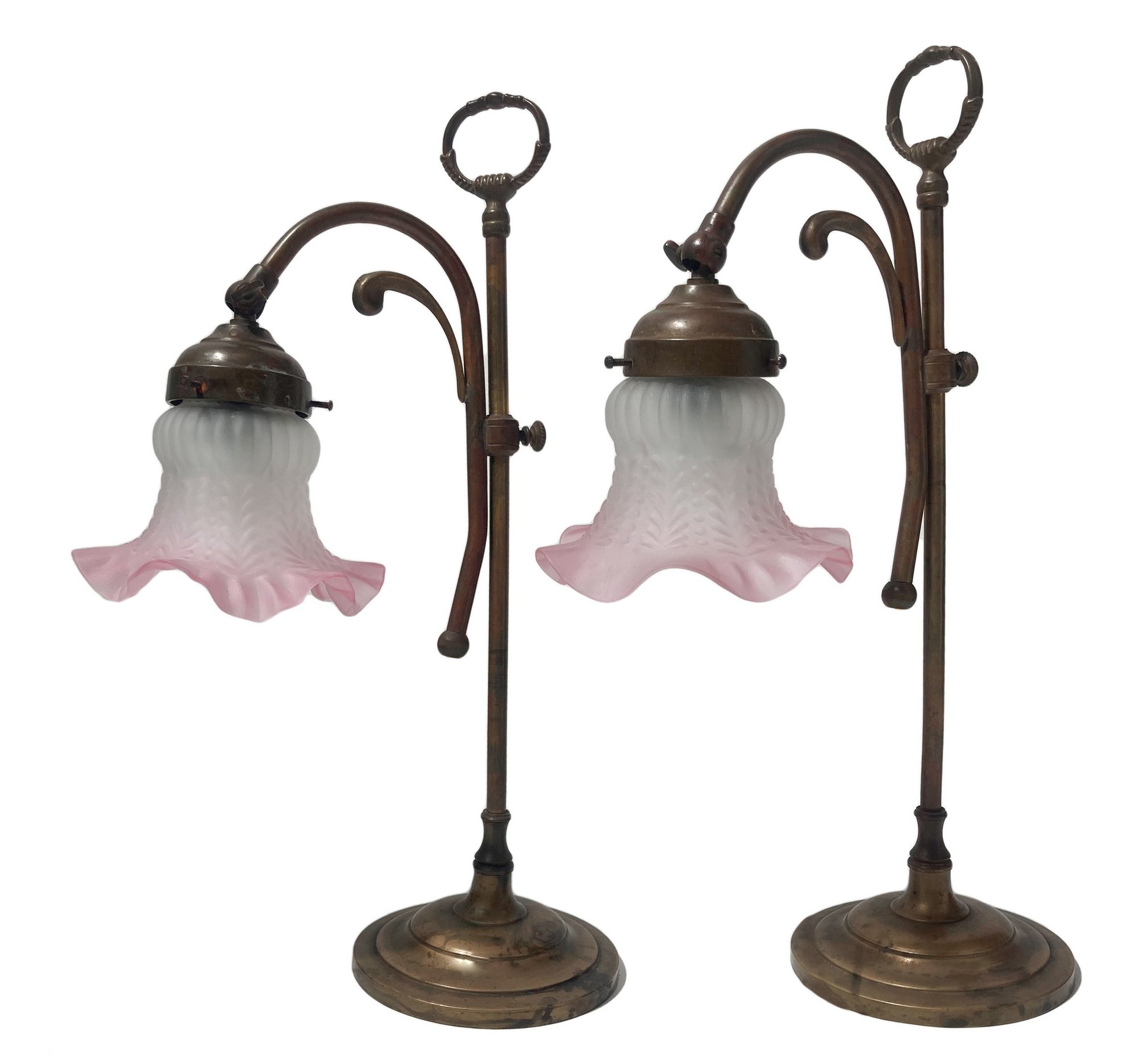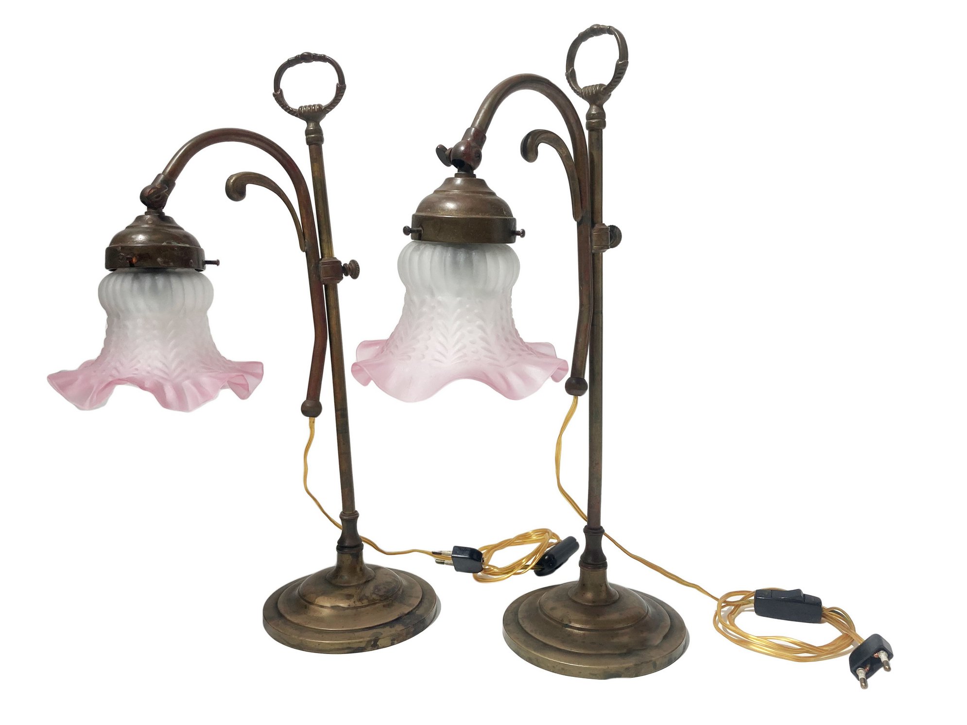Coppia di Abat jour in ottone con campana a tulipano in vetro rosa, fine XIX secolo. H cm 44