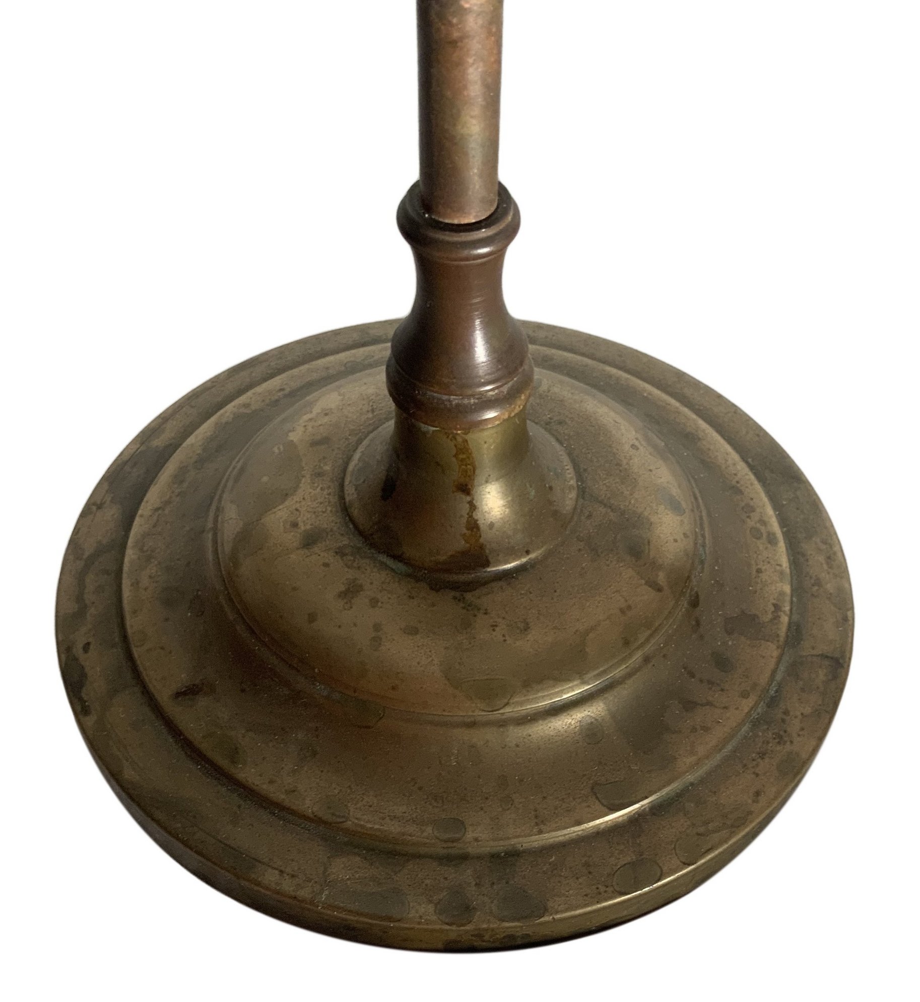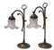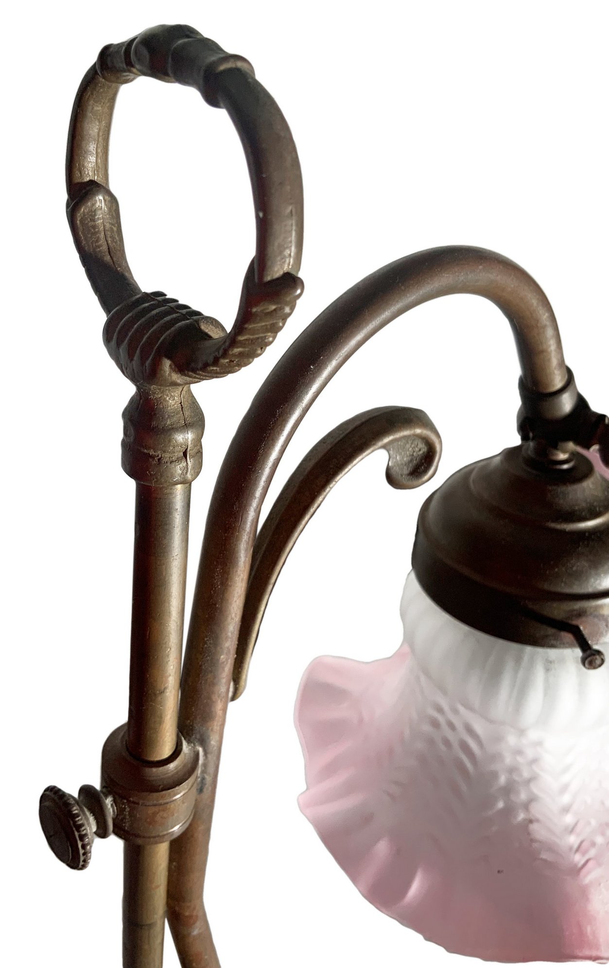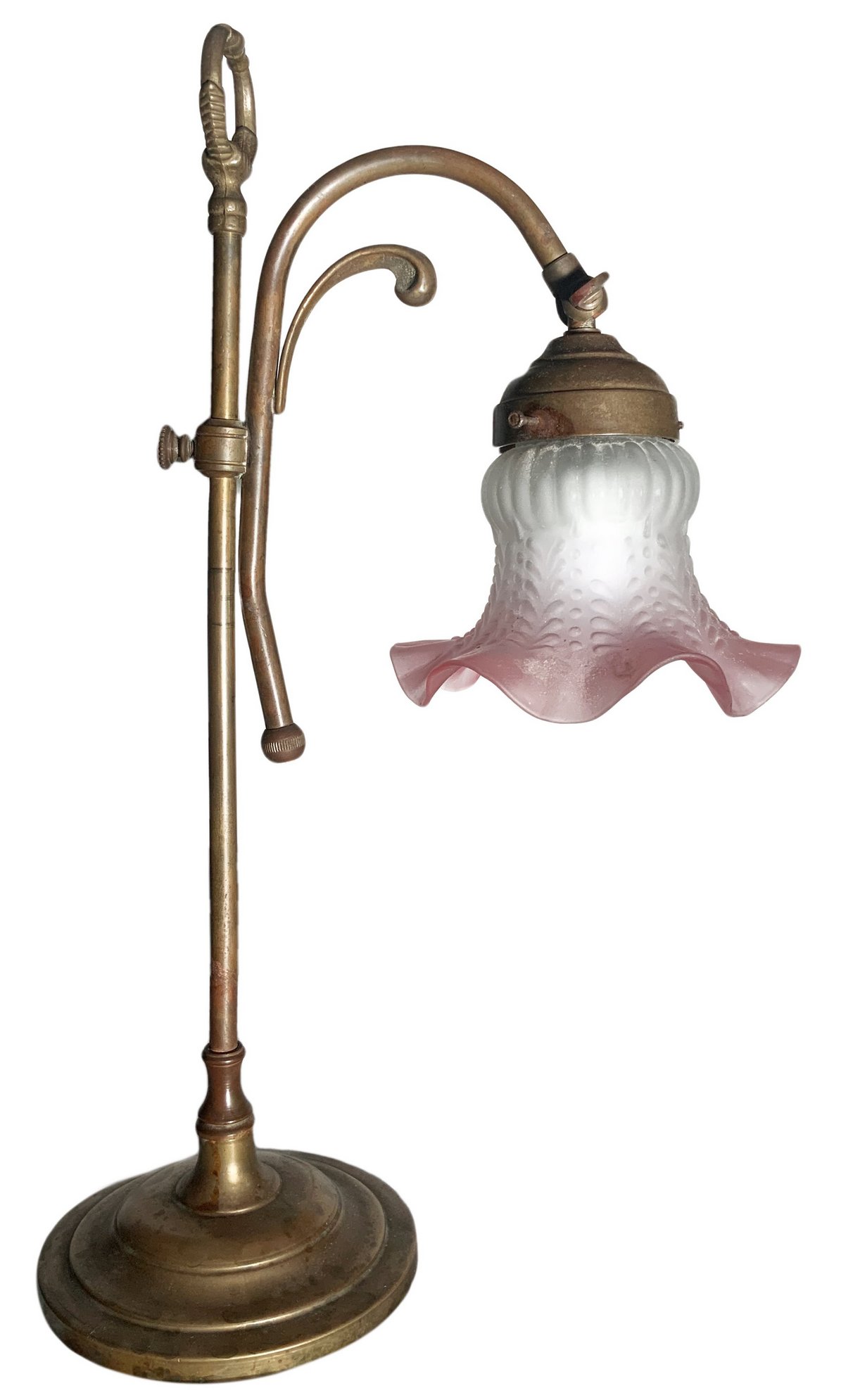 Coppia di Abat jour in ottone con campana a tulipano in vetro rosa, fine XIX secolo. H cm 44