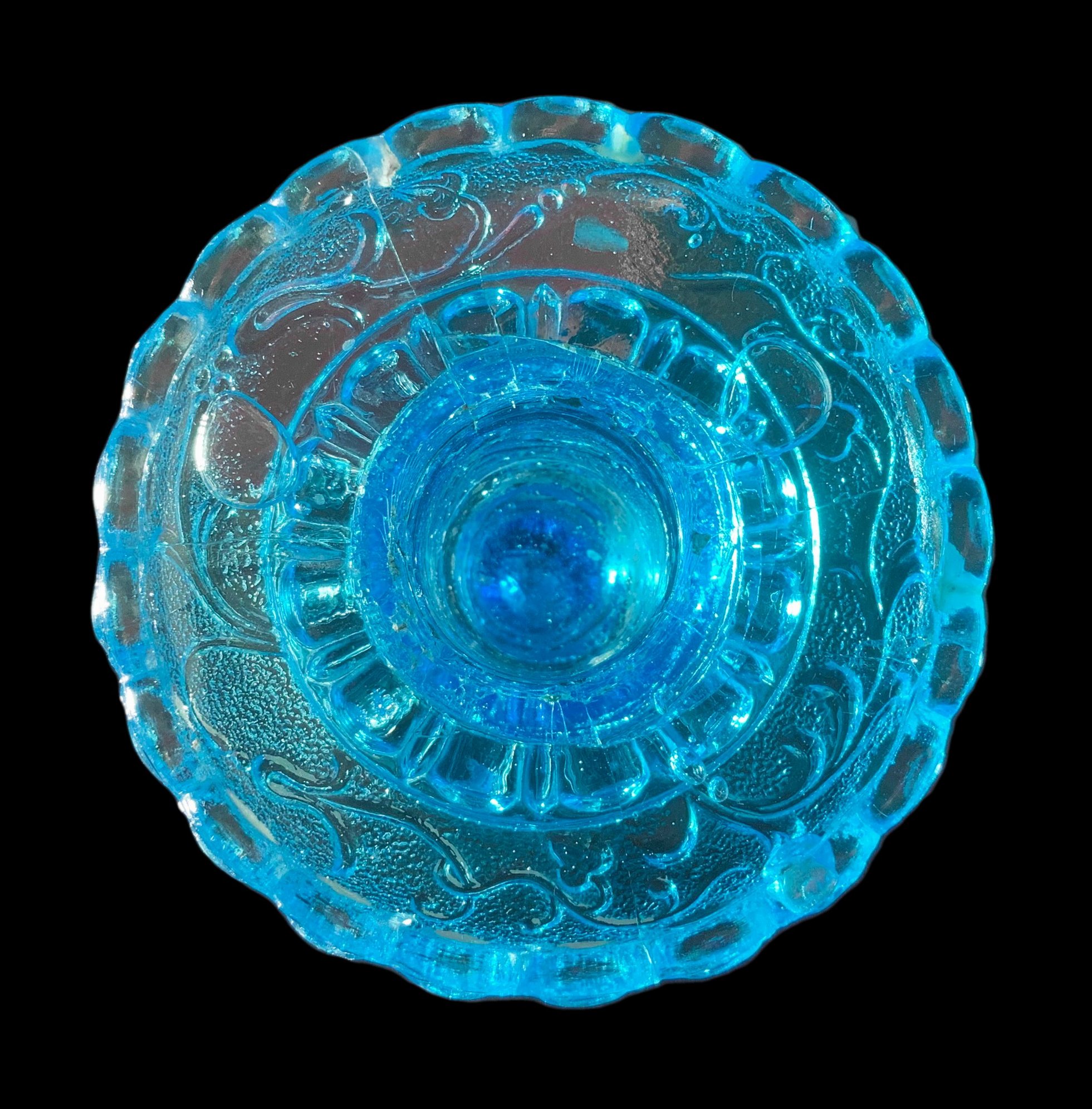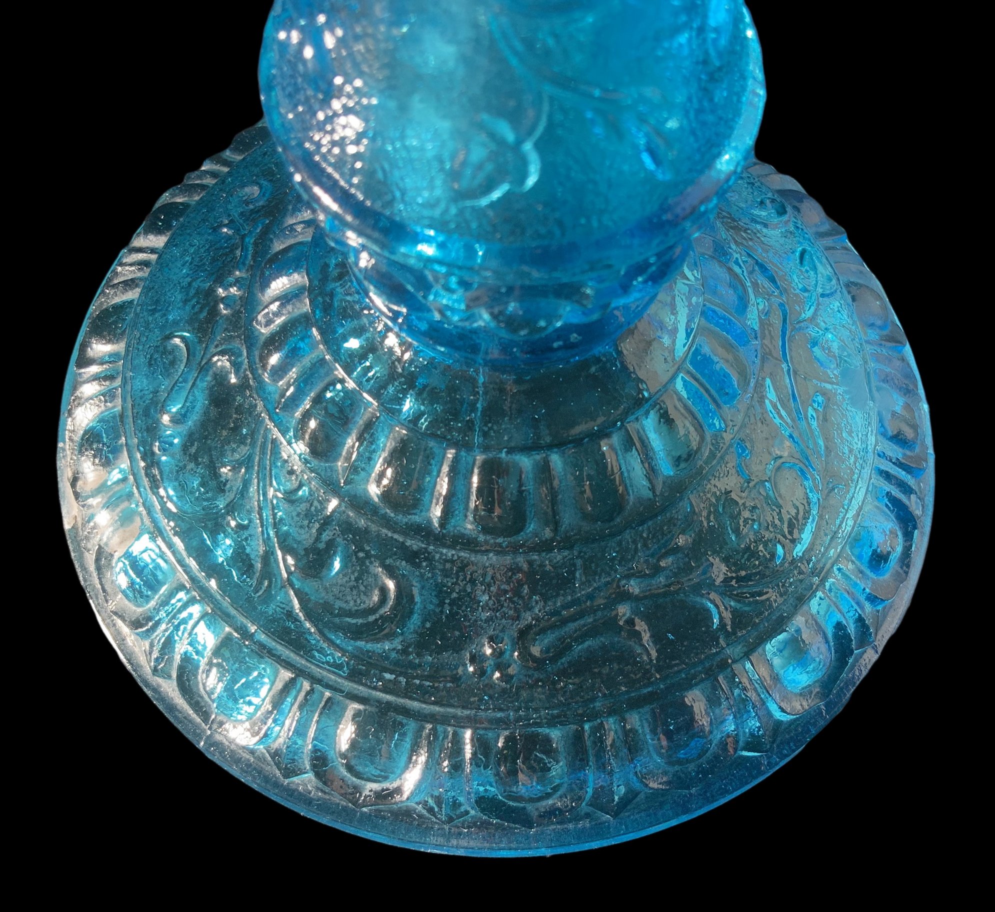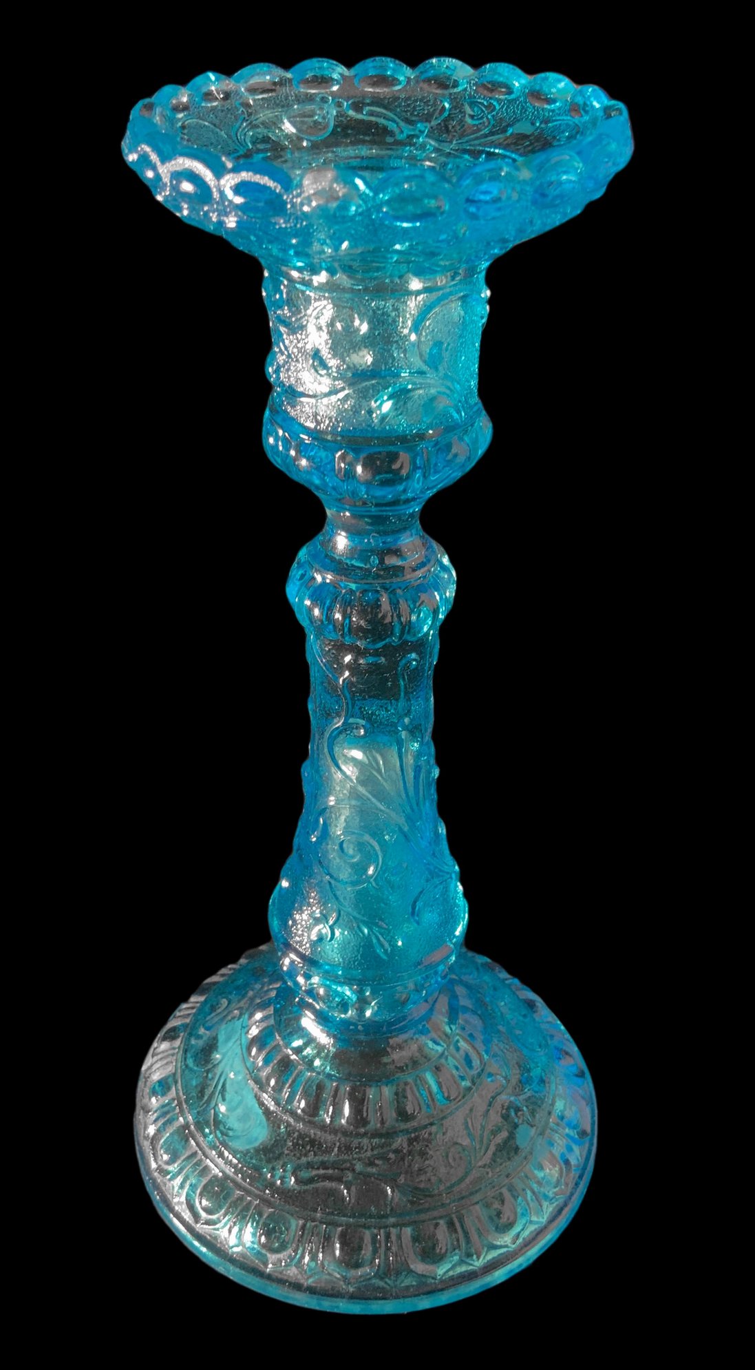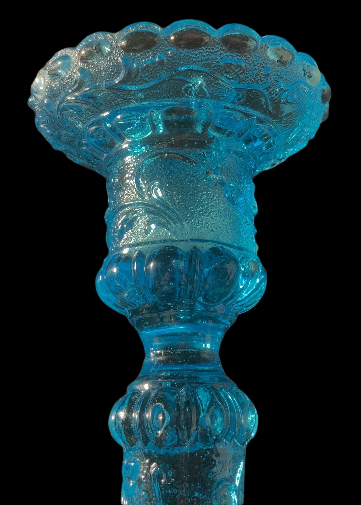 Candeliere monoforo in vetro azzurro, XX secolo. H cm 24.