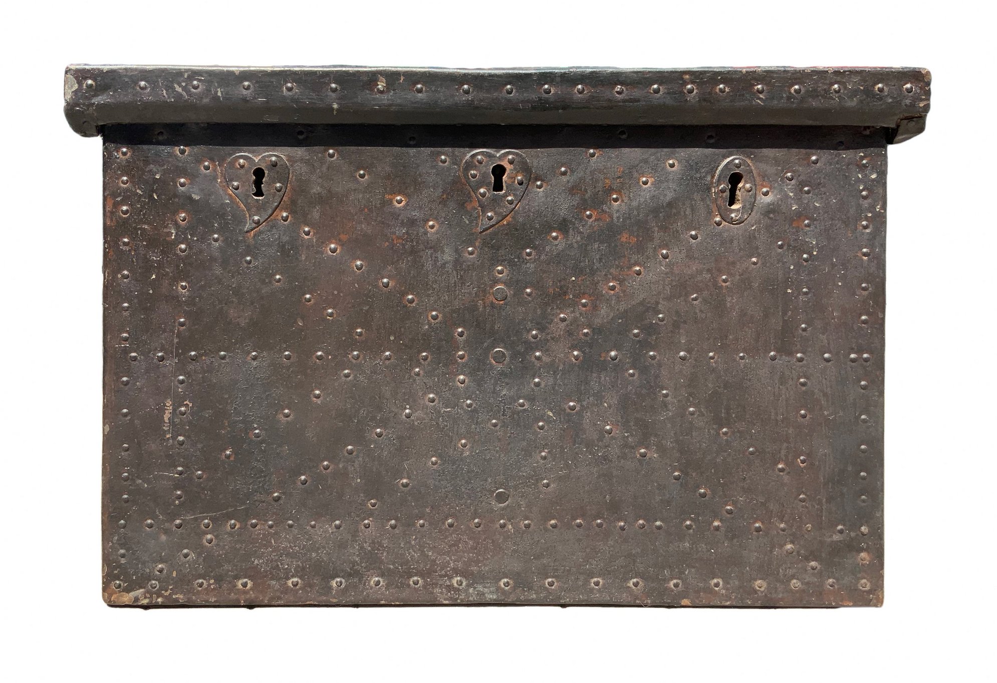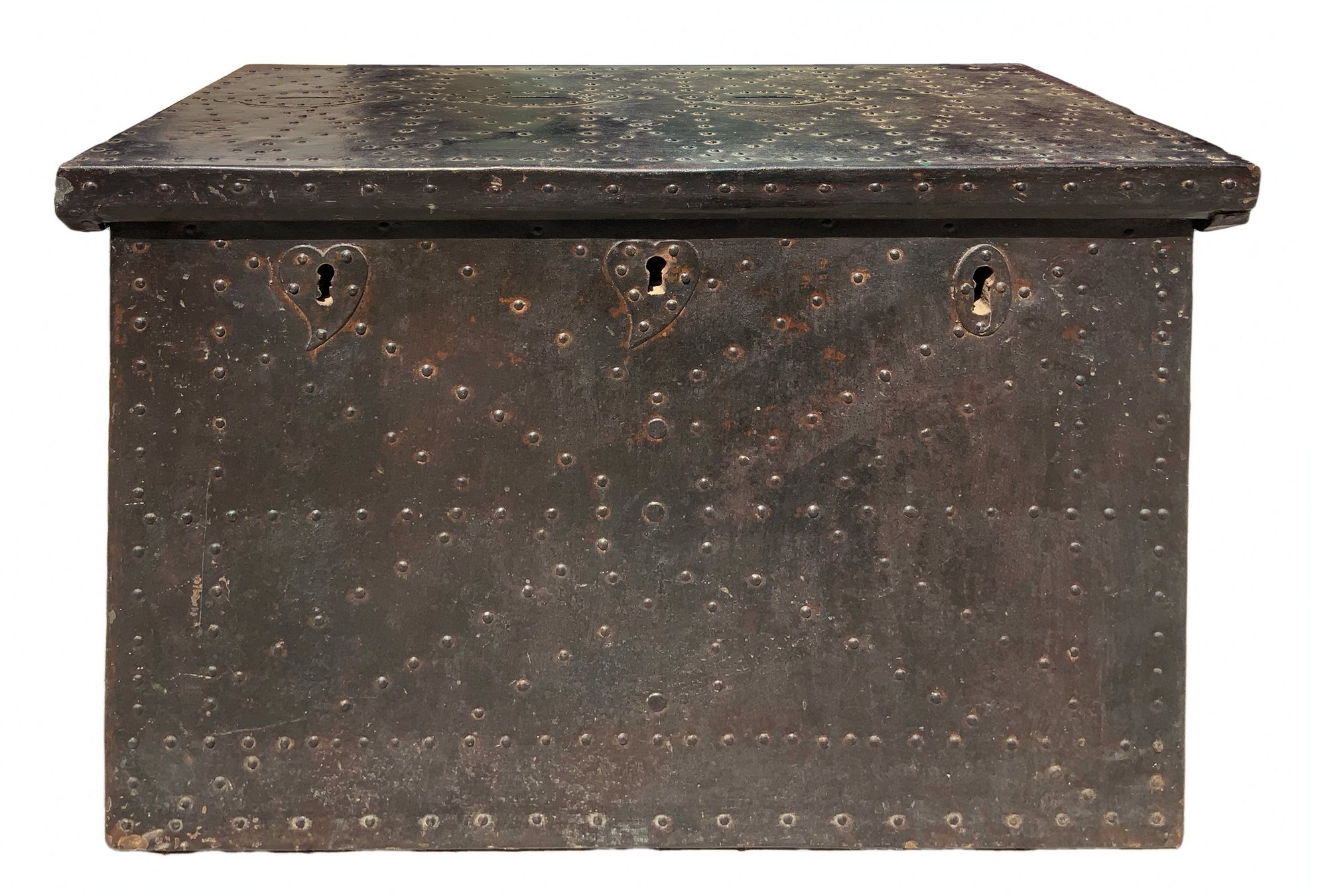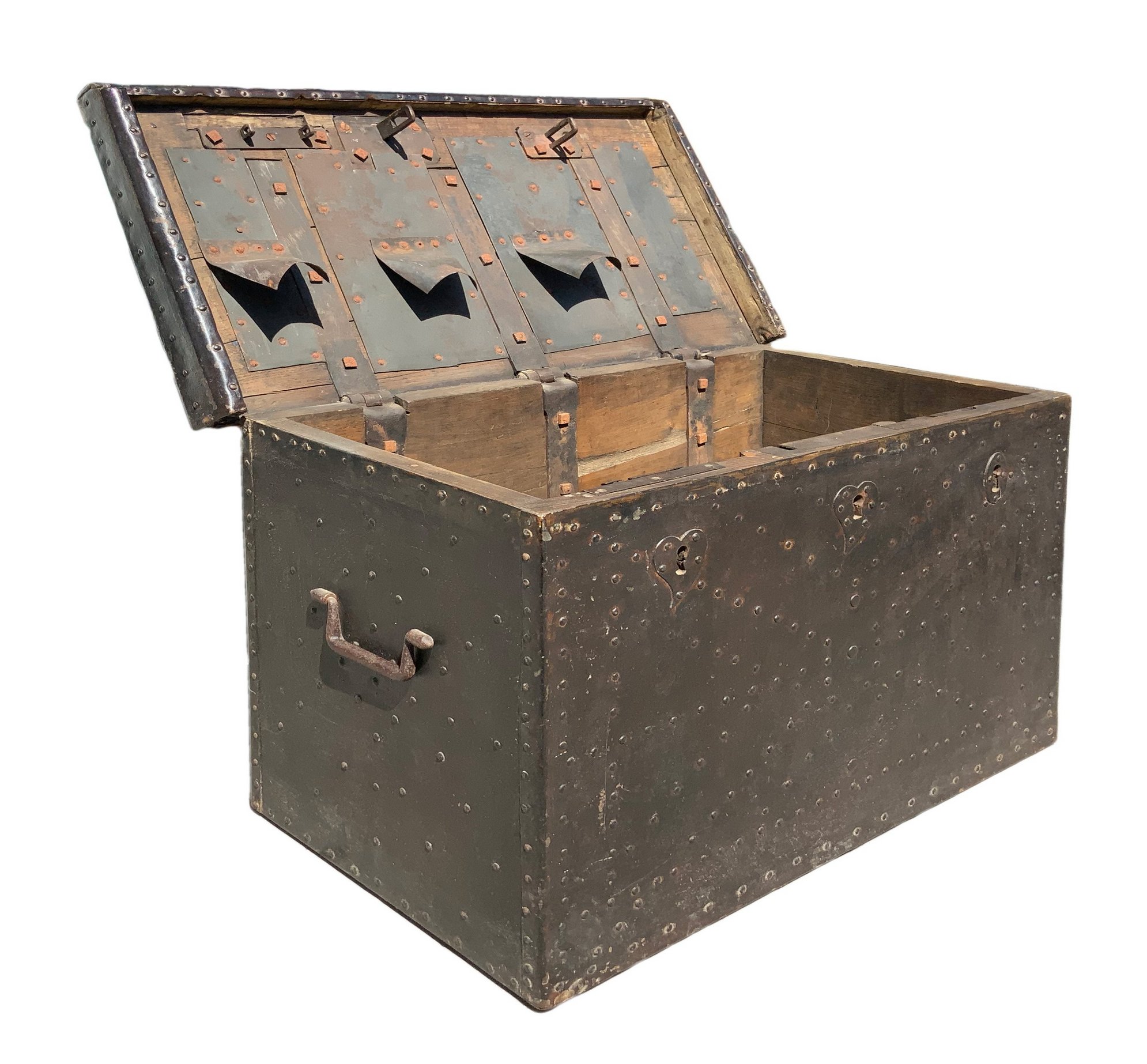 Forziere da viaggio a forma di cassa, bordo di legno rifoderato in ferro borchiato, XVII secolo. H cm 53. Cm 81x47.
