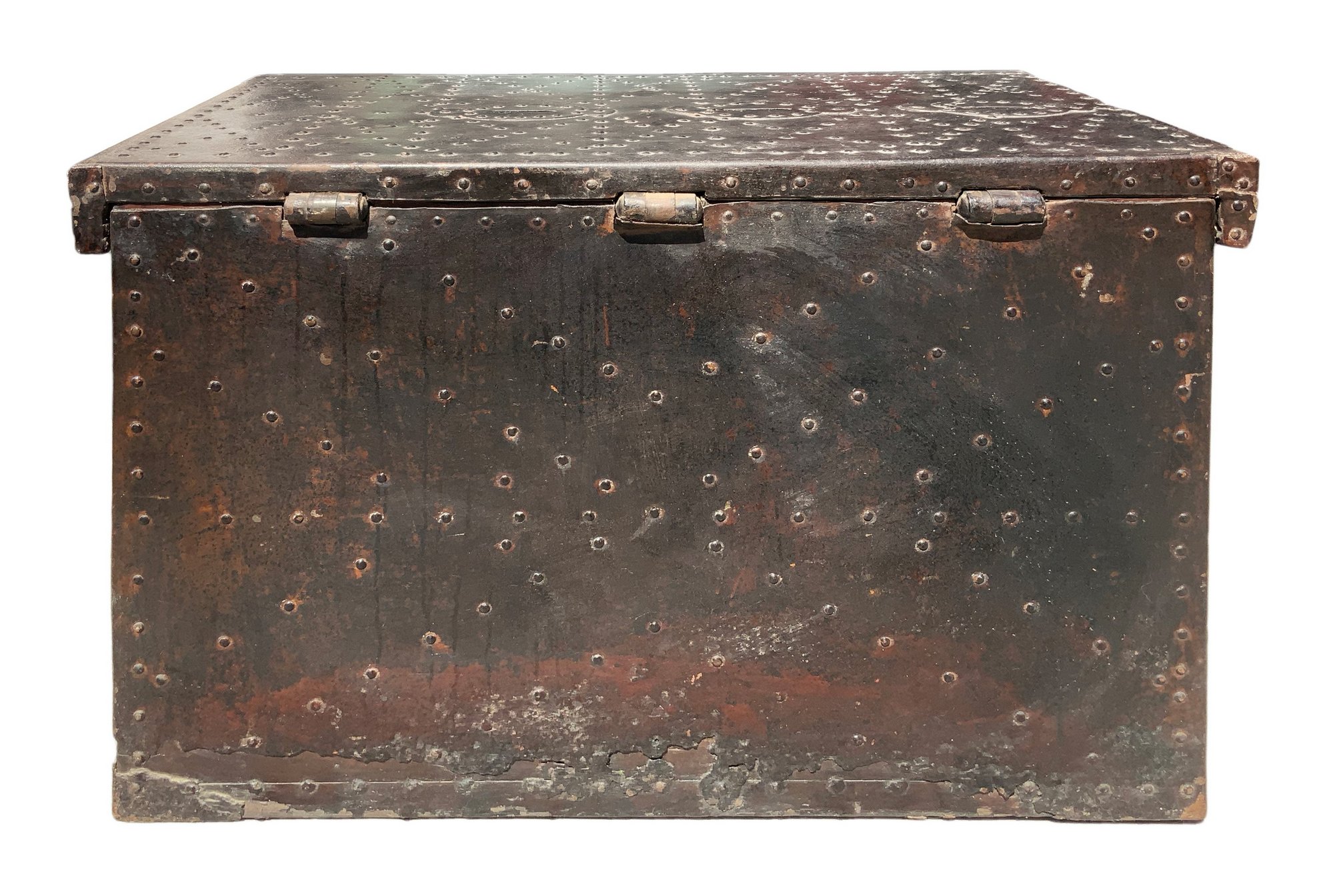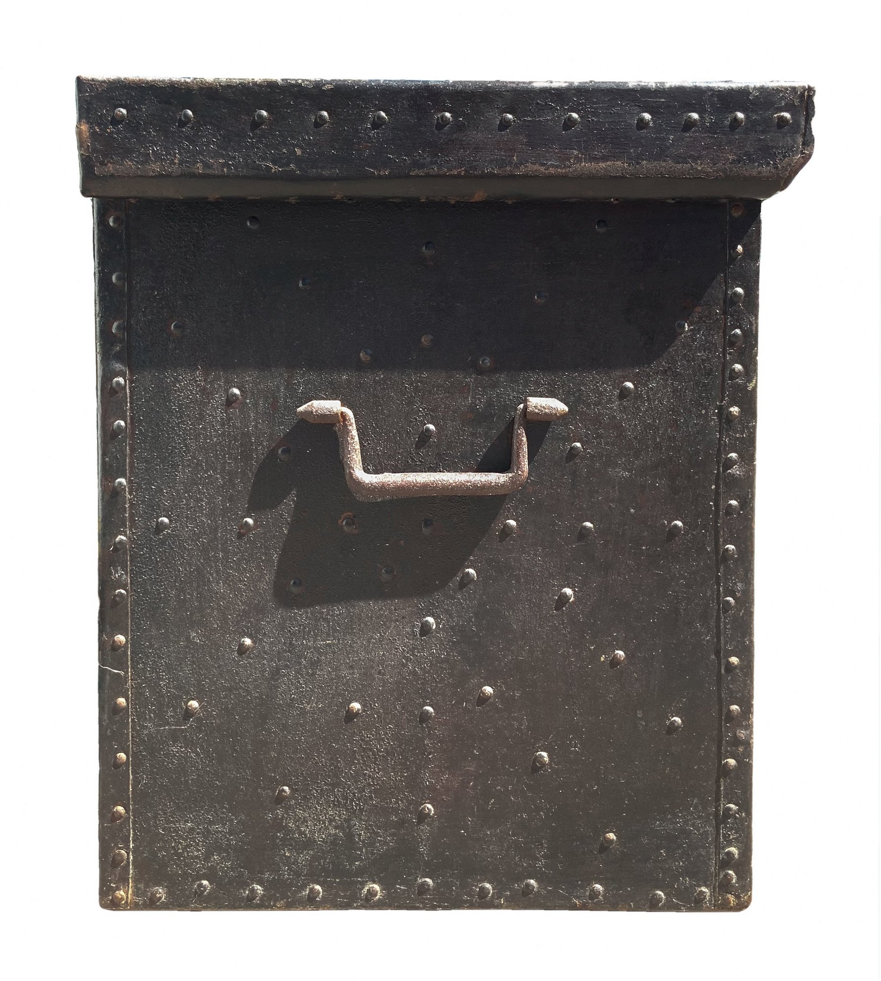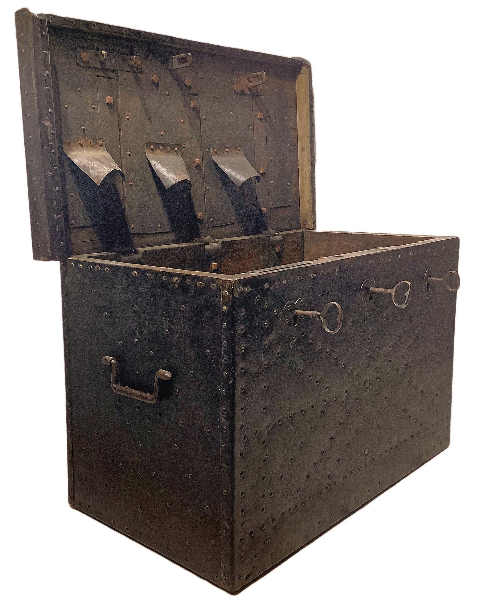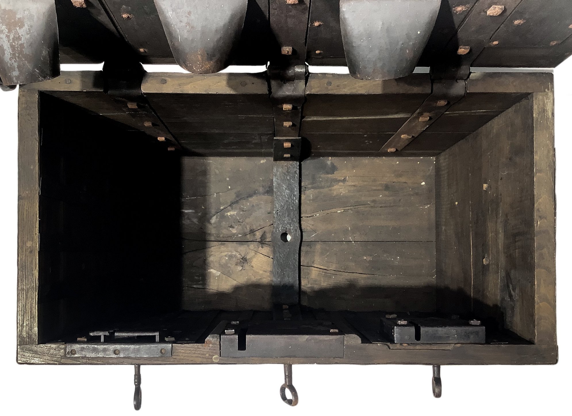 Forziere da viaggio a forma di cassa, bordo di legno rifoderato in ferro borchiato, XVII secolo. H cm 53. Cm 81x47.