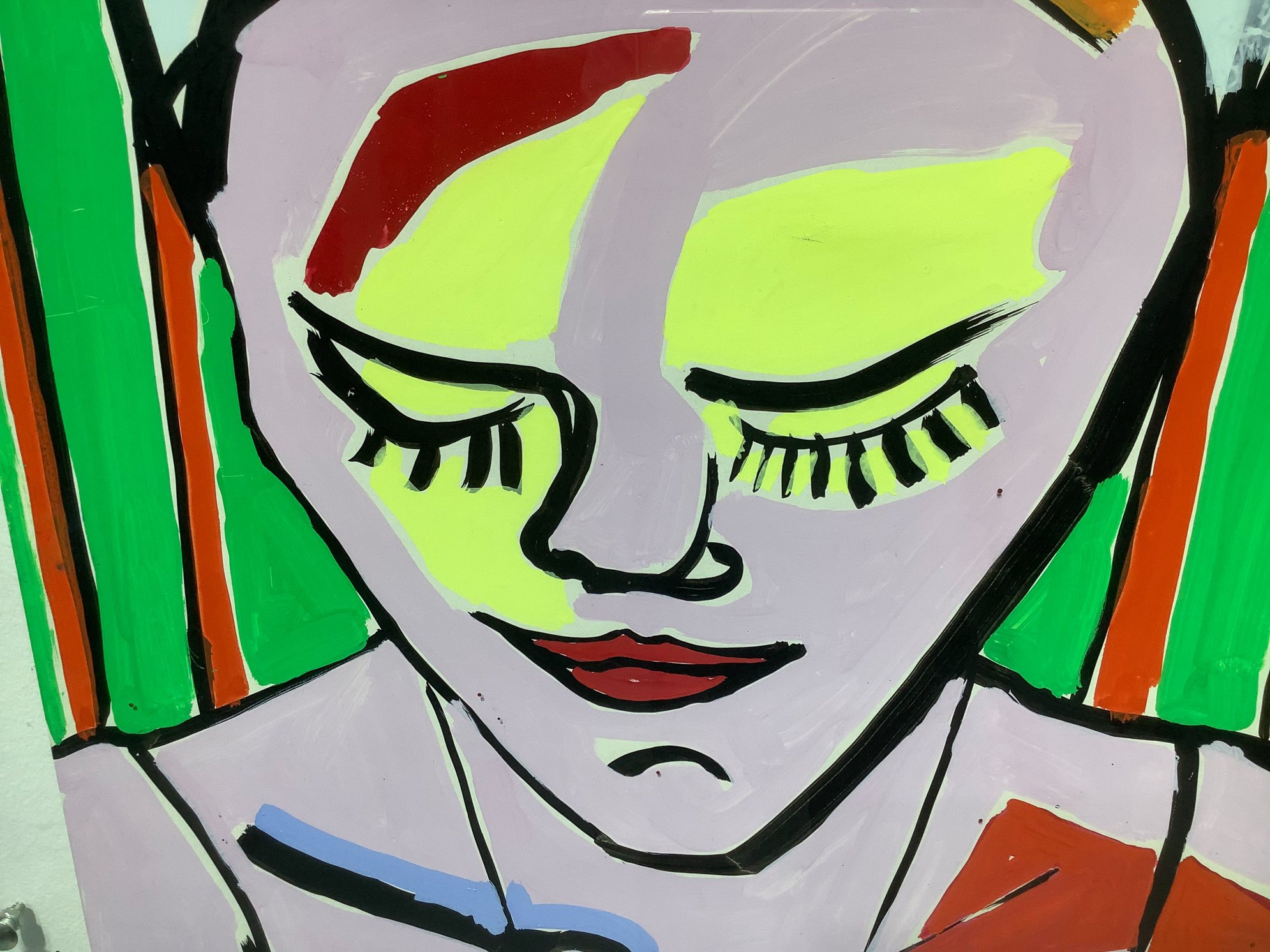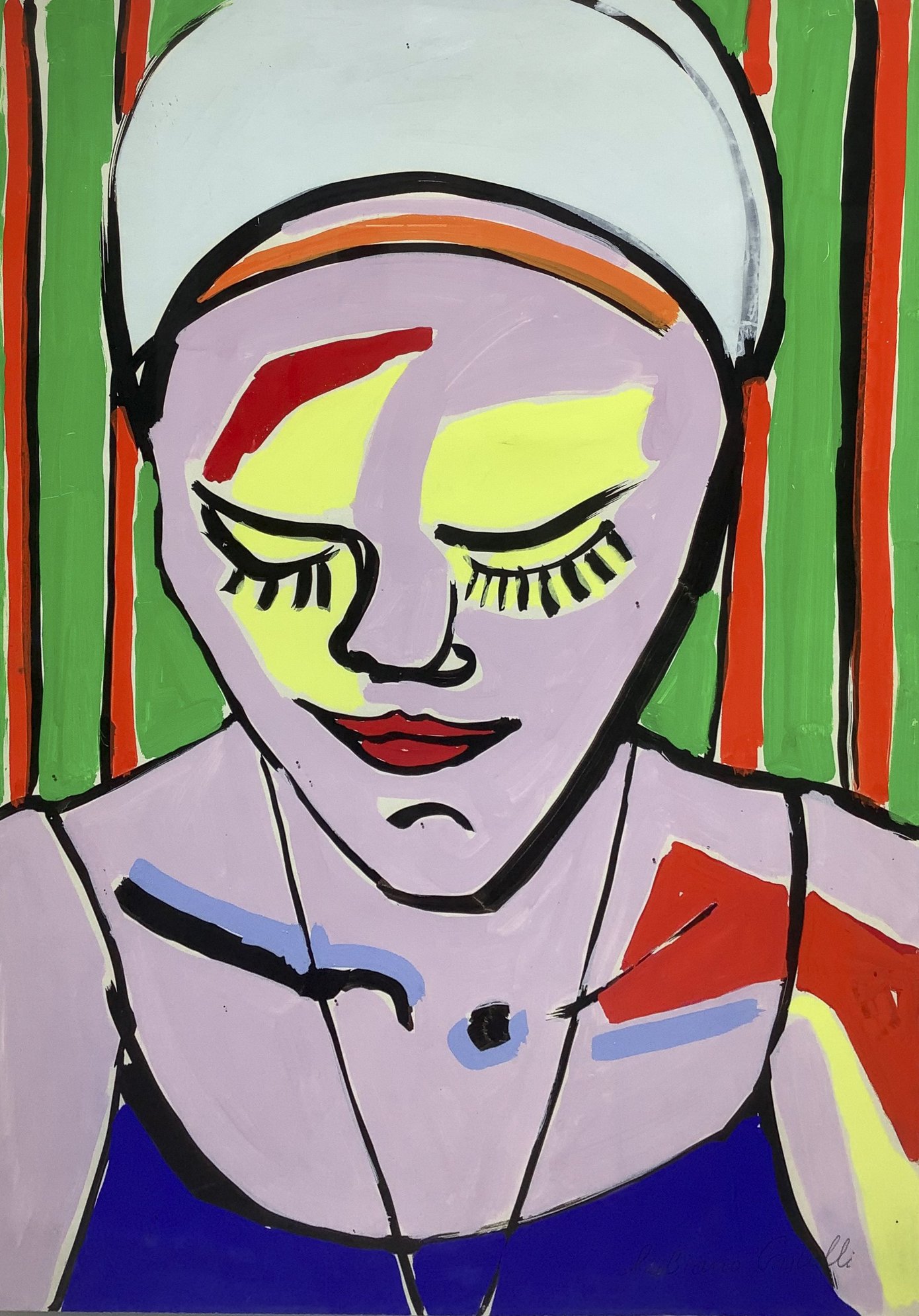 Acrilico su cartoncino Donna con collana che chiude gli occhi, Luciano Castelli (1951, Lucerna, Svizzera). Cm71x51. Firmato in basso a destra. "Uno dei più importanti artisti della Bohémien di Lucerna degli anni 70. La produzione artistica di Castelli è vastissima e variegata, e spazia tra la fotografia, la grafica e la pittura, considerato uno dei rappresentanti della pittura neo-espressionista. Dal 78 al 90 si trasferisce a Berlino, e divenne uno dei "Junge Wilde ", un importante movimento artistico neo-espressionista. Negli anni successivi, l'artista sperimenta nuove tecniche pittoriche tramite l'utilizzo di una camera oscura fatta in casa, sviluppa i dipinti rotanti, che possono essere ruotati fino a 360°. A seconda di come sono appesi, il dipinto mostra allo spettatore nuovi volti, corpi o vedute di città. Nelle opere di Castelli vengono rappresentati momenti intimi e personali che l'artista riporta tramite colori accesi e contrastanti, tipici della sua pittura. Il dipinto in questione, battuto all'asta nel 2006 dalla Metropol, una casa d'asta Svedese. Mostra l'uso di una cromia a tratti psichedelici, in contrasto con il tratto nero del pennello, che con decisione delinea la figura del volto raffigurato. Questo espediente pittorico è utilizzato per enfatizzare l'intensità del momento, e alterare la percezione dello spettatore."