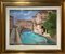 Dipinto ad olio su tela raffigurante paesaggio fluviale e ponte di porta...