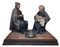 Statuetta raffigurante gruppo di due personaggi anziani e neonato, soggetti popolari siciliani in abiti in tessuto, testa, mani, piedi in terracotta, XX secolo, Sicilia. H cm 25. Cm 31x19. Base in legno. Firmato alla base Beppe Buzzetta.