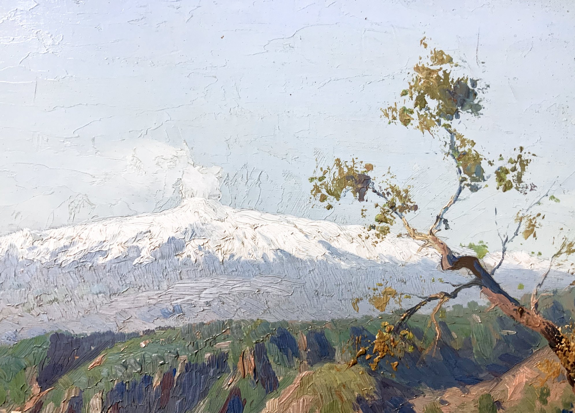 Dipinto ad olio su tela raffigurante veduta dell'Etna da Taormina, Mario Mirabella (Palermo 1870-1931). Cm 23x37, olio su tela