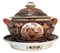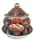 Zuppiera in porcellana cinese con piatto da portata, fondo nero decorazione in colore arancio. Inizi XX secolo. H cm 25. Larghezza cm 35.