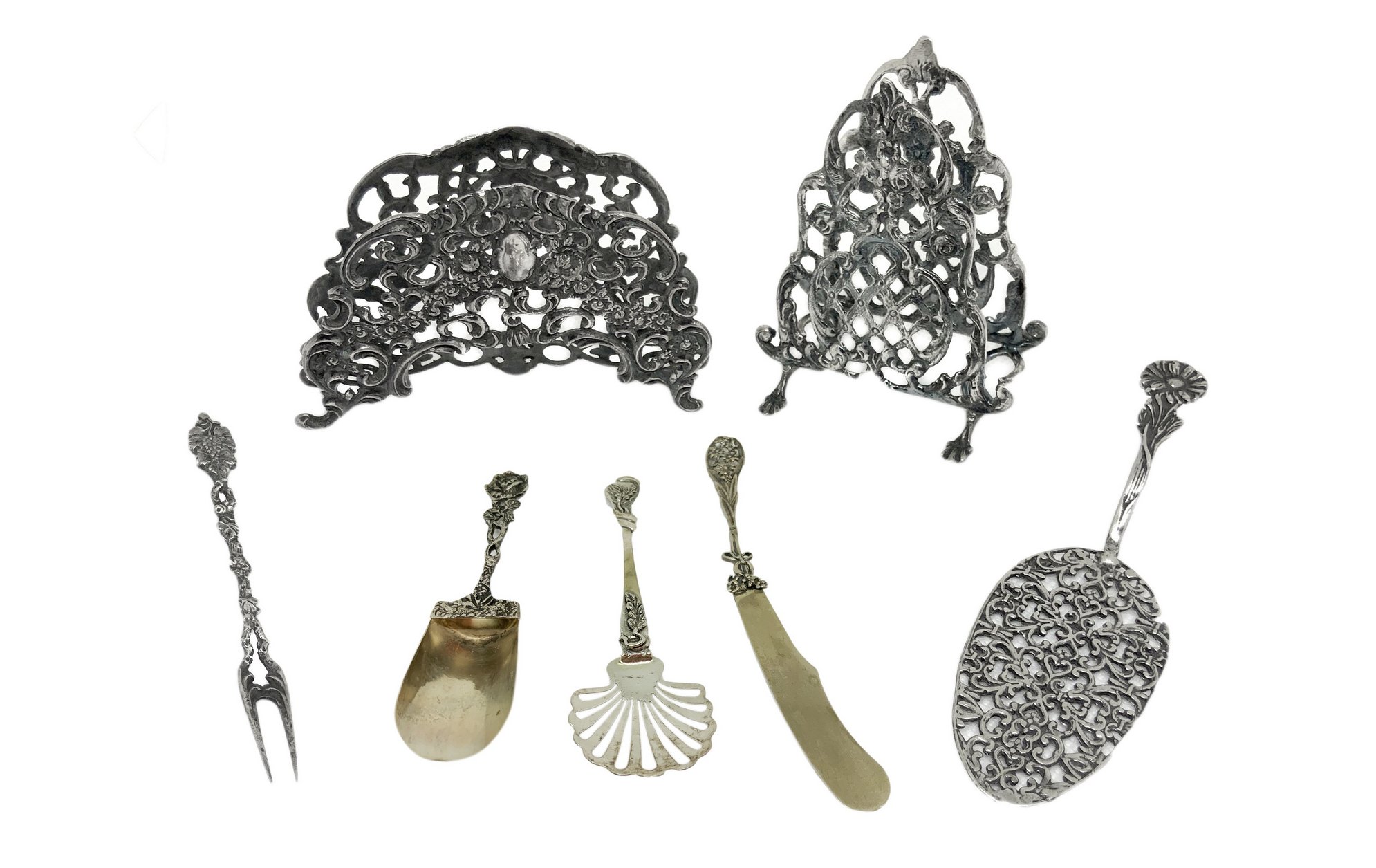 Gruppo in argento 800 composto da portatovaglioli e piccole posate da portata. Gr 210