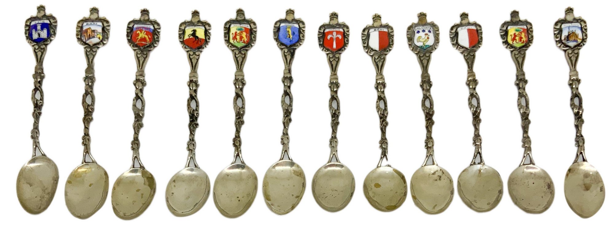 12 cucchiaini in argento 800, con smalti raffiuranti stemmi di città...