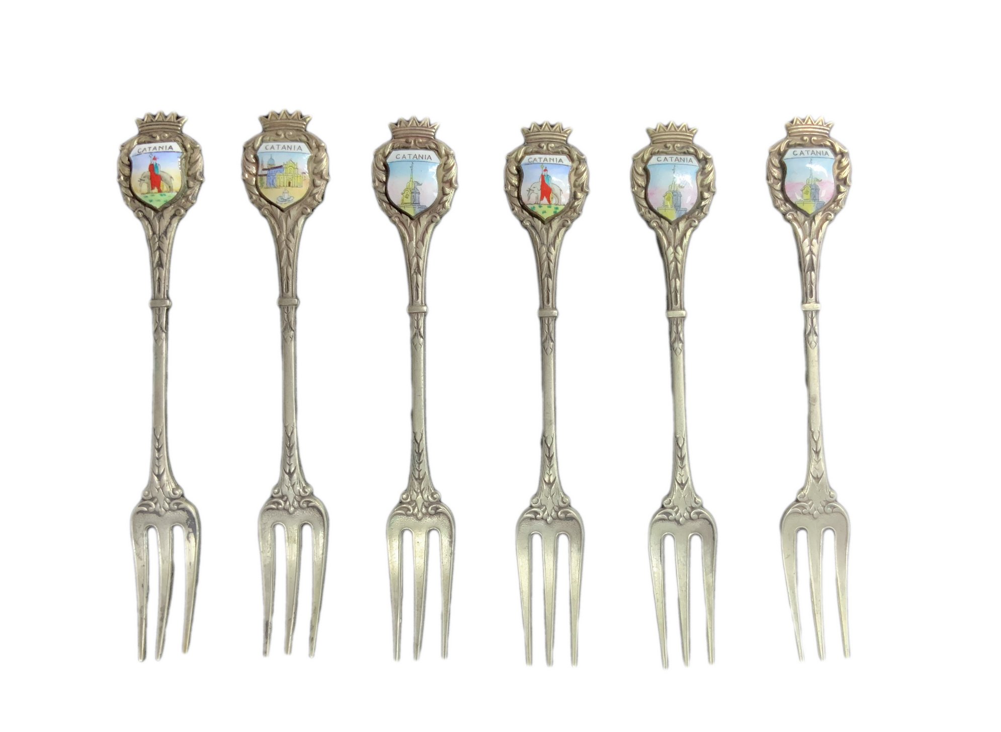 6 forchettine in argento 800 con smalti raffiguranti simboli della città di Catania. H cm 11.
