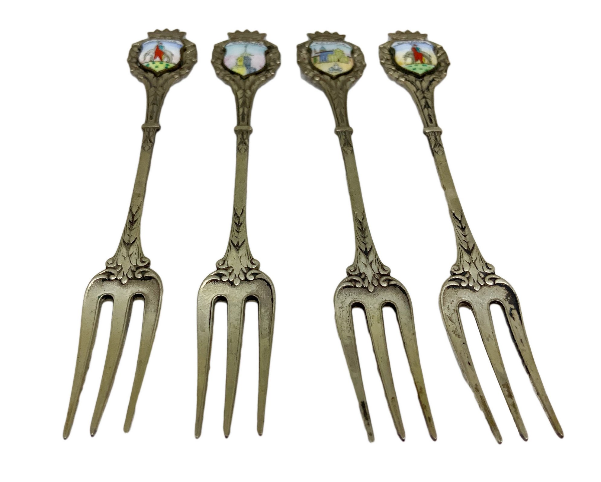 6 forchettine in argento 800 con smalti raffiguranti simboli della città di...