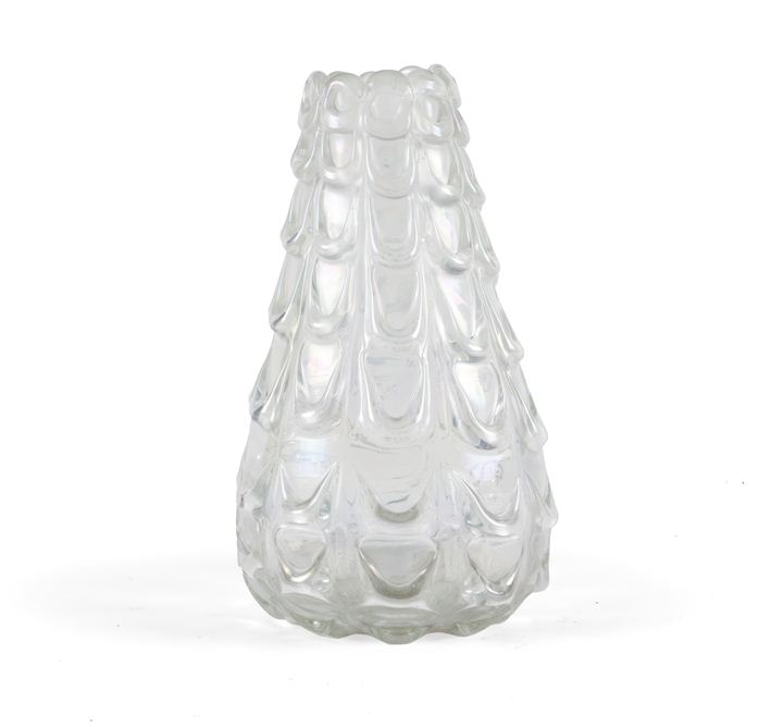 Vaso in vetro fortemente iridato con applicazione a caldo di decorazione a forma di festoni.
