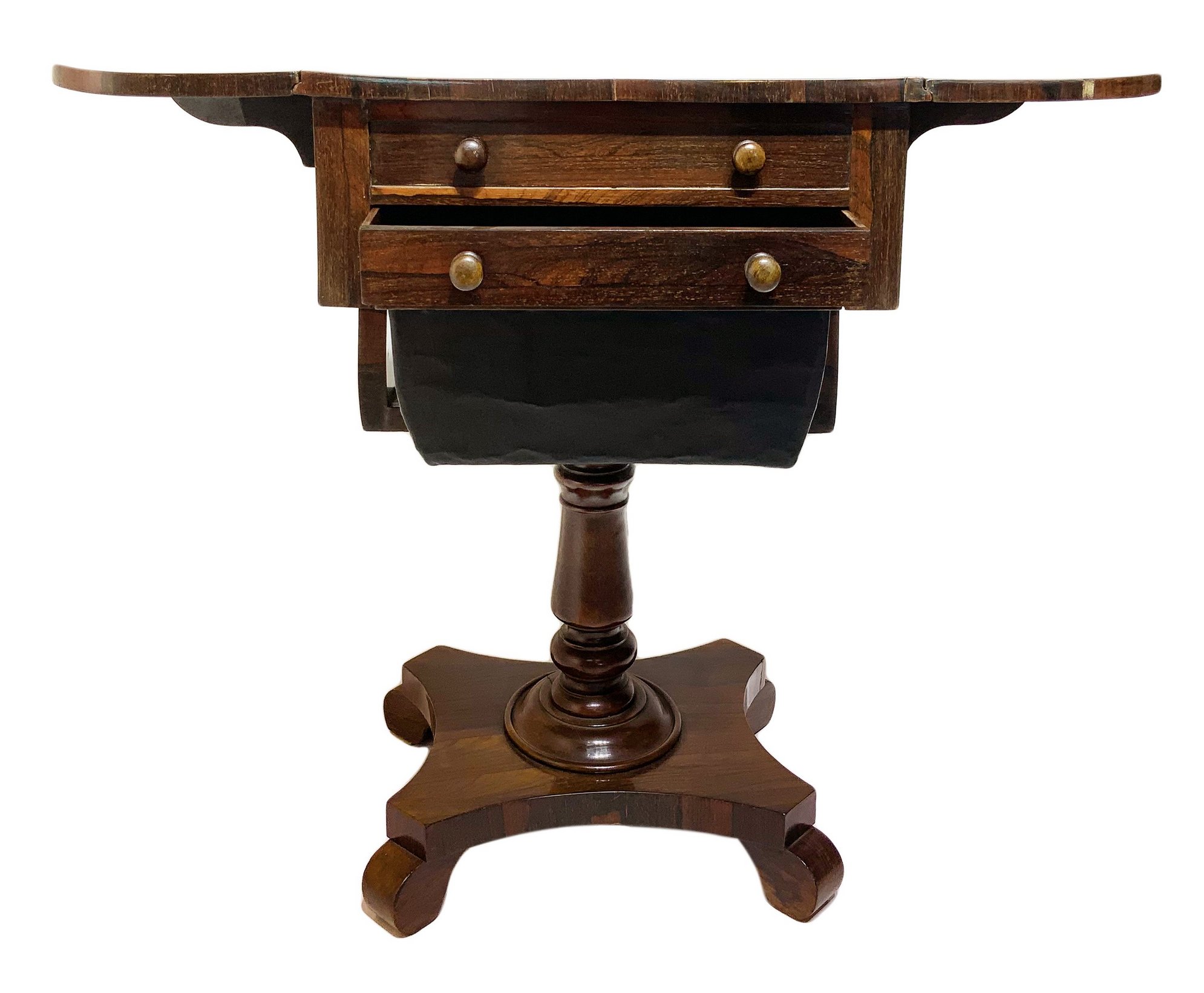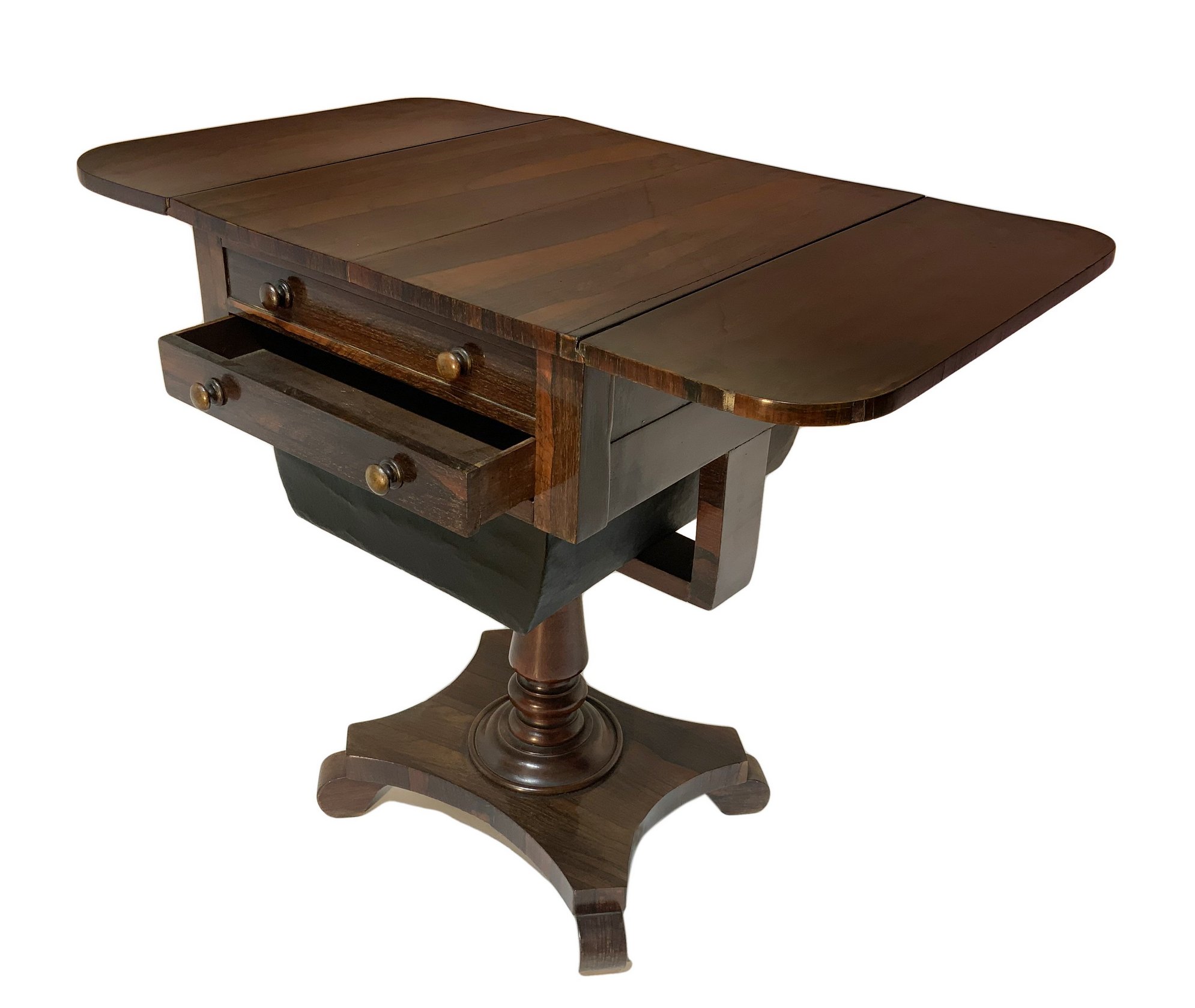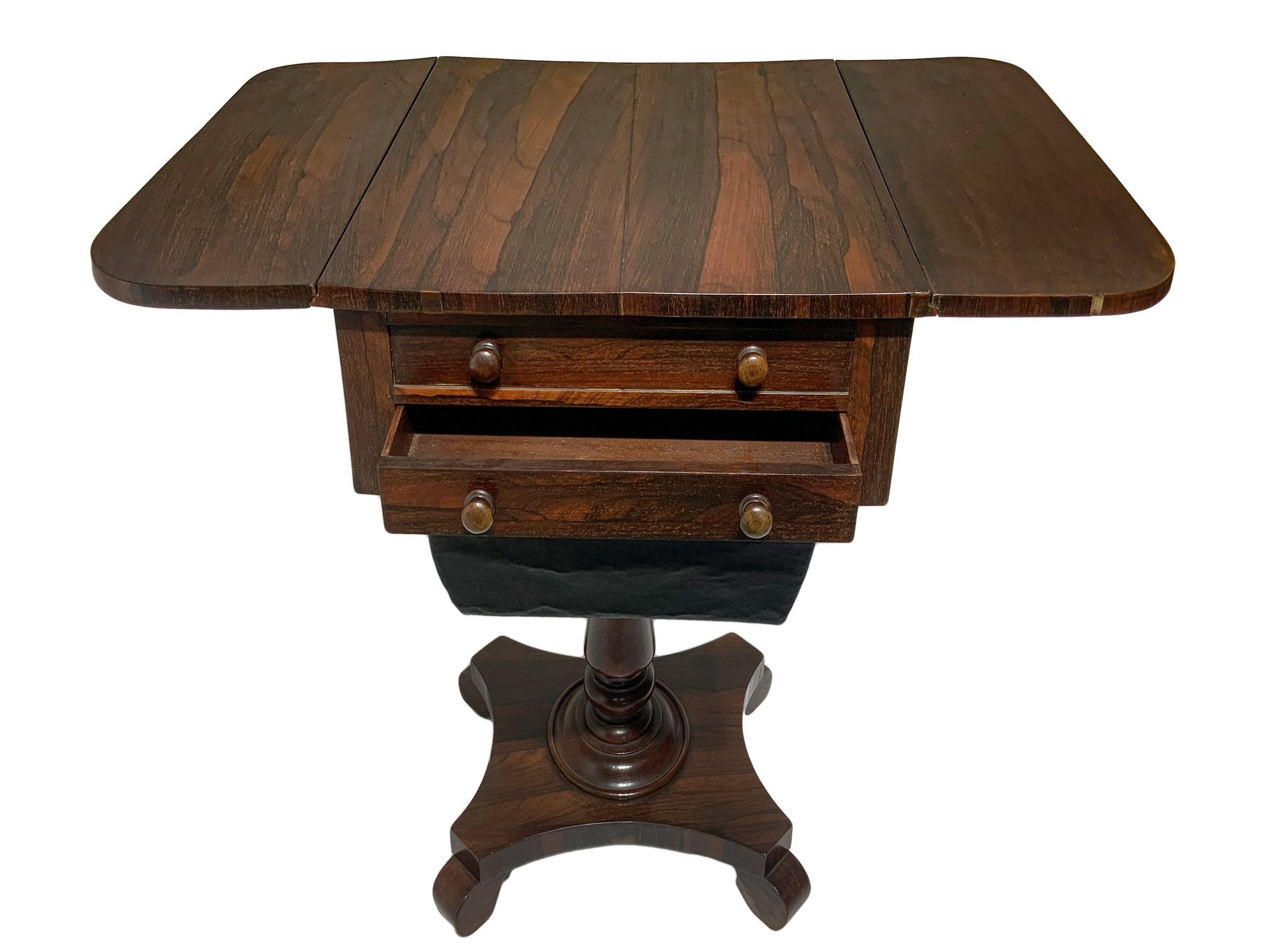 Tavolino a bandelli in legno di palissandro, piede a quattro razze, fine XIX secolo. Cassetti sul fronte. H cm 74xcm 47x52. Con bandelli aperti cm 85x52.