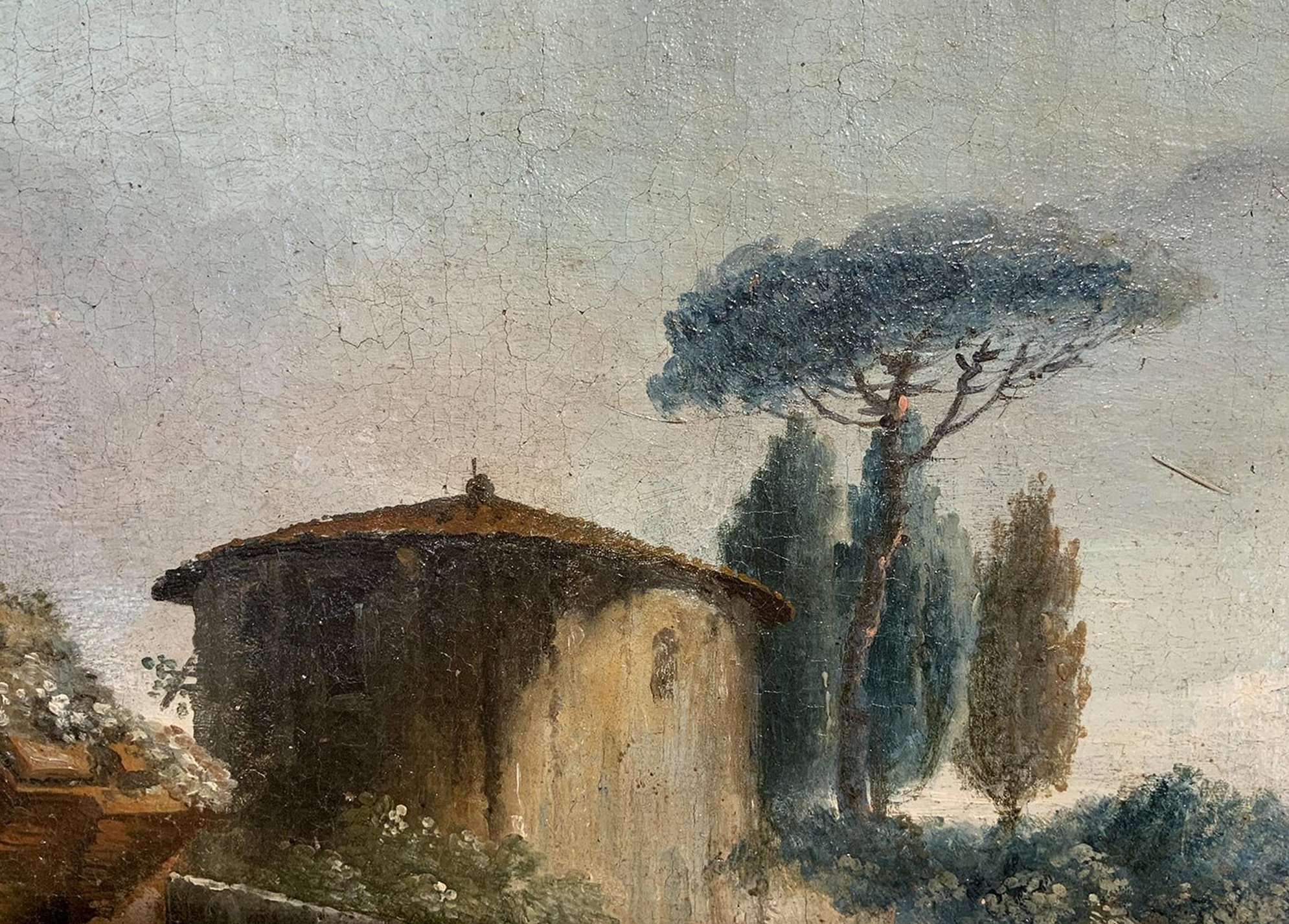 Dipinto ad olio su tela raffigurante veduta del Tevere a carattere archeologico con personaggi, Andrea Locatelli (Roma 1693-1741), attribuito. Da collezione privata. Cm 56x110. "Pittore di paesaggi contribuì a rappresentare la campagna romana, quale espressione di un ideale di vita pastorale, ispirazione di una nuova cultura che si differenzia e si diffonde per tutto il secolo XVIII in risposta al Barocco, ritenuto causa di disordini e cattivo gusto. In sintonia con i principi elaborati nell'ambito accademico dell'Arcadia si ripristina anche pittoricamente un equilibrio tra natura-ragione, intelletto e fantasia immaginifica (ut pictura poesis-Quinto Orazio Flacco). Il dipinto, frutto ed espressione dei tempi che vive il pittore, mostra un taglio prospettico assai raro del Tevere, raffigura un locus amoenus, una natura che è indice di una esistenza pacifica e serena, fuori dal tempo, finalizzata a una quiete stabile e tranquilla. Un fermo immagine di un momento idilliaco fissato nella sua temporalità esistenziale. Pittoricamente la tela assume un registro equilibrato, dove gli spazi misurati sono in perfetta armonia con con il verde paesaggistico in materia densa ma precisa. Tutto questo impianto scenico di memoria dughettiana sicuramente deriva da un ductus comune e consono agli artisti del suo tempo quali Paolo Anesi (Roma 1697.1773) o Paolo Monaldi (Roma 1710-1779). La sua opera è il prodotto di una cultura dai precisi riferimenti letterari e filosofici dei circoli Arcadici a lui contemporanei." STUDIO ASOR