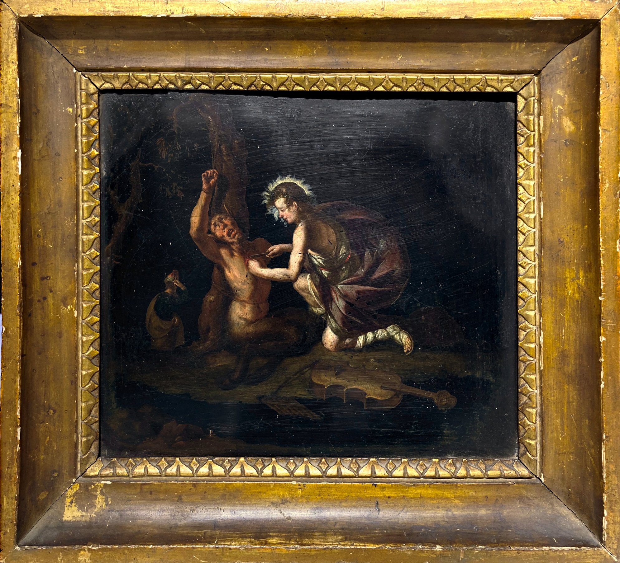Dipinto ad olio su ardesia, raffigurante Apollo che scuoia Marsia, attribuito a Piero di Cosimo (Firenze, 1461 circa – Firenze, 12 aprile 1522). Cm 29x32. In cornice cm 40x42. Spessore mm 10. Piccola incollatura nell'angolo in alto a sinistra.