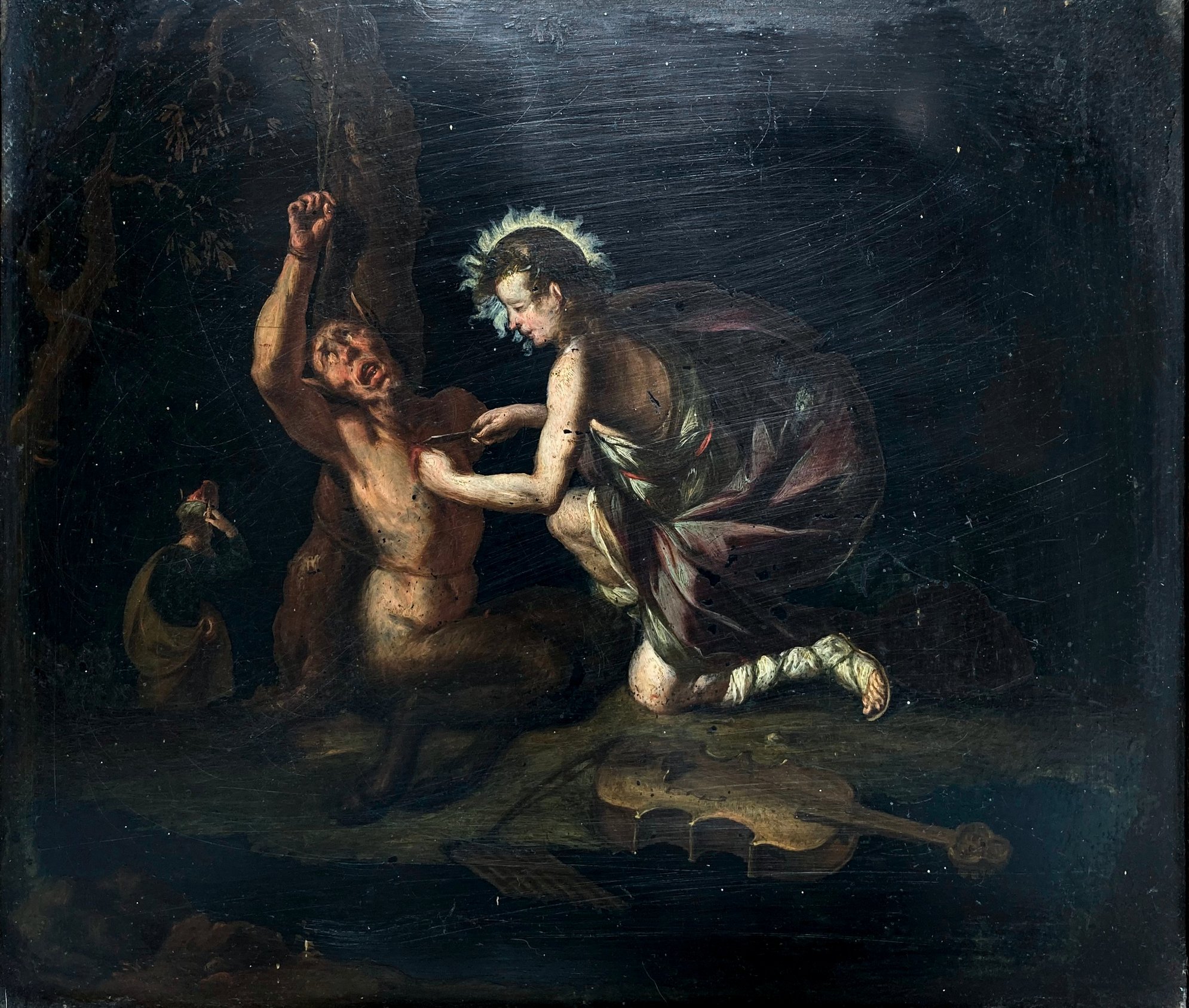 Dipinto ad olio su ardesia raffigurante Apollo che scuoia Marsia, XVII...