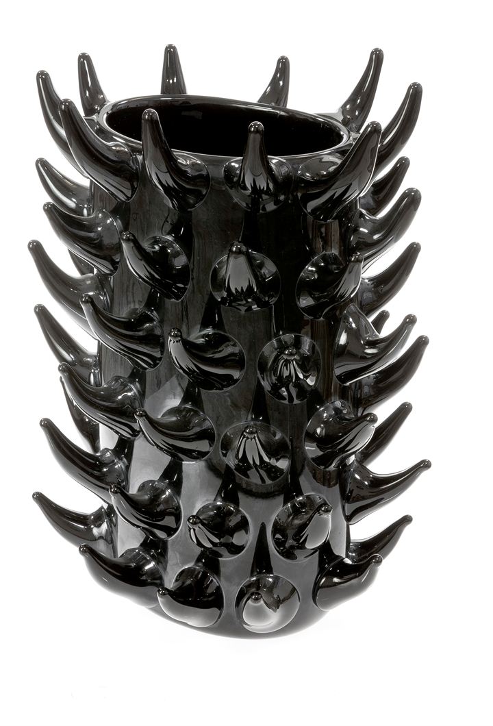Grande vaso in vetro nero con applicazione di grandi rostri a corno.