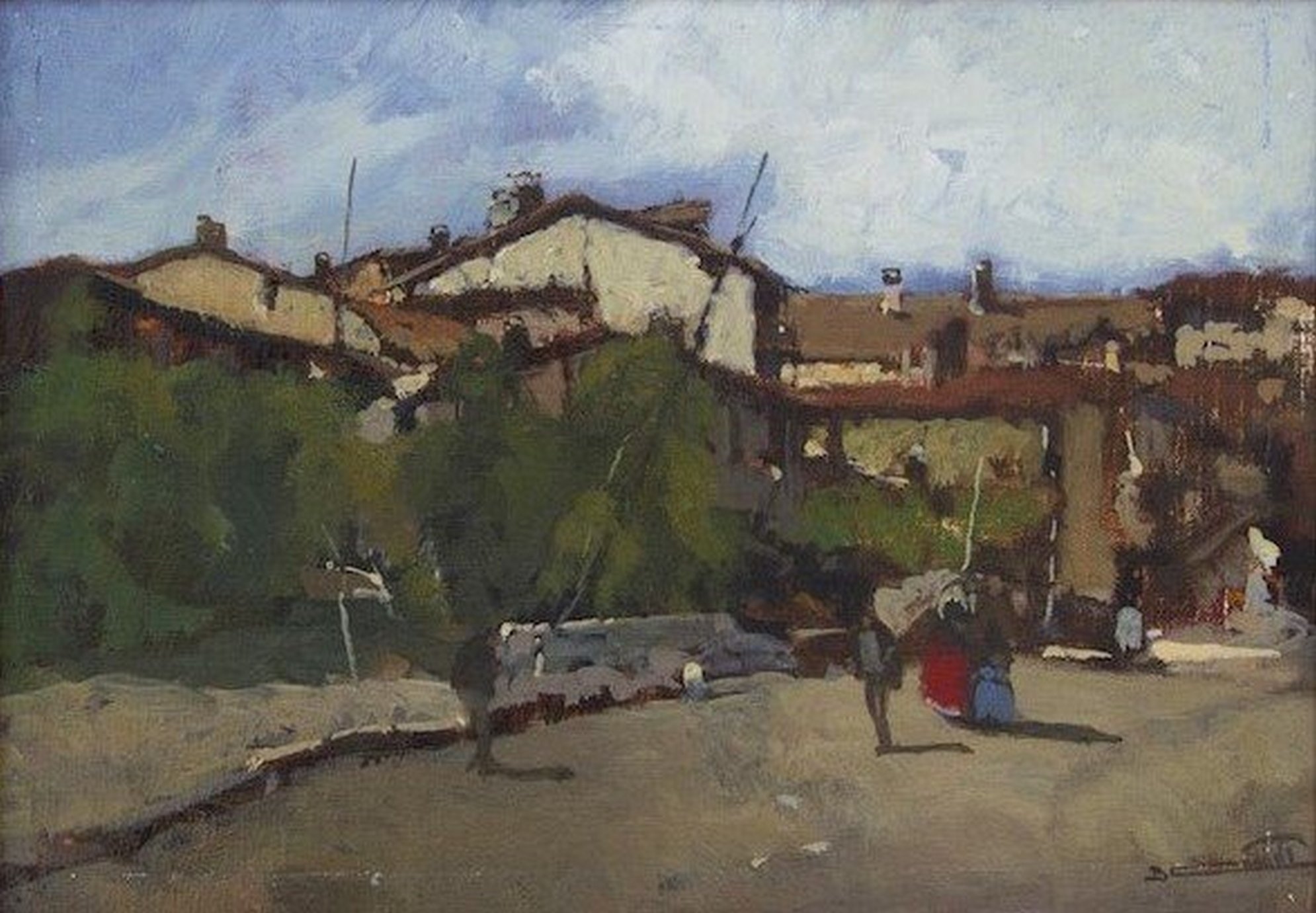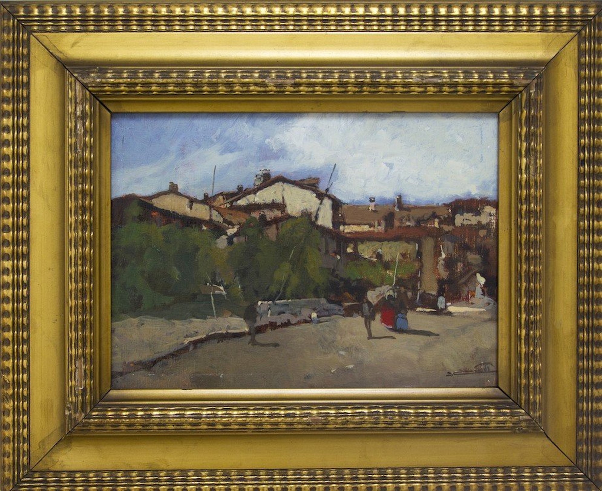 Dipinto ad olio su cartone raffigurante strada con paesaggio, Bernardo...