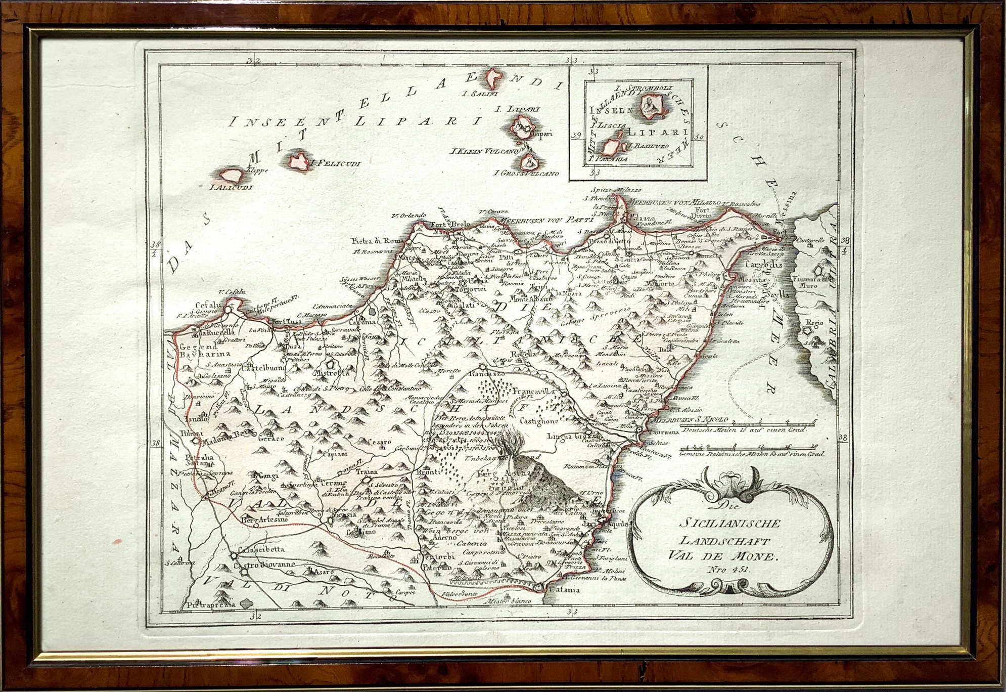 Die Sicilianische landschaft Val De Mone, 1788 circa, Reilly Franz Johann Joseph von. Cm 25x30, incisione in rame. Con cornice in radica filettata in oro cm 32x45. Ottime condizioni.