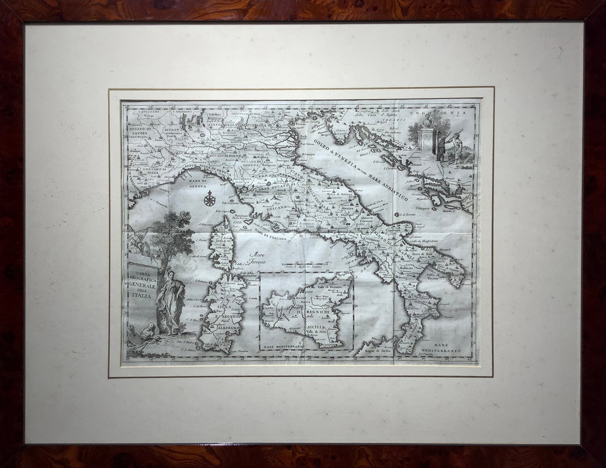 Carta geografica Generale dell’Italia, 1750. Giovan Battista Albrizzi (1698-1777). Tratto da "Atlante novissimo del Sign. Guglielmo de L’isle" – Venezia, 2 Vol. Cm 32,5 x 43,5, incisione su rame. In cornice in radica cm 59x73. Ottime condizioni.