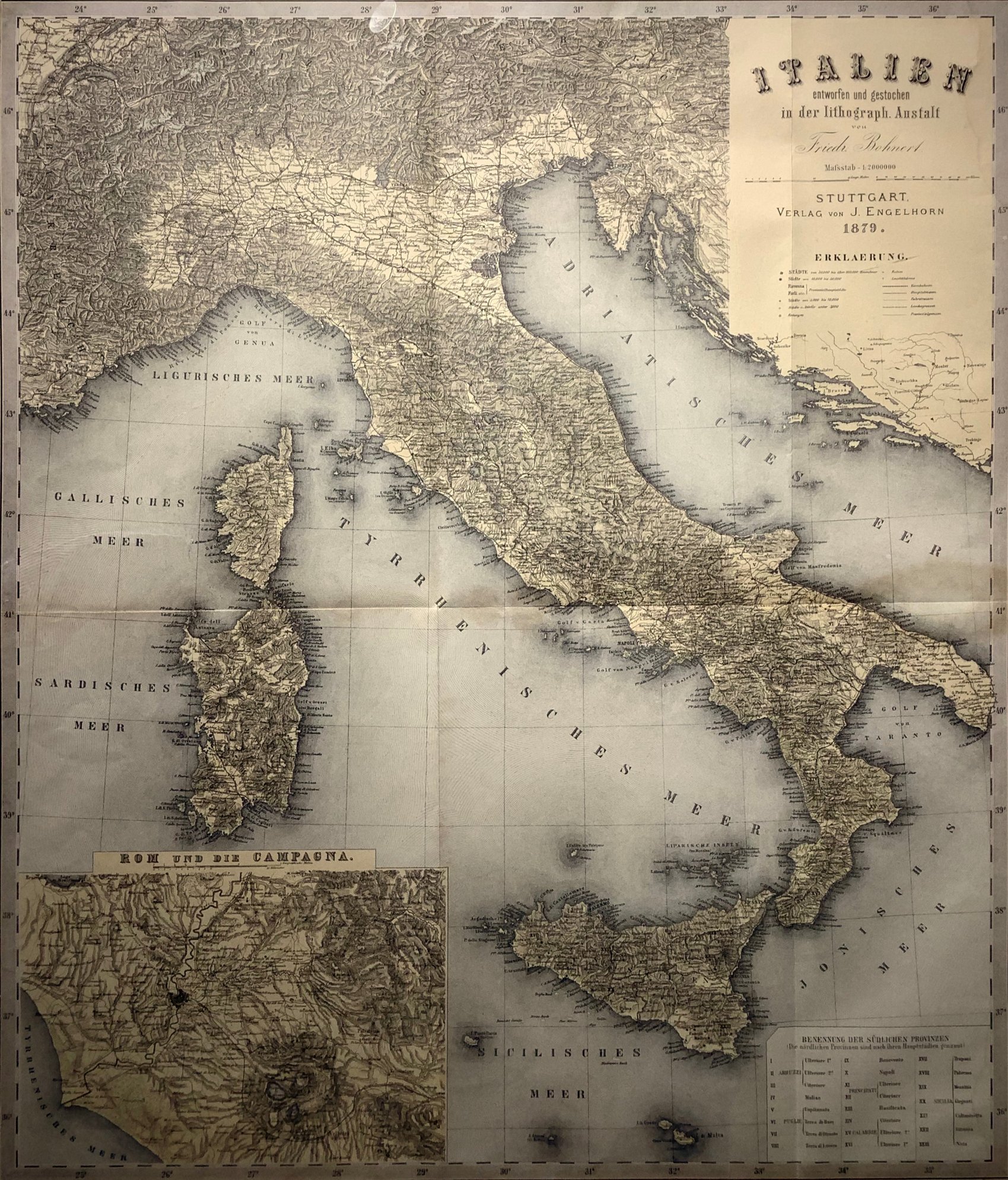 Italia- Carta geografica, 1879, grande formato, legenda 23 Prov. Italiane di fine 800. Italien-Fredrich-Bohnert e Stuttgart-Verlas Von J. Engelhom, 1879. Cm 75x54, incisione in rame. Ottime condizioni. In cornice nera filettata oro cm 84x70.