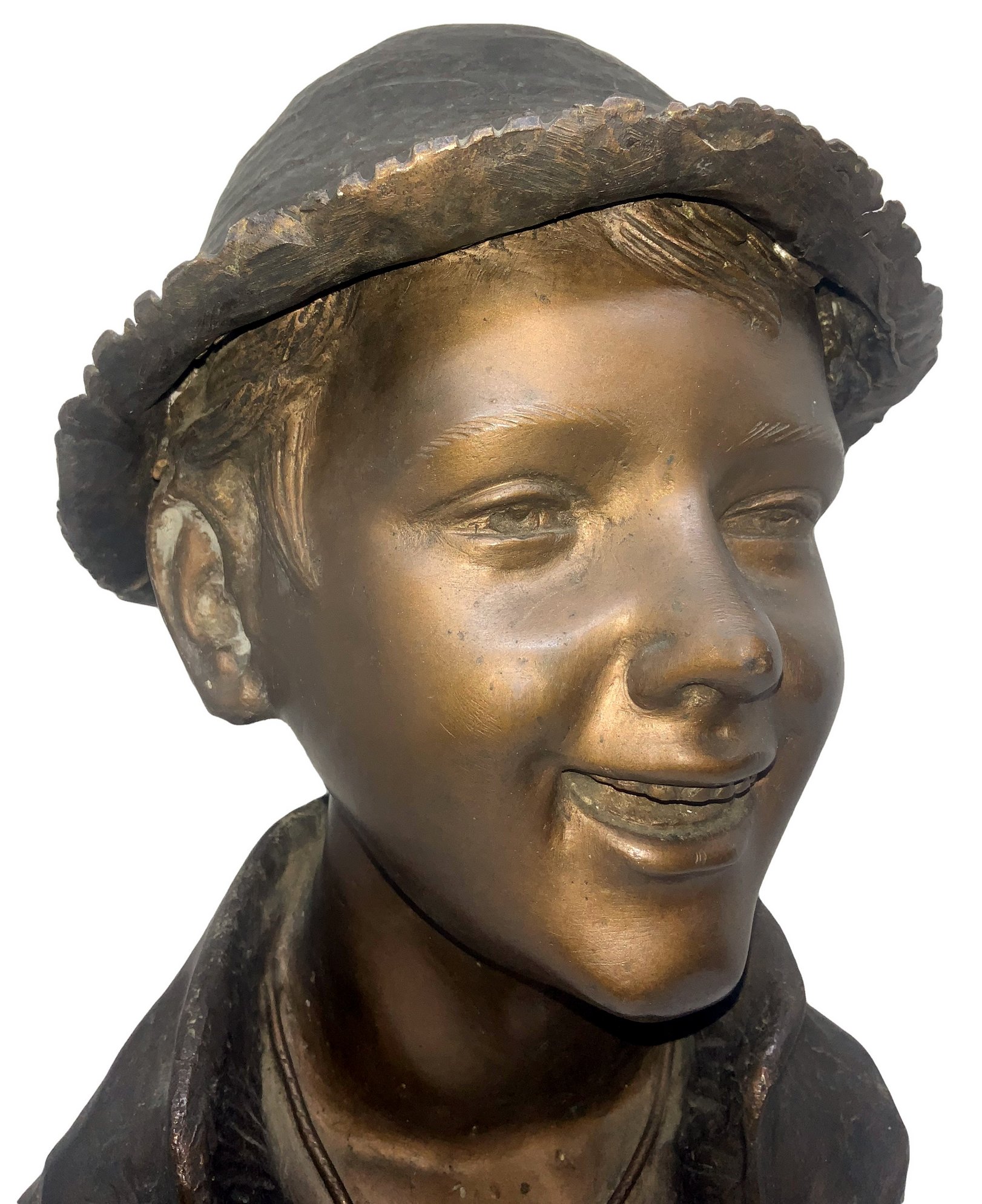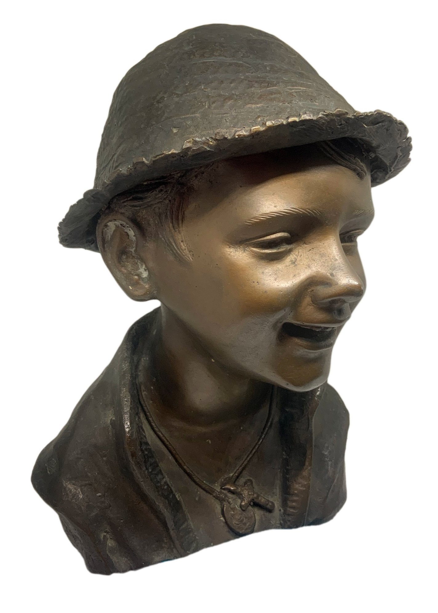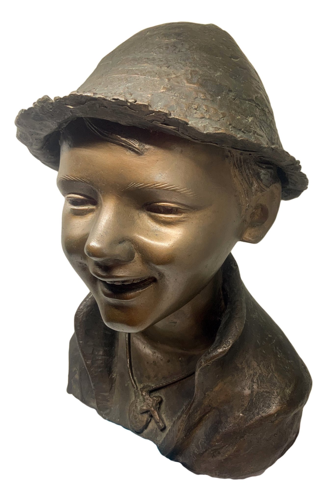 Bronzo raffigurante ragazzo con cappello, patinato bruno a cera persa. H cm 33.