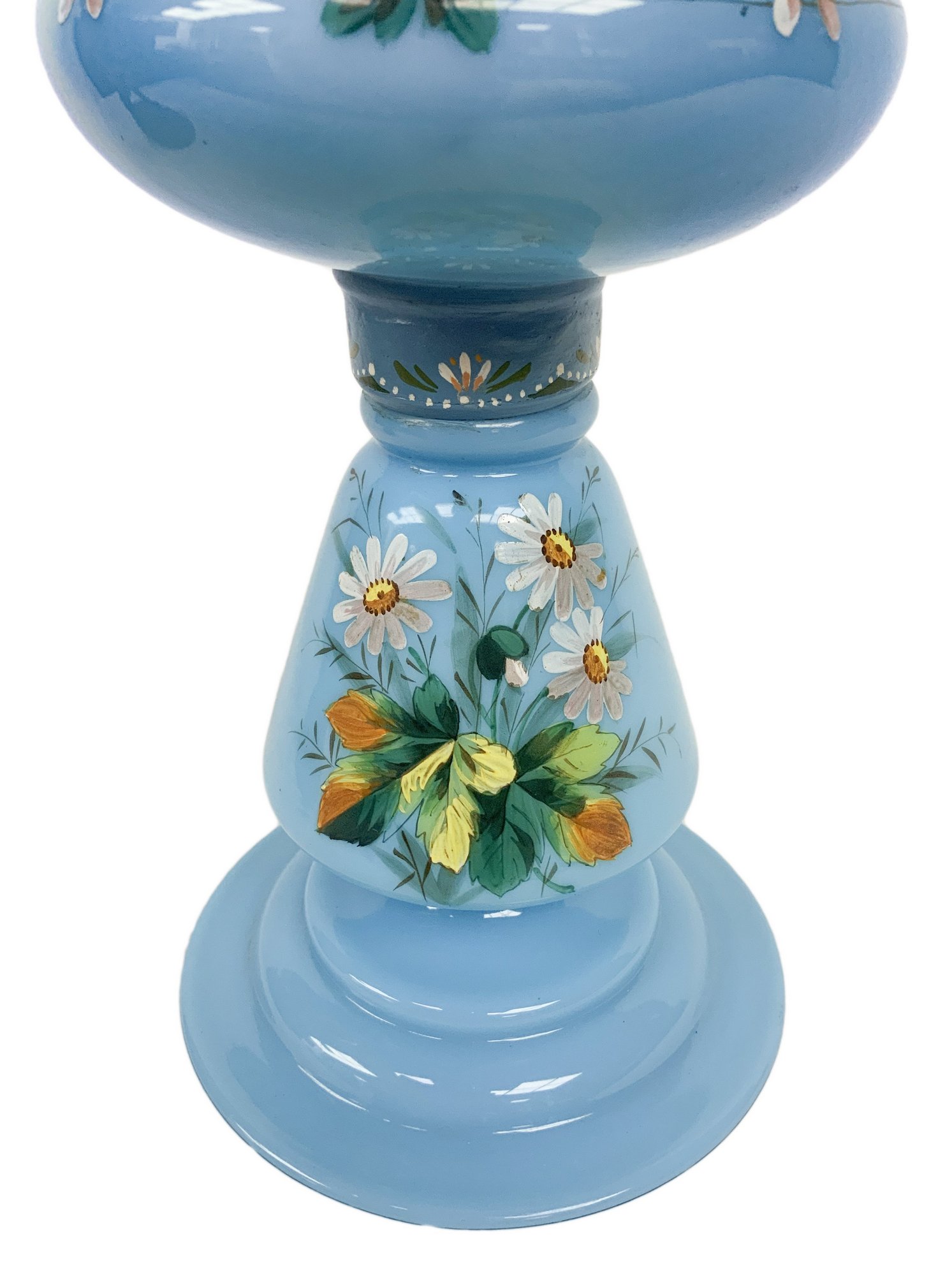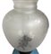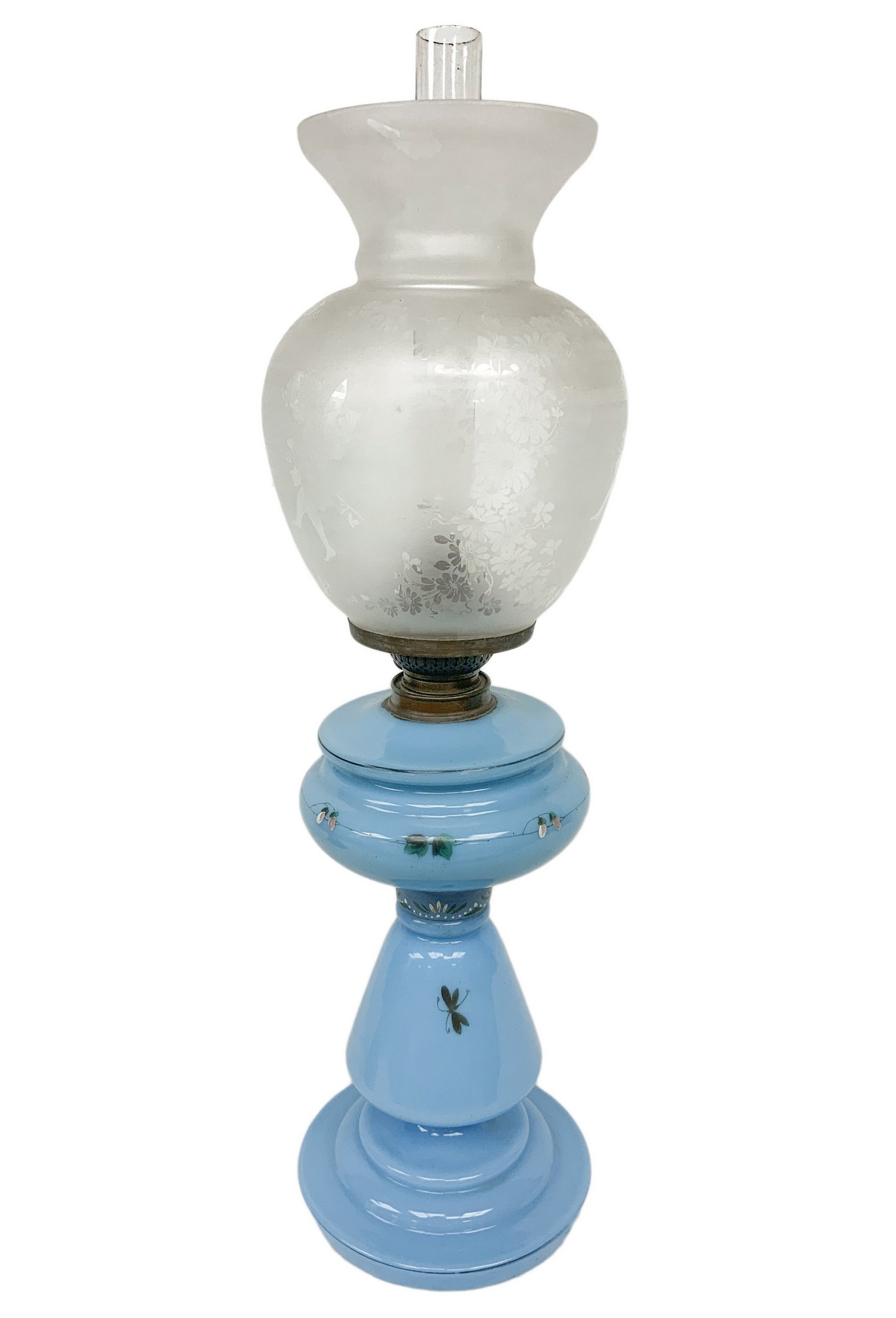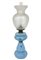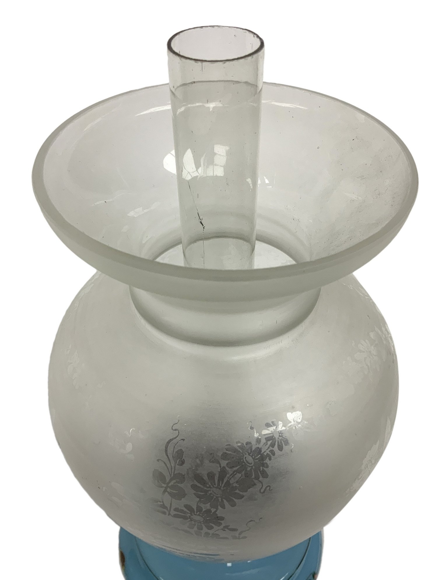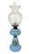 Lume a petrolio in vetro opaline colore turchese con decori floreali. Boccia...