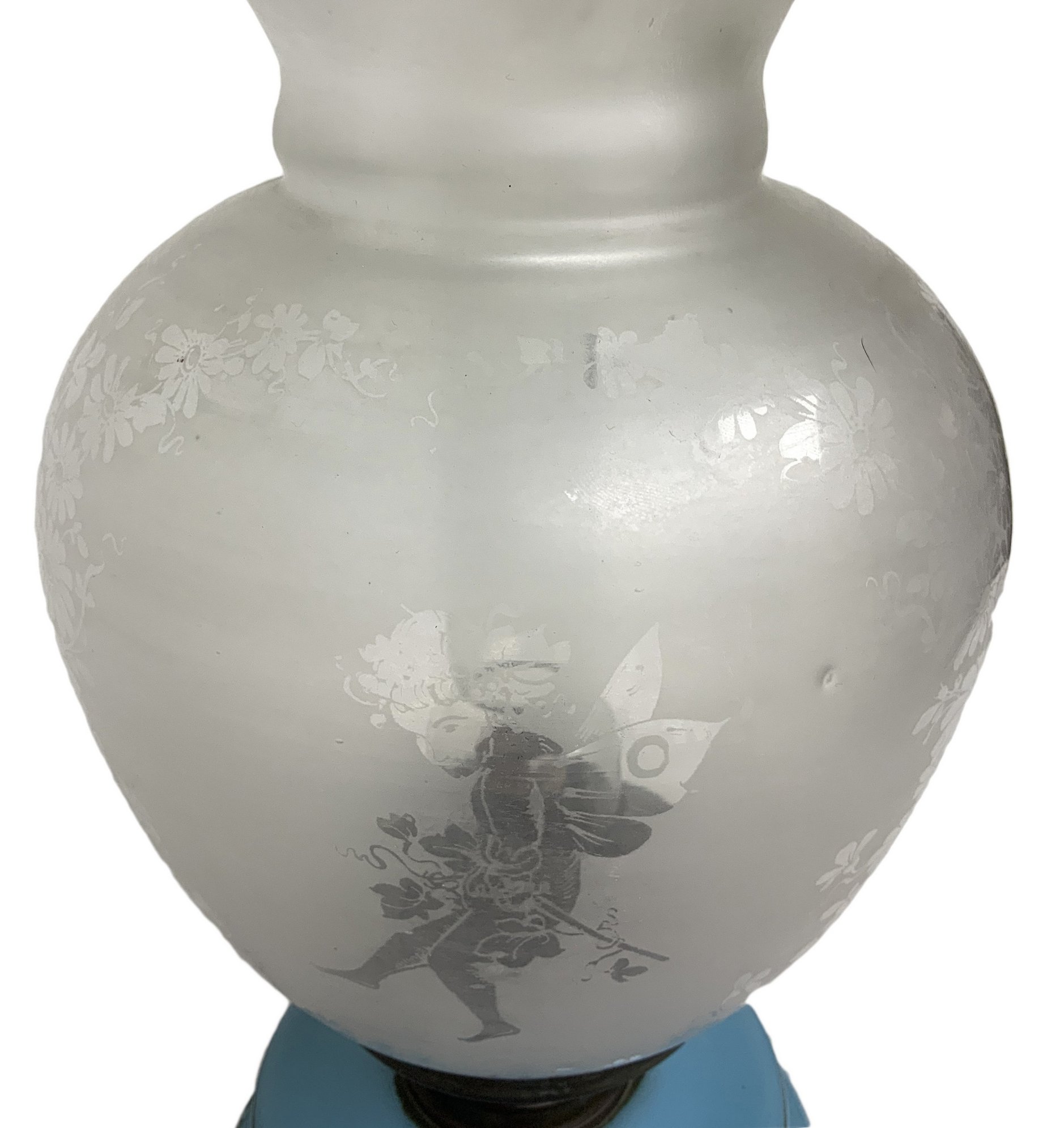 Lume a petrolio in vetro opaline colore turchese con decori floreali. Boccia in vetro satinato con decorazione di angeli. H cm 57