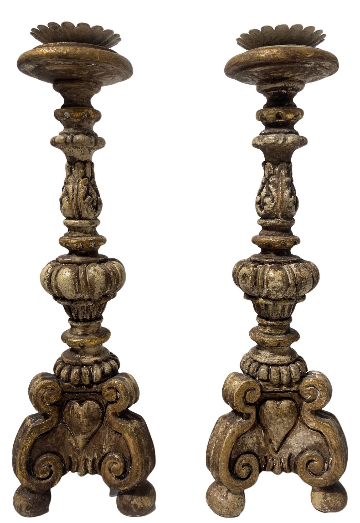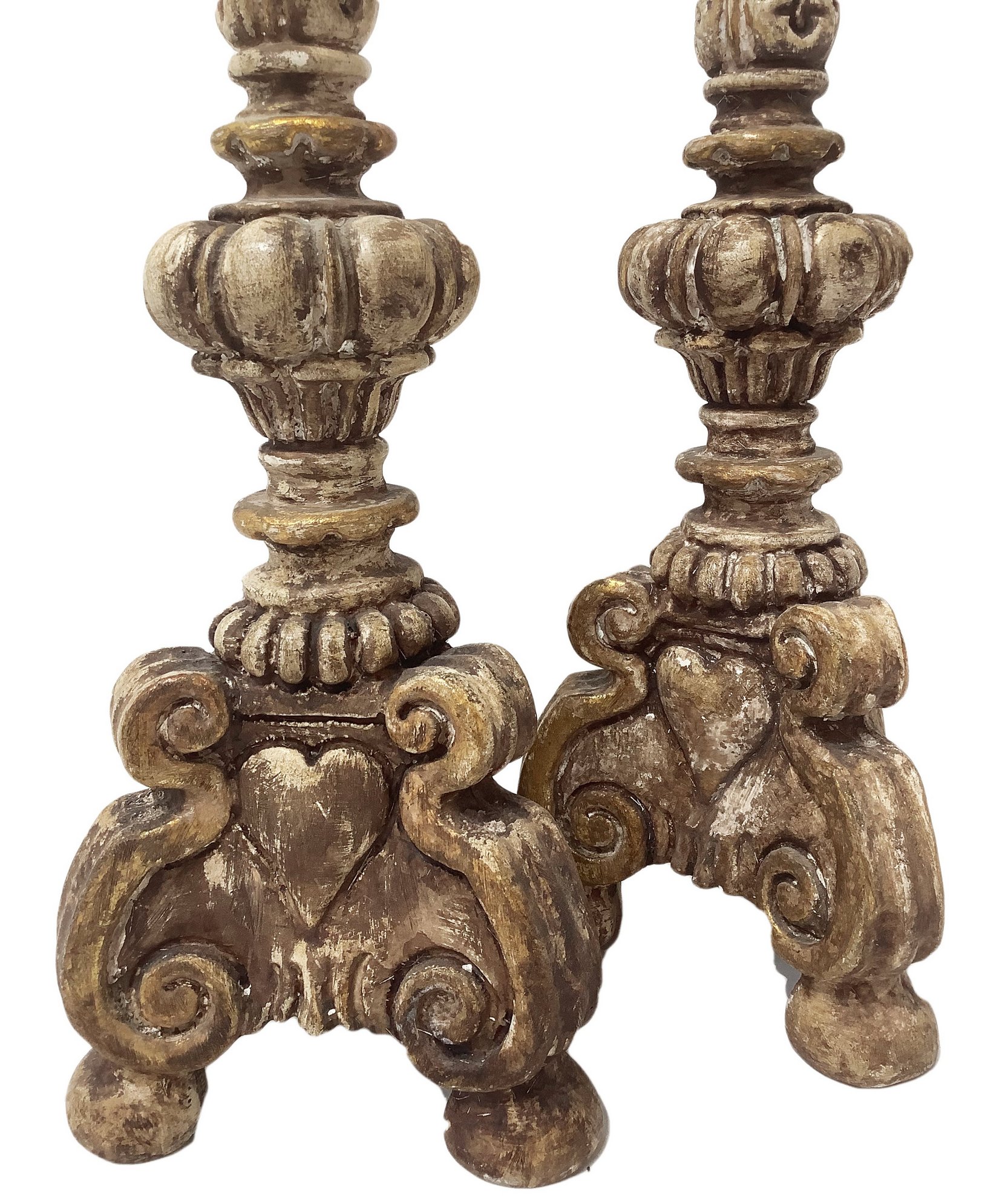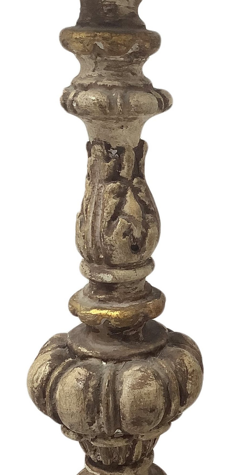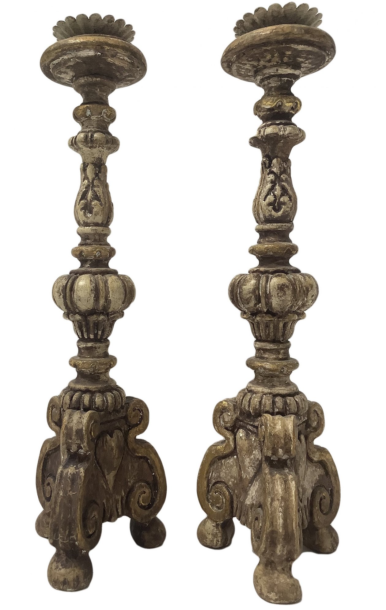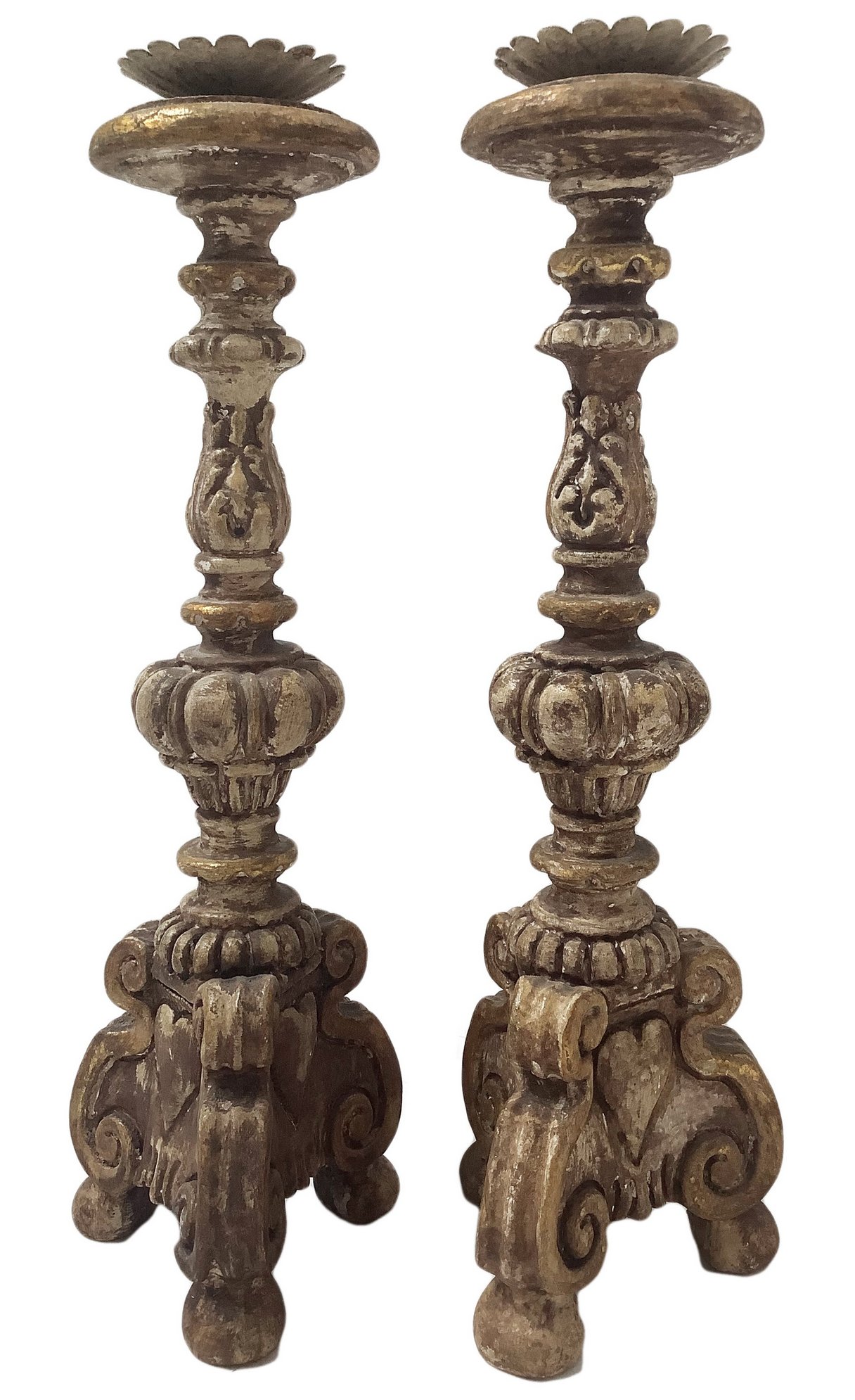 Lotto 360 | Coppia di candelieri in legno parzialmente dorati, XIX secolo. H cm 46.