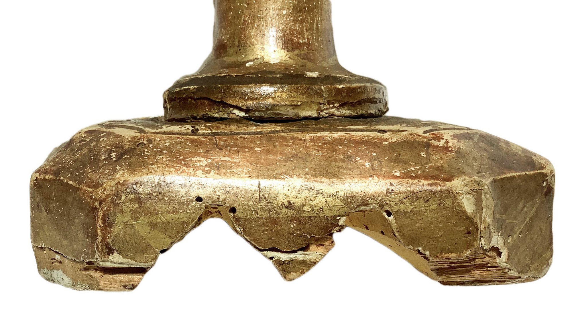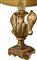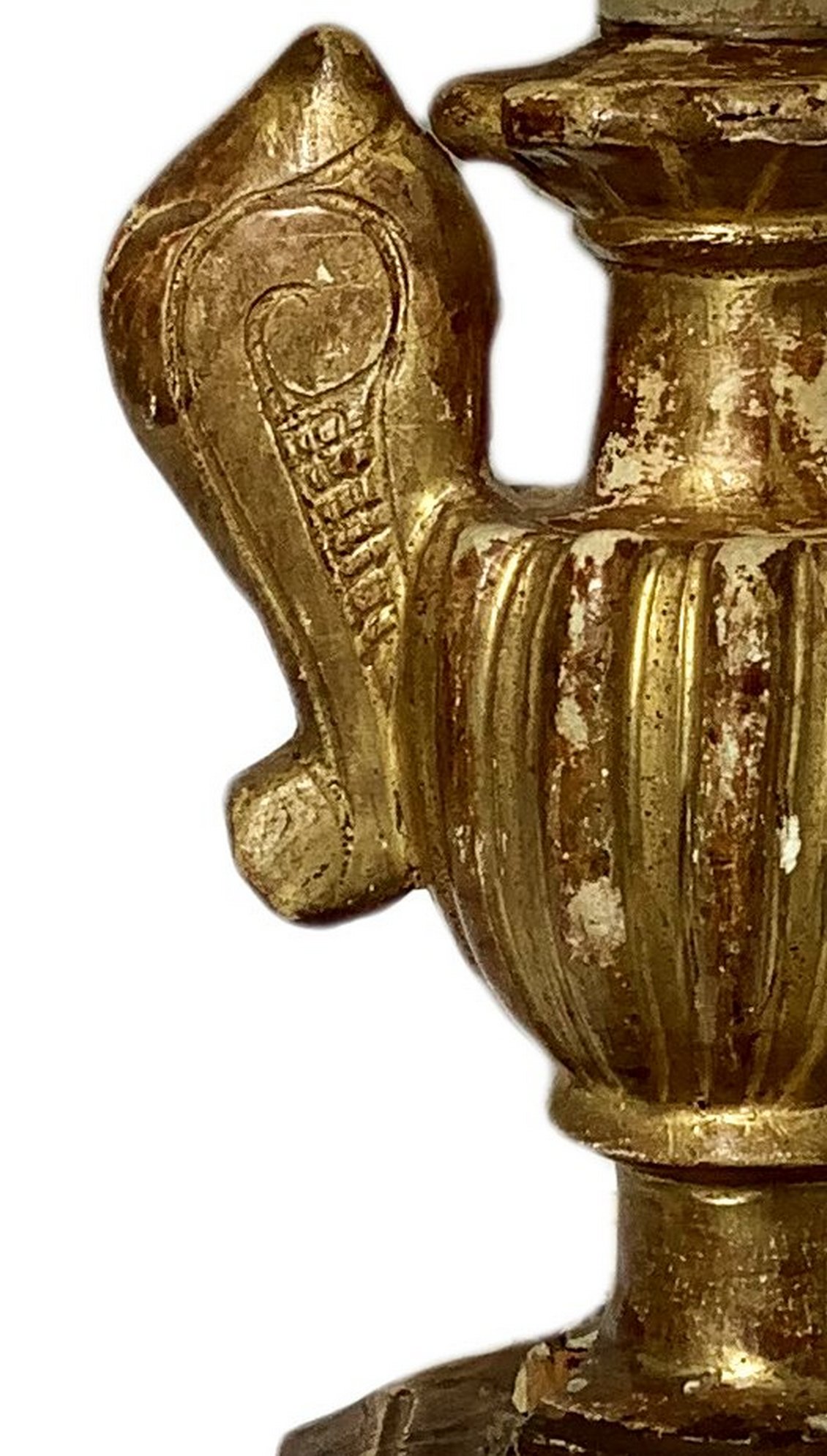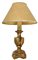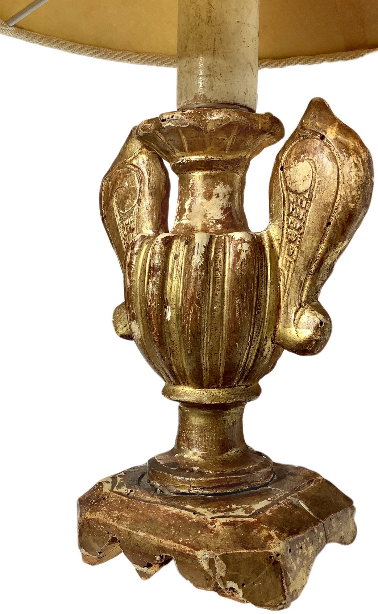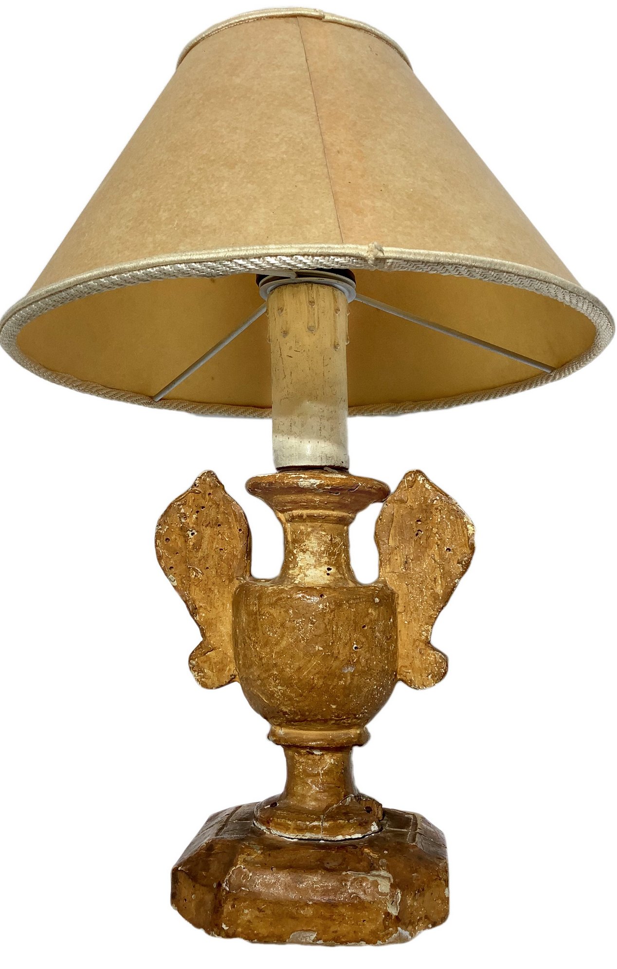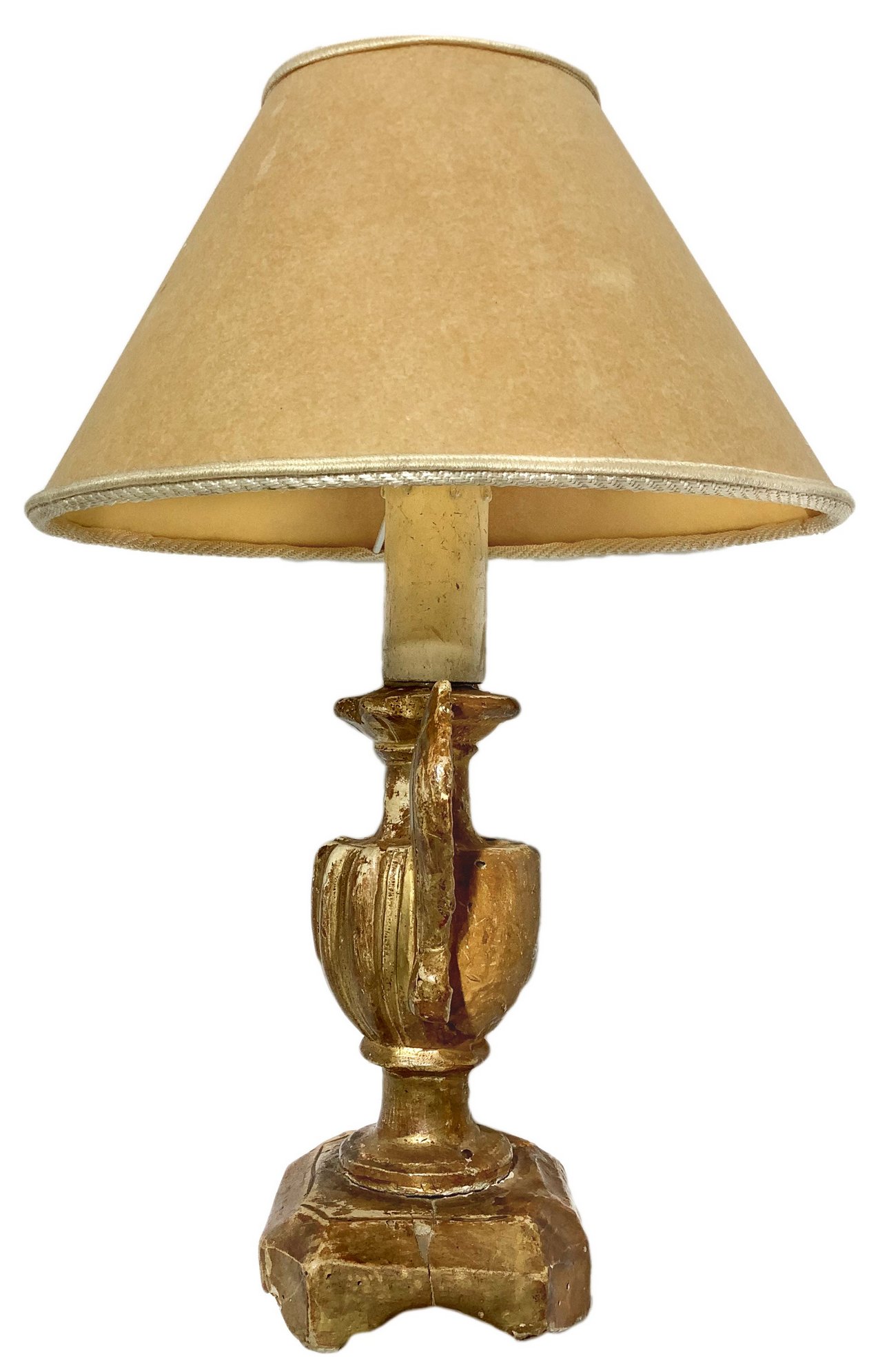 Piccolo lume con base in legno dorato a forma di anfora con paralume in pergamena, XIX secolo. H cm 38.