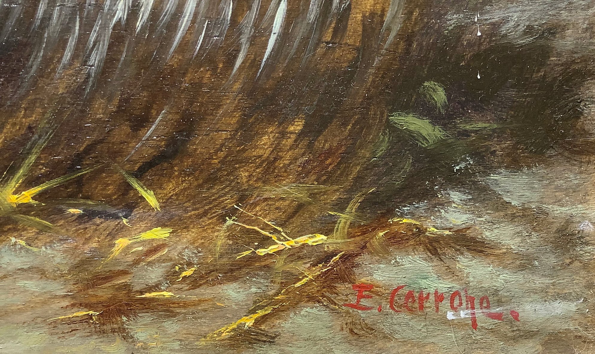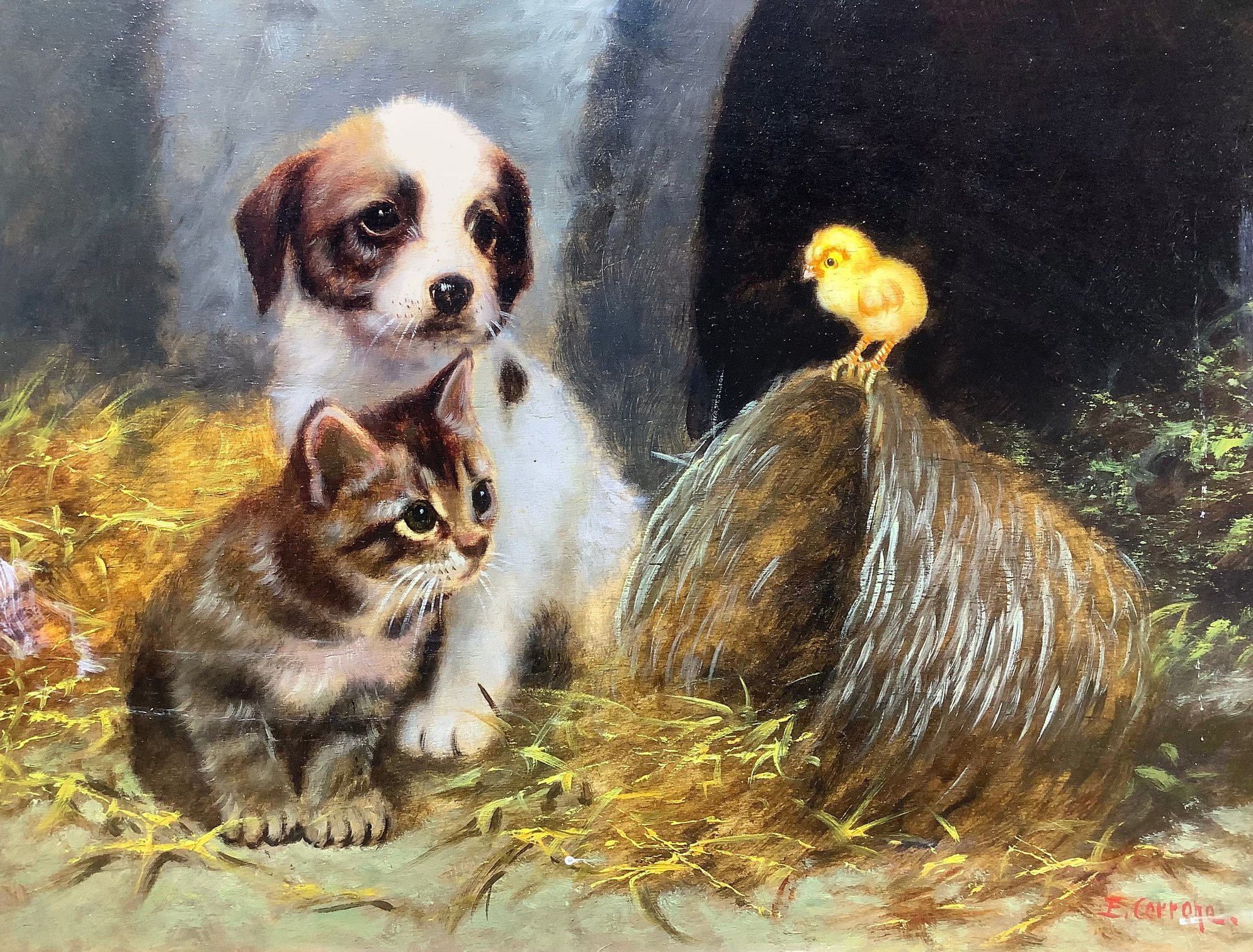 Dipinto ad olio su legno raffigurante cane, gatto e pulcino, Eduardo Cerrone...