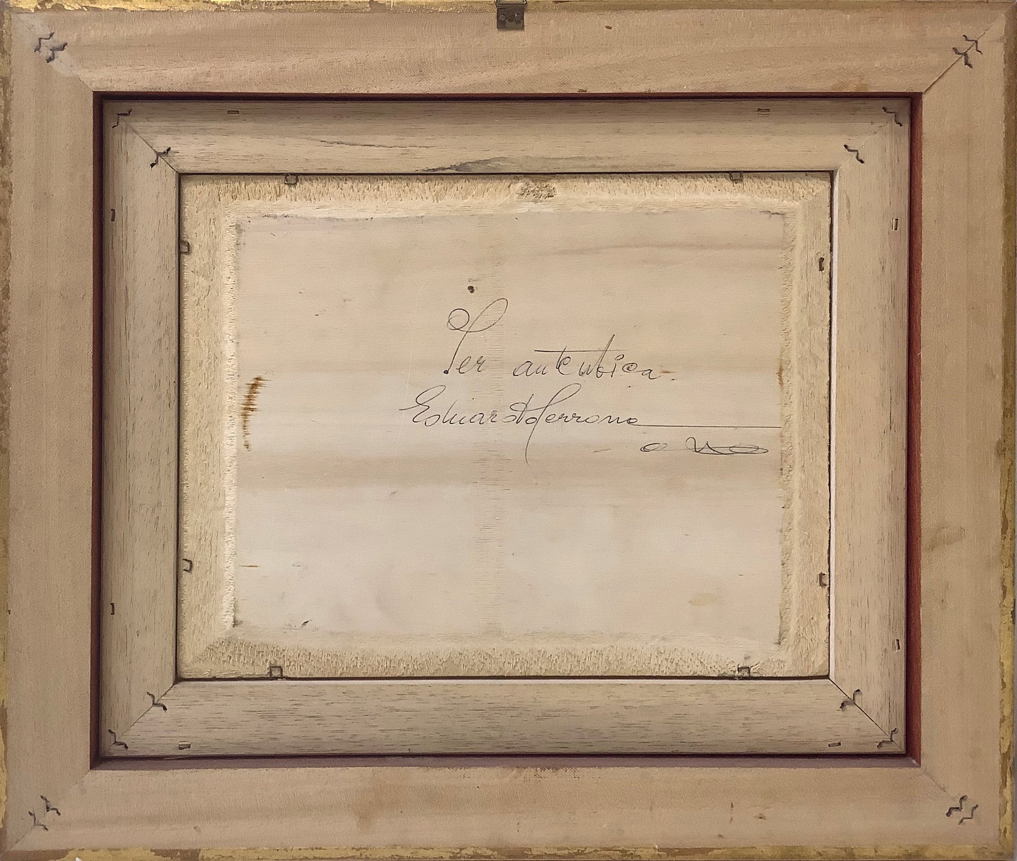 Dipinto ad olio su legno raffigurante cane, gatto e pulcino, Eduardo Cerrone (Napoli 1935- 2011). Cm 24x30, in cornice cm 40x45. Firmato in basso a destra E. Cerrone, sul retro Eduardo Cerrone.