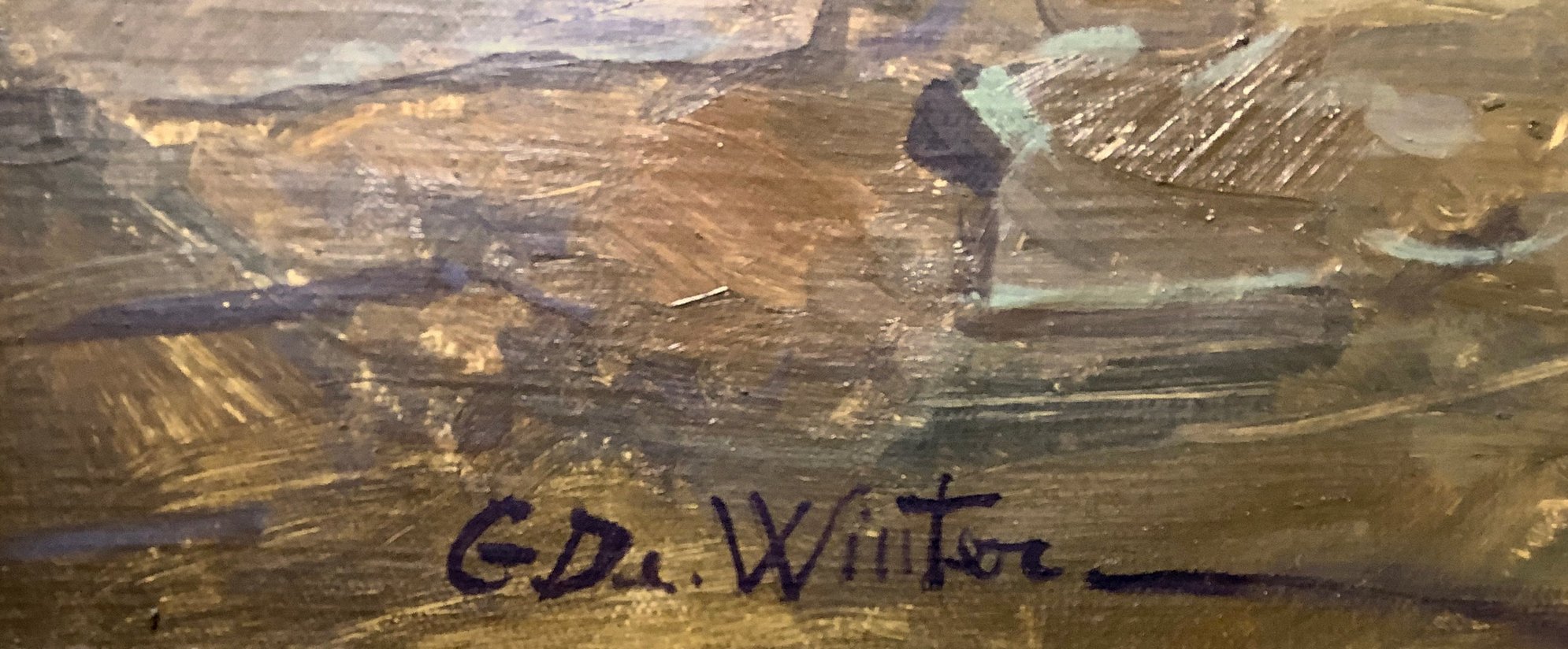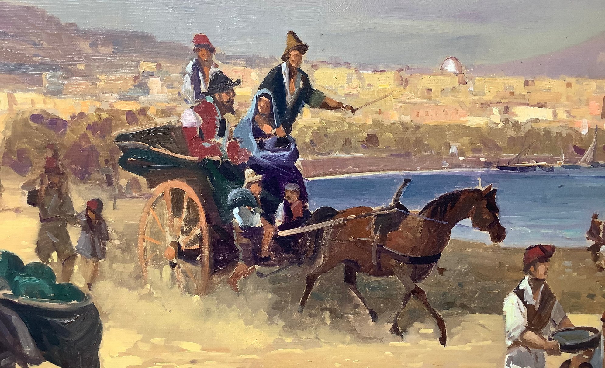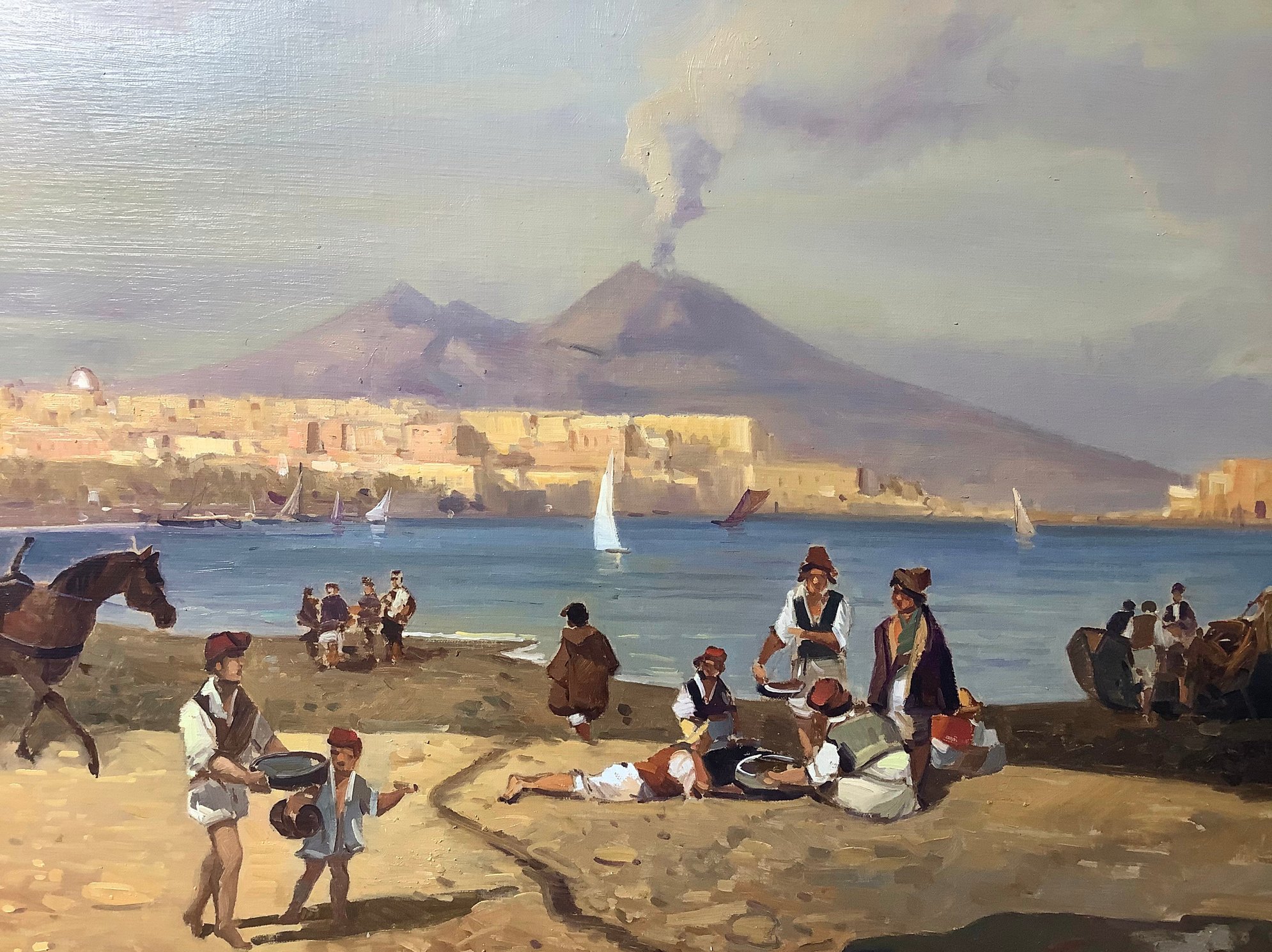 Dipinto ad olio su tela raffigurante veduta del Vesuvio e del golfo di Napoli con personaggi, Giuseppe De Winter (fine XIX secolo). Firmato in basso a sinistra G. De Wintter. Cm 80x100, in cornice cm 97x120. Ottimo stato di conservazione.