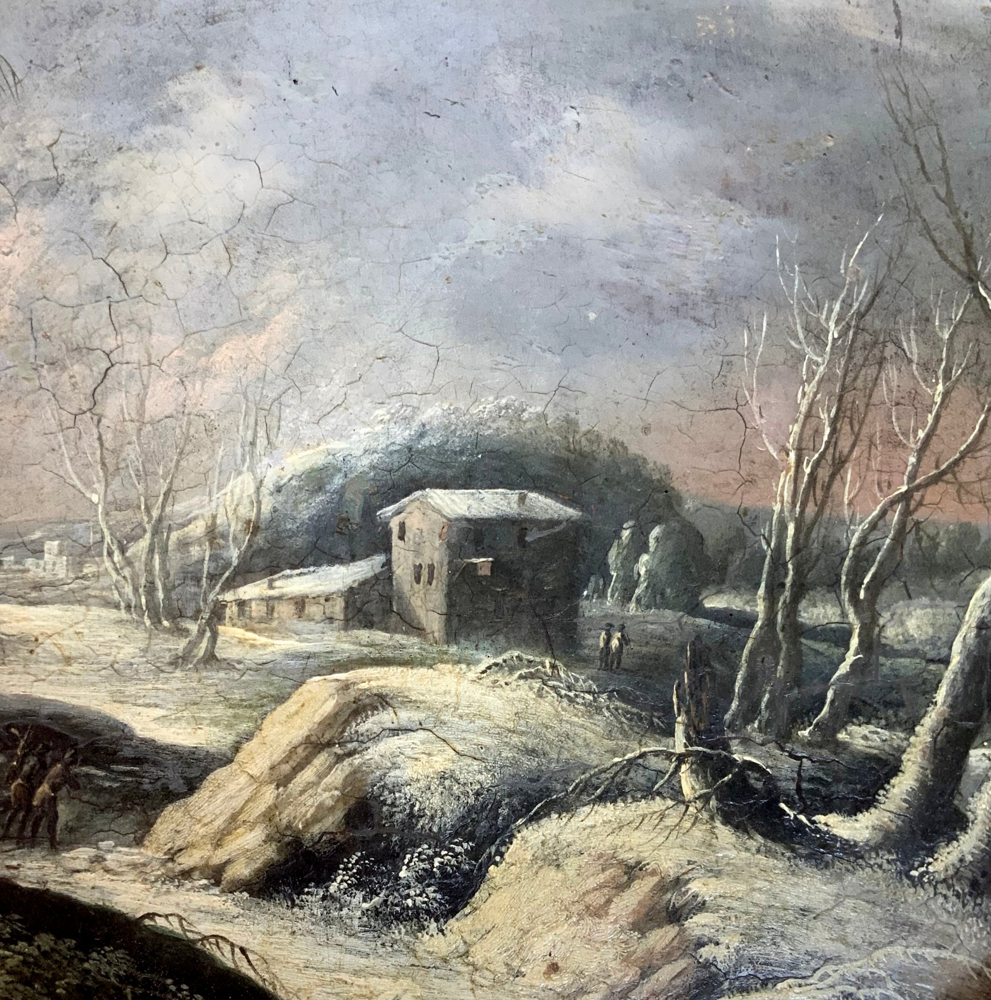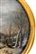 Dipinto ad olio su tela rotonda raffigurante paesaggio innevato, seconda metà del XVIII secolo. Diametro cm 27.