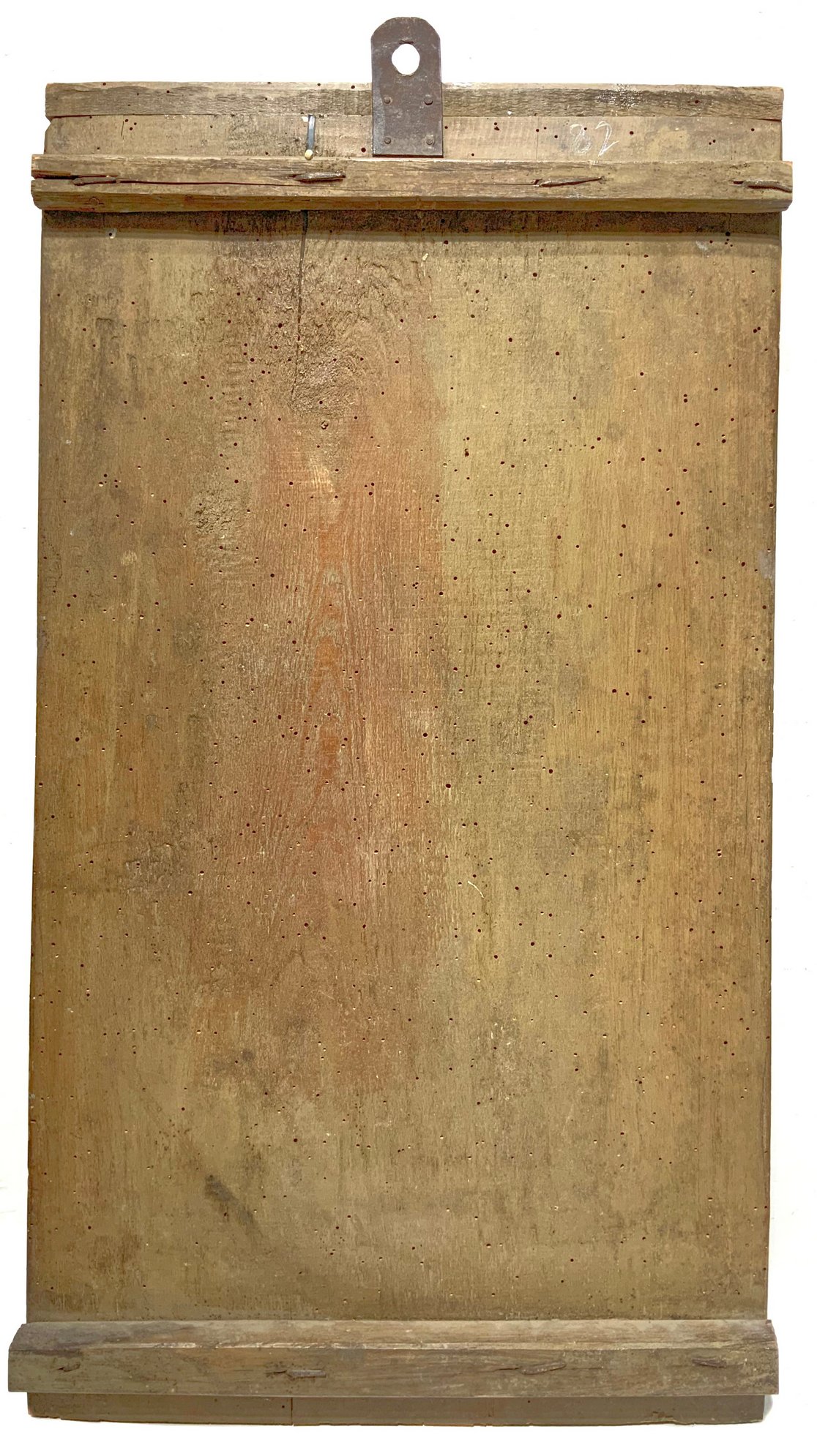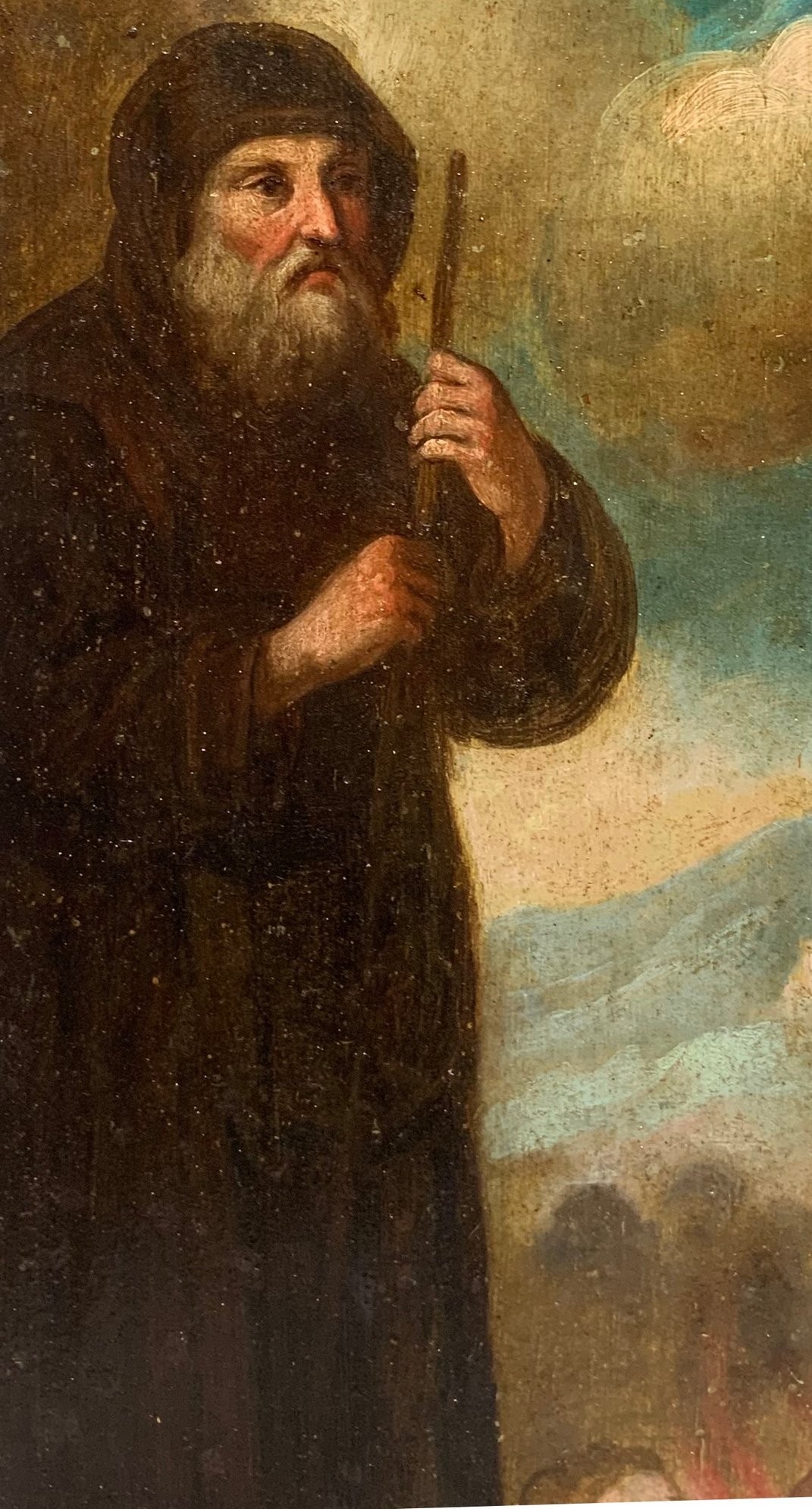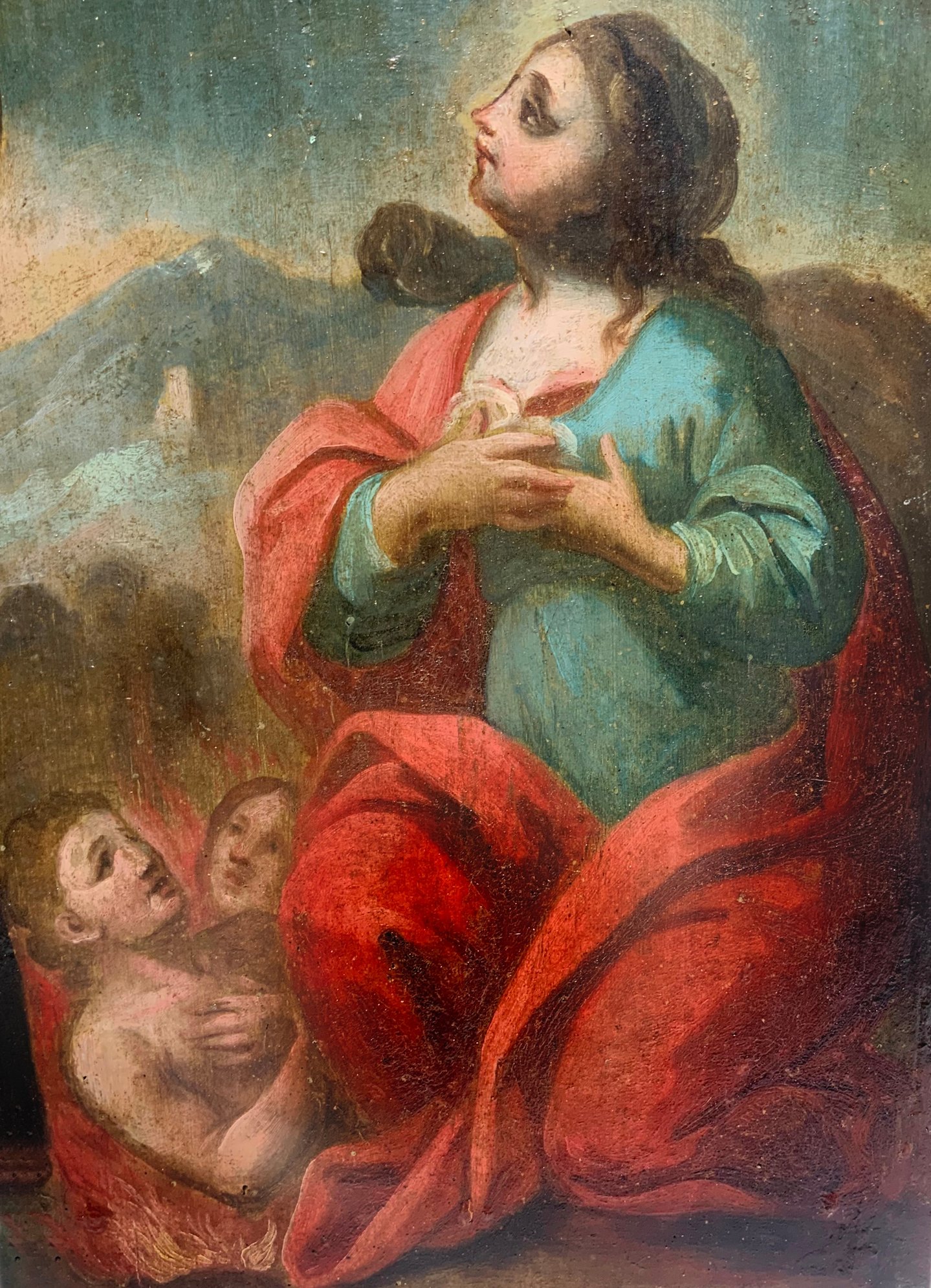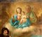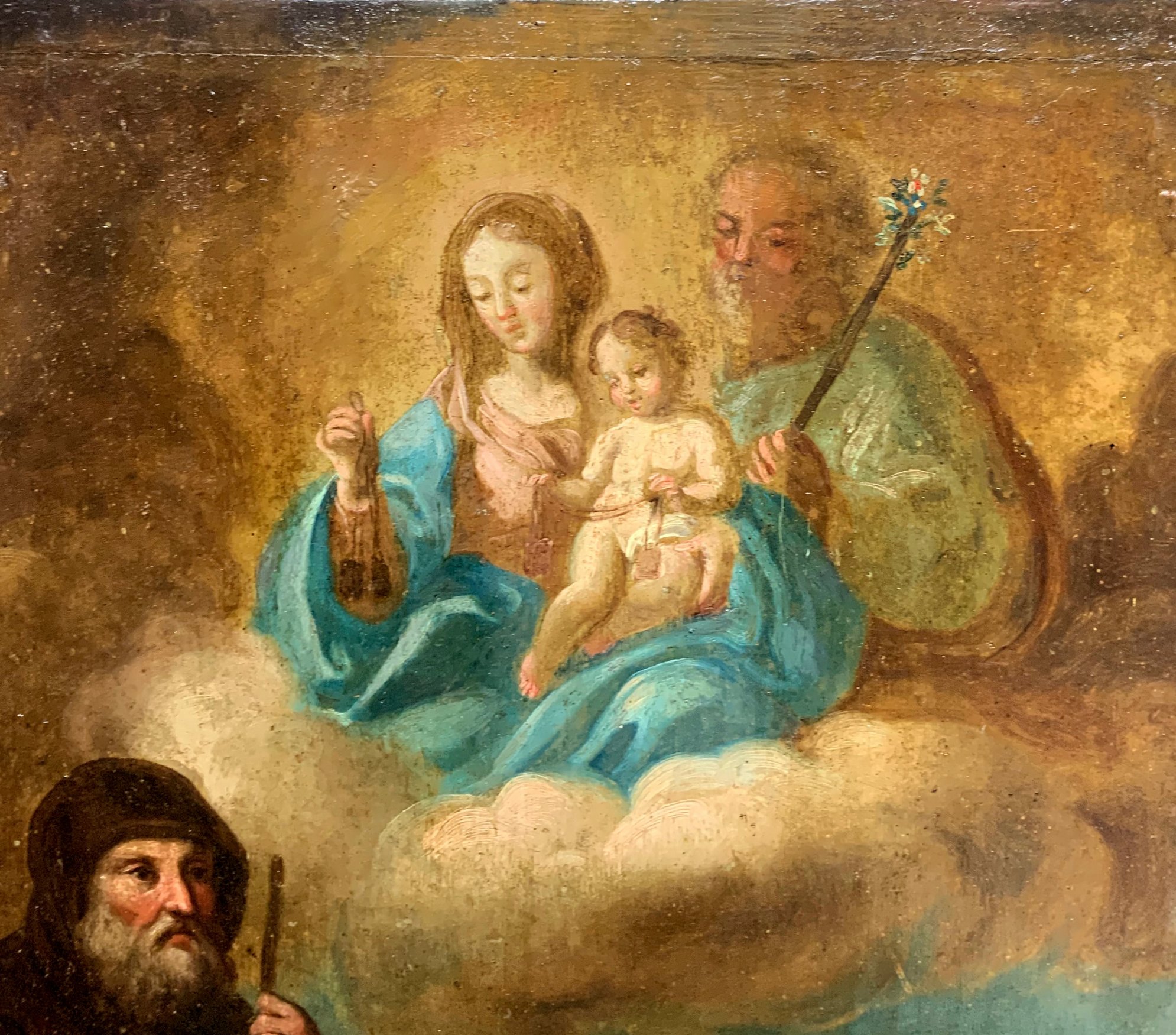 Dipinto ad olio su tela raffigurante Sacra Famiglia e Santi Agata, Francesco ed Etna sullo sfondo, XVIII Secolo, Italia, Sicilia. Cm 73x41. Angolo della cornice danneggiato. Antica collezione Notaio Cav. Fazio. Superficie del dipinto risulta interessata dalla presenza di uno strato di vernice ossidata e ingiallita.