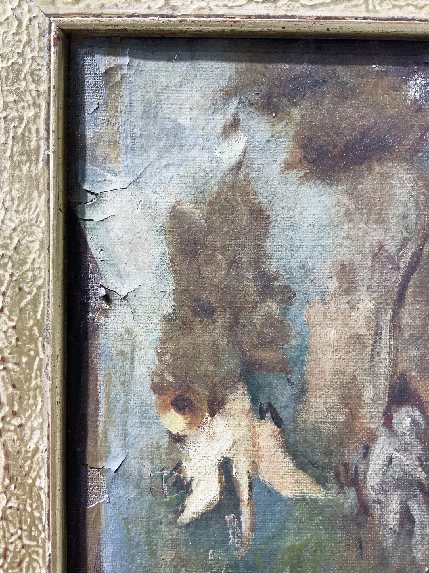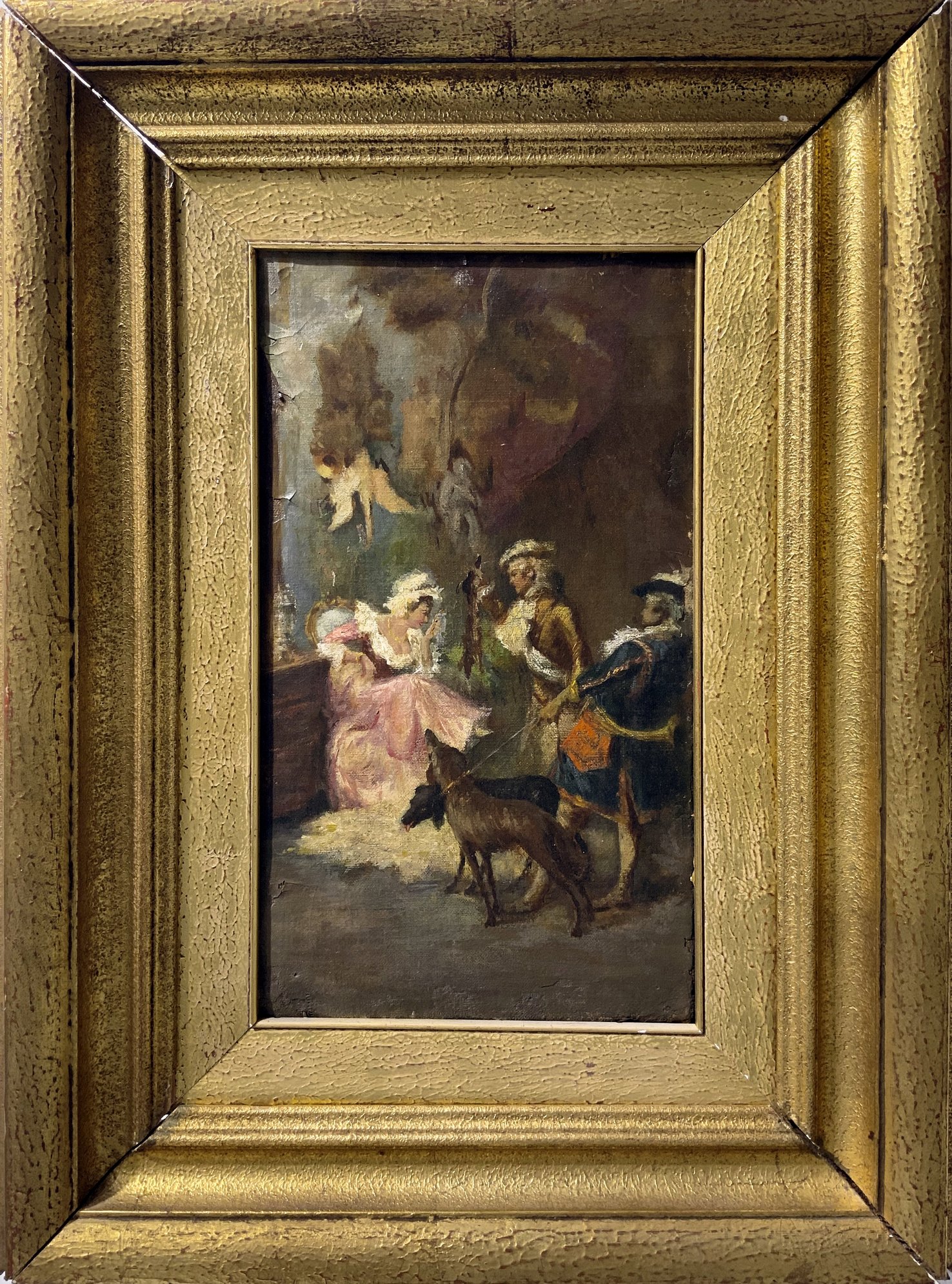 Dipinto ad olio su tela raffigurante personaggi in abiti settecenteschi in un interno, XIXI secolo. Cm 34x19. Cadute di colore