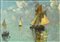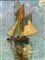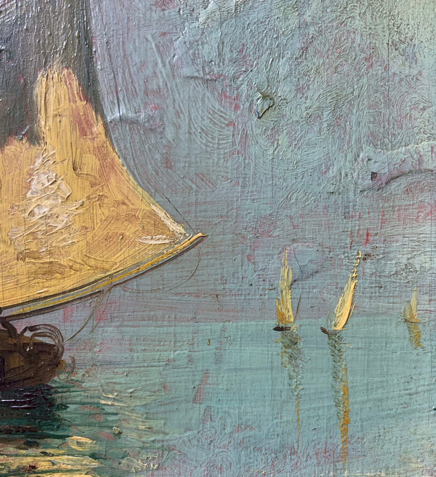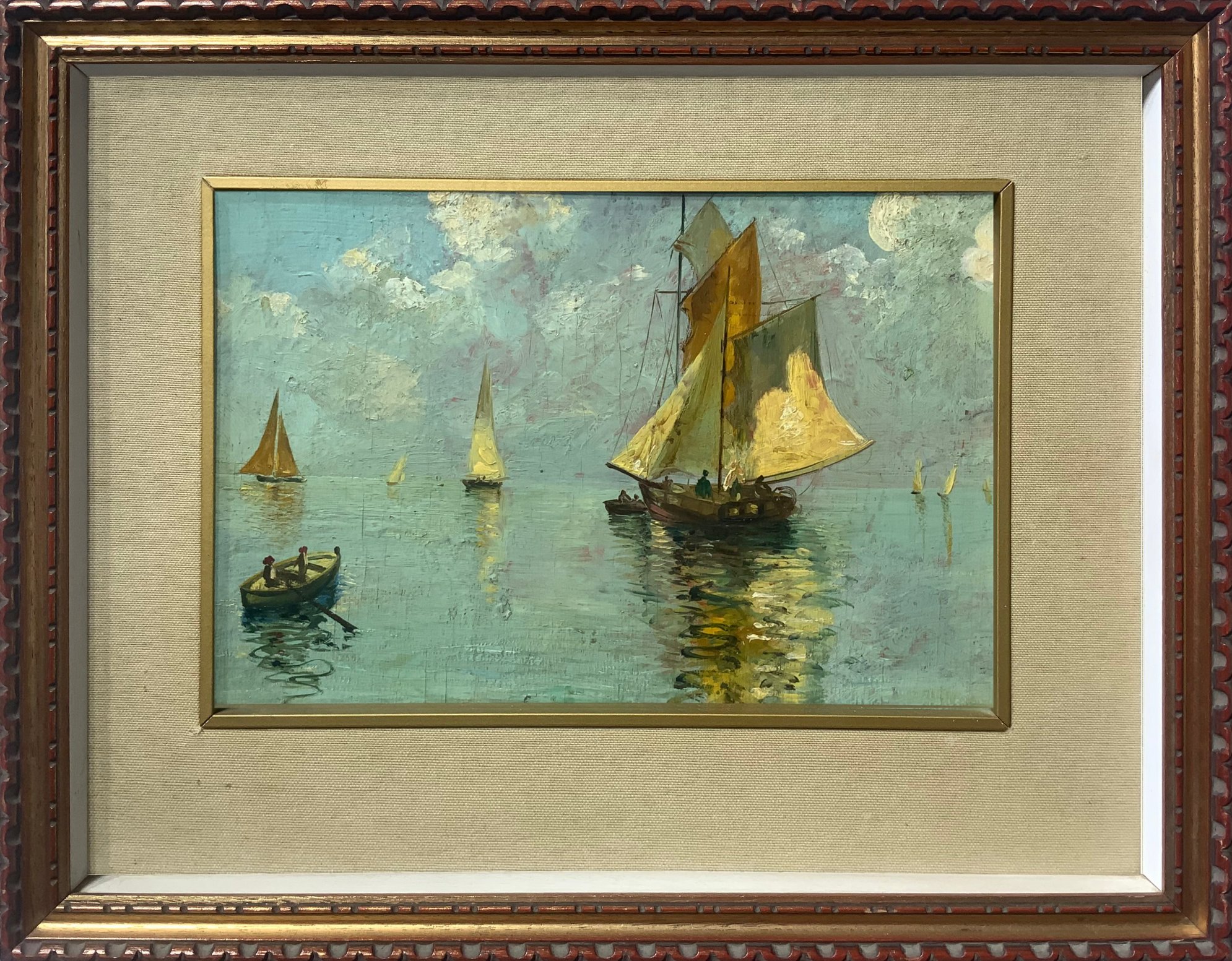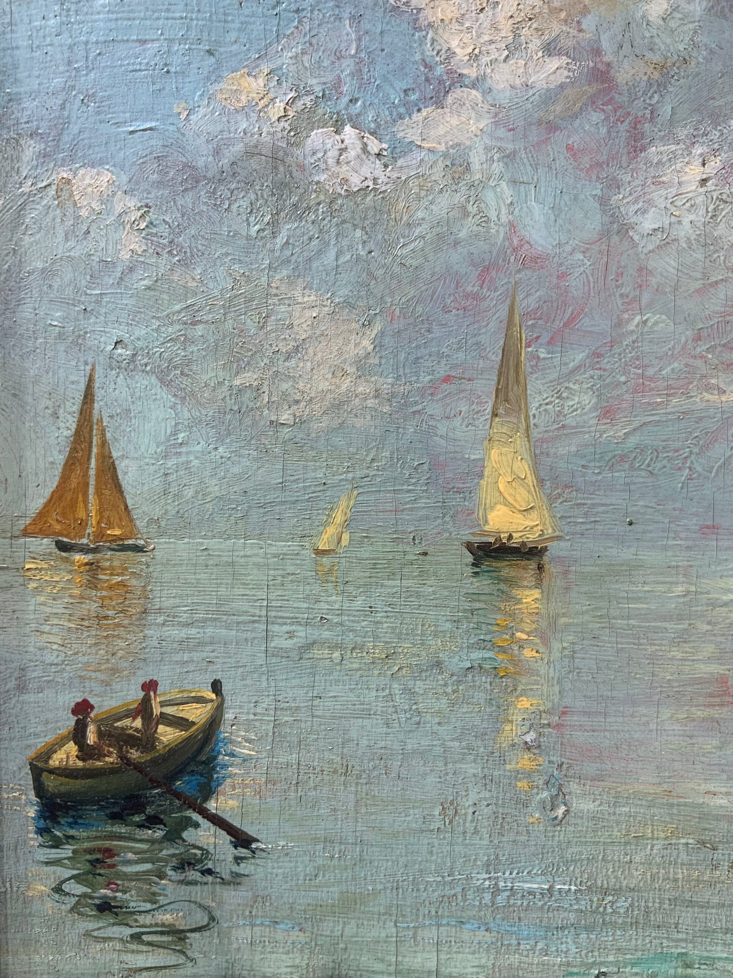 Dipinto ad olio su tavola raffigurante marina con barche, fine XIX secolo. Cm 22x33.