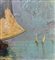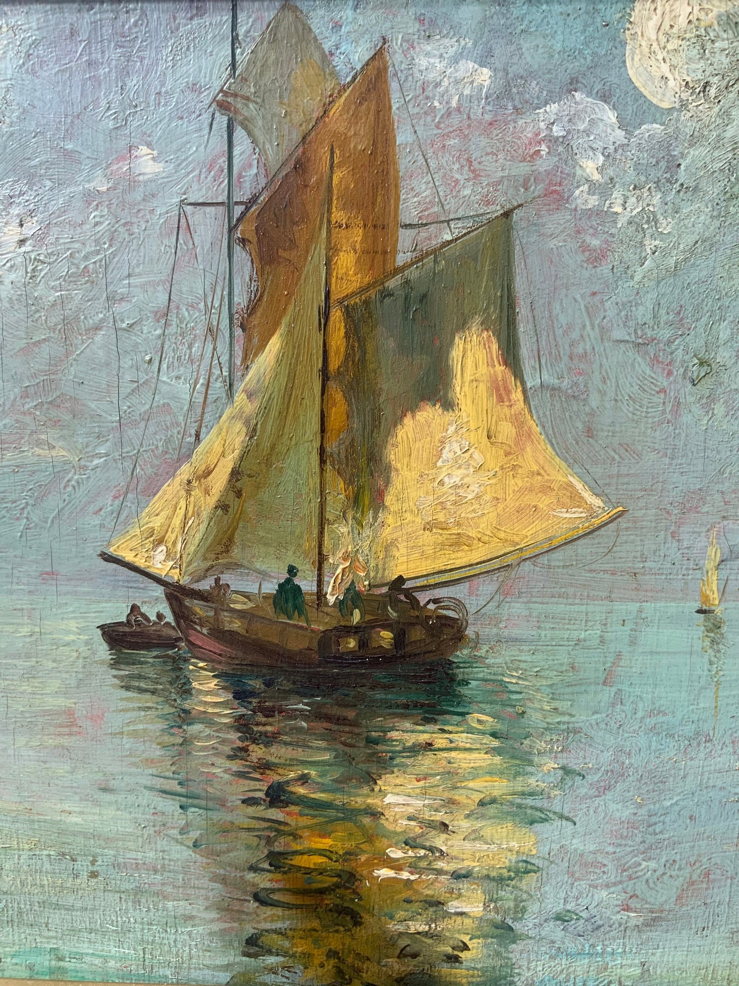 Dipinto ad olio su tavola raffigurante marina con barche, fine XIX secolo. Cm...