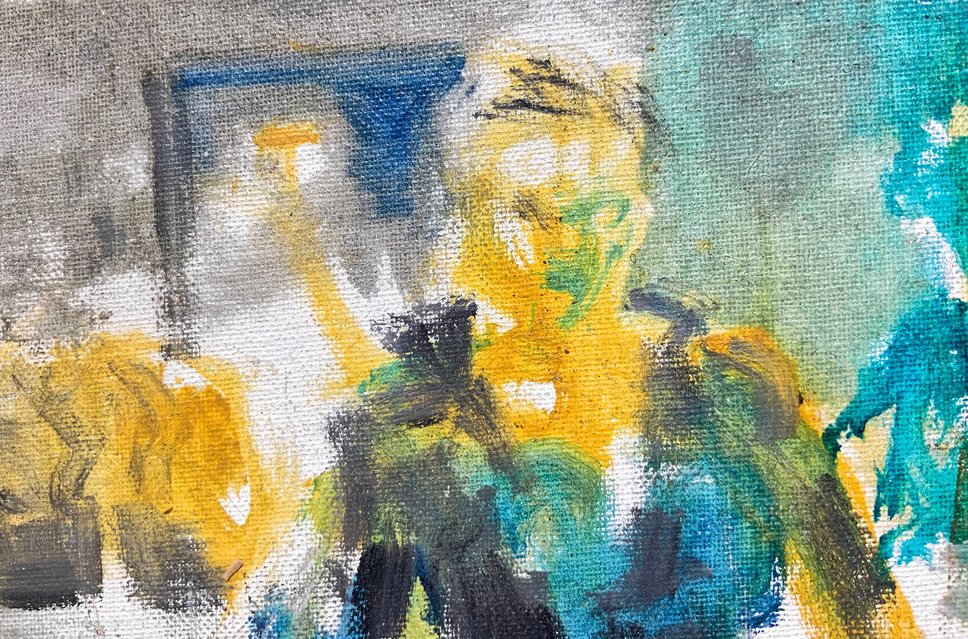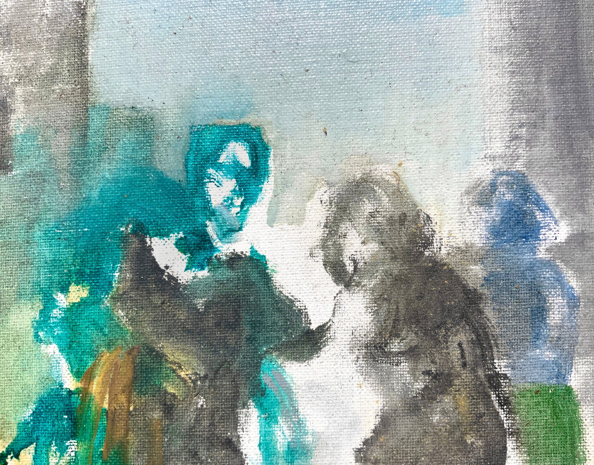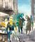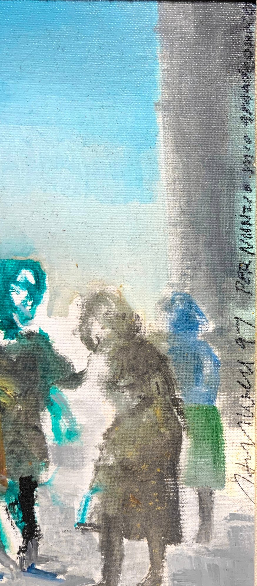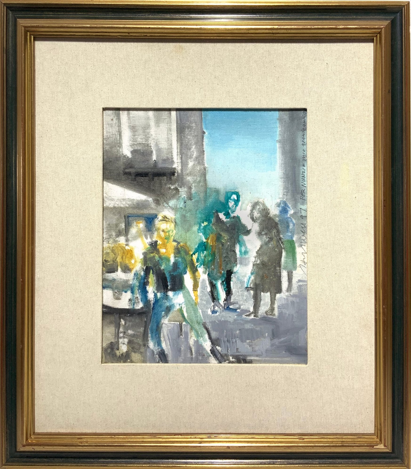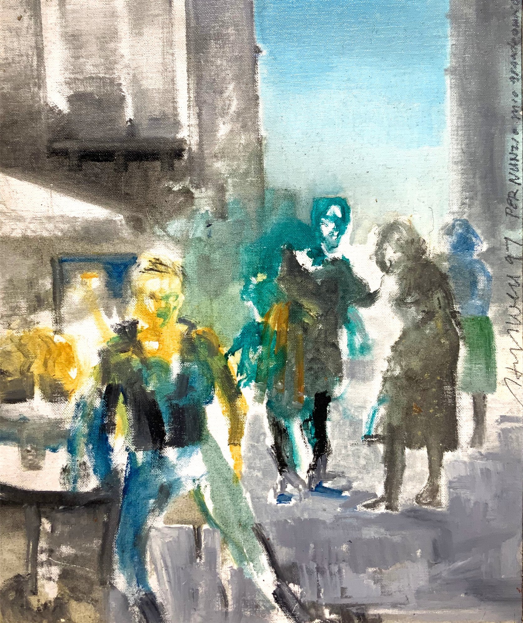 Dipinto raffigurante personaggi, Philip Hipwell. Cm 30x25, ad olio su cartone telato. Firmato e datato ‘97 con dedica sul lato destro.