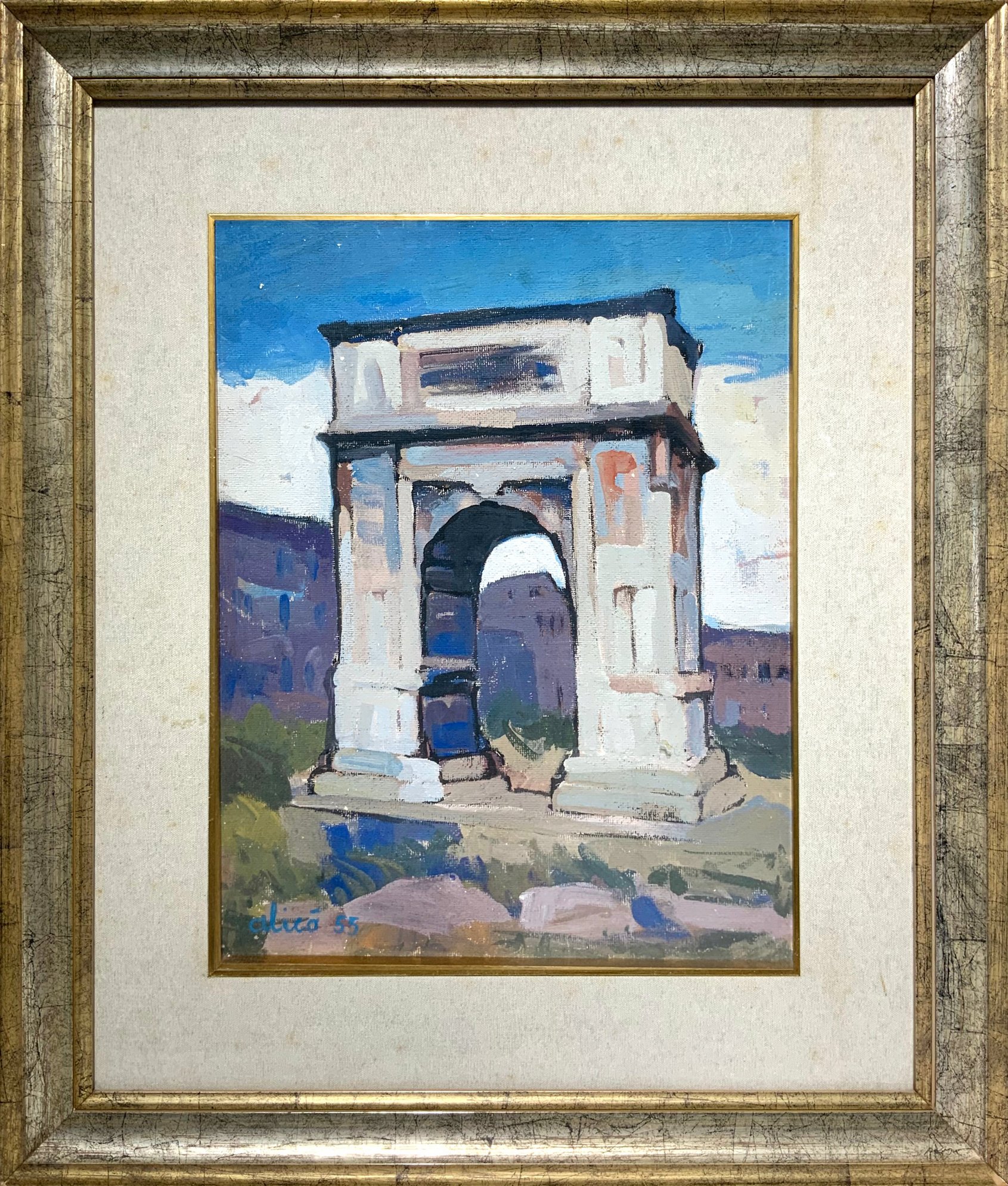 Dipinto raffigurante arco di trionfo di Alicò Giovanni (Catania 1906-1971). Cm 50x40, ad olio su masonite telata. Firmato e datato 1955 in basso a sinistra.