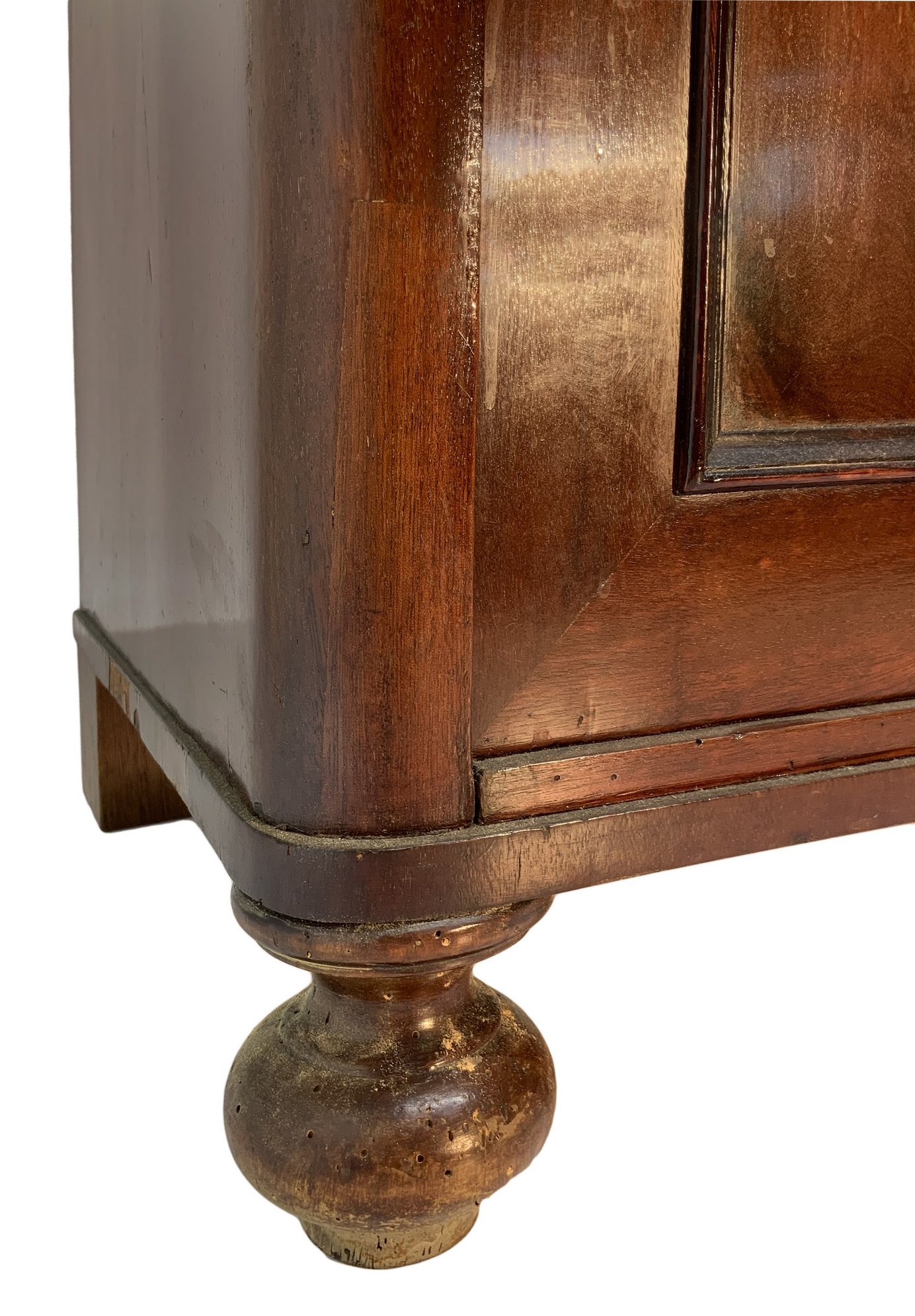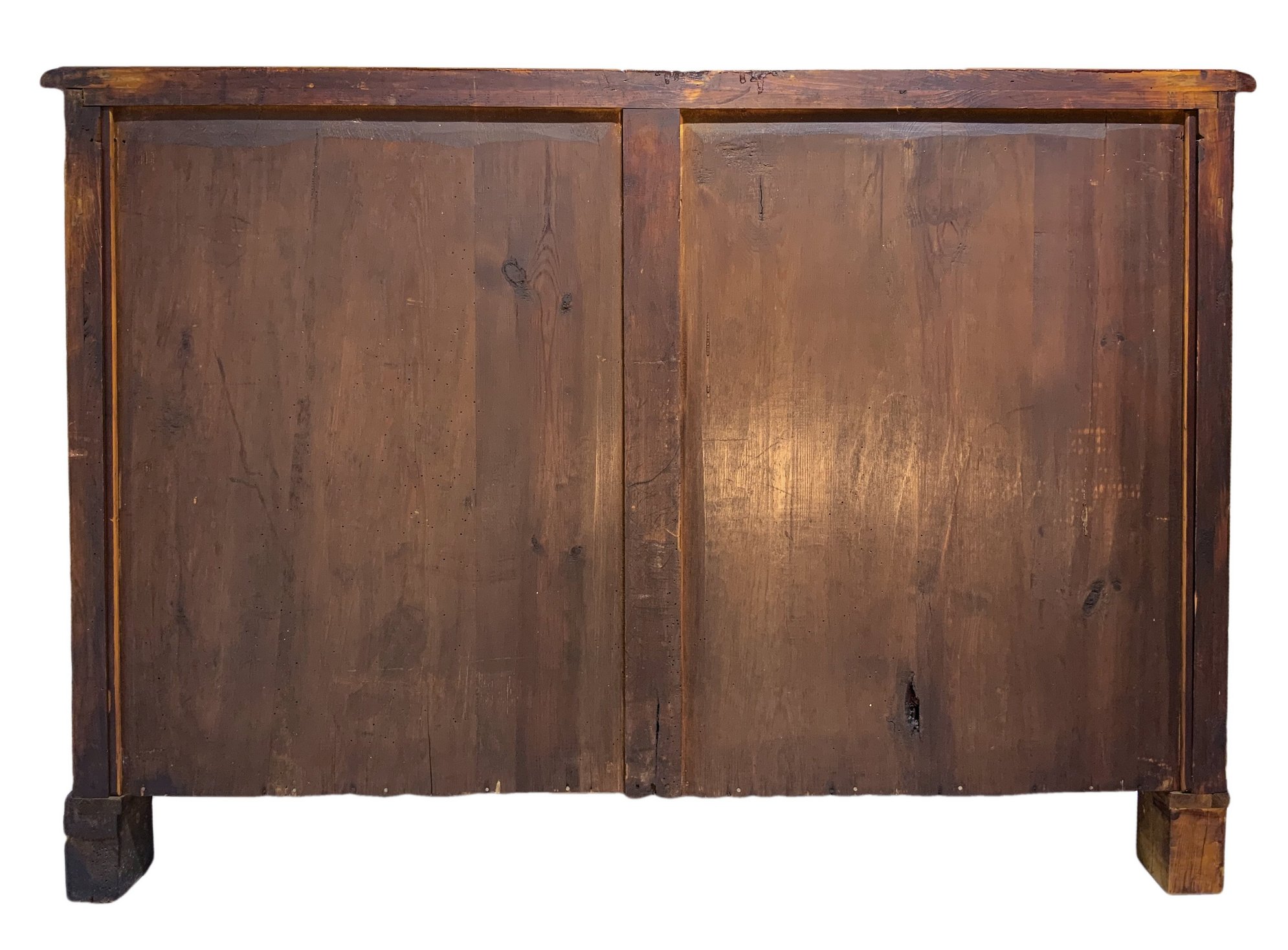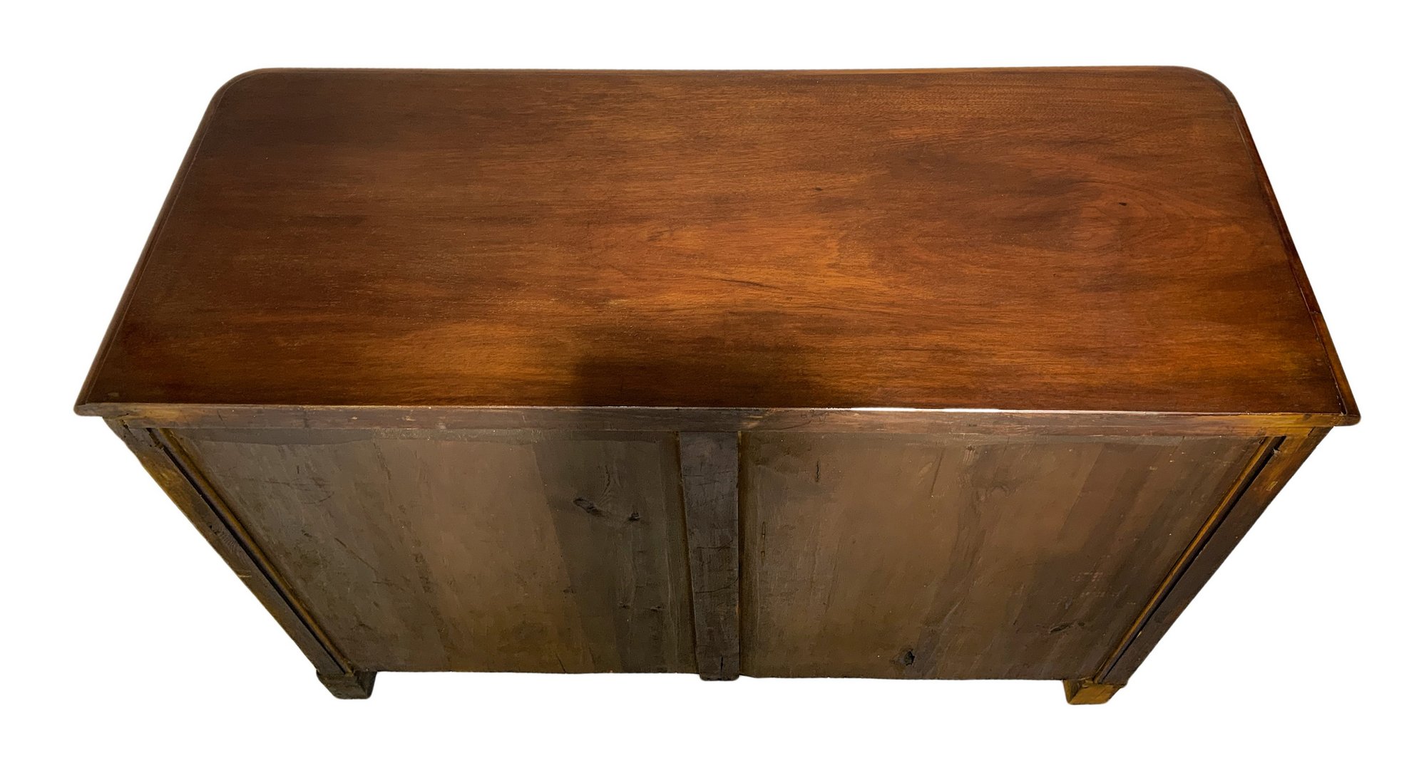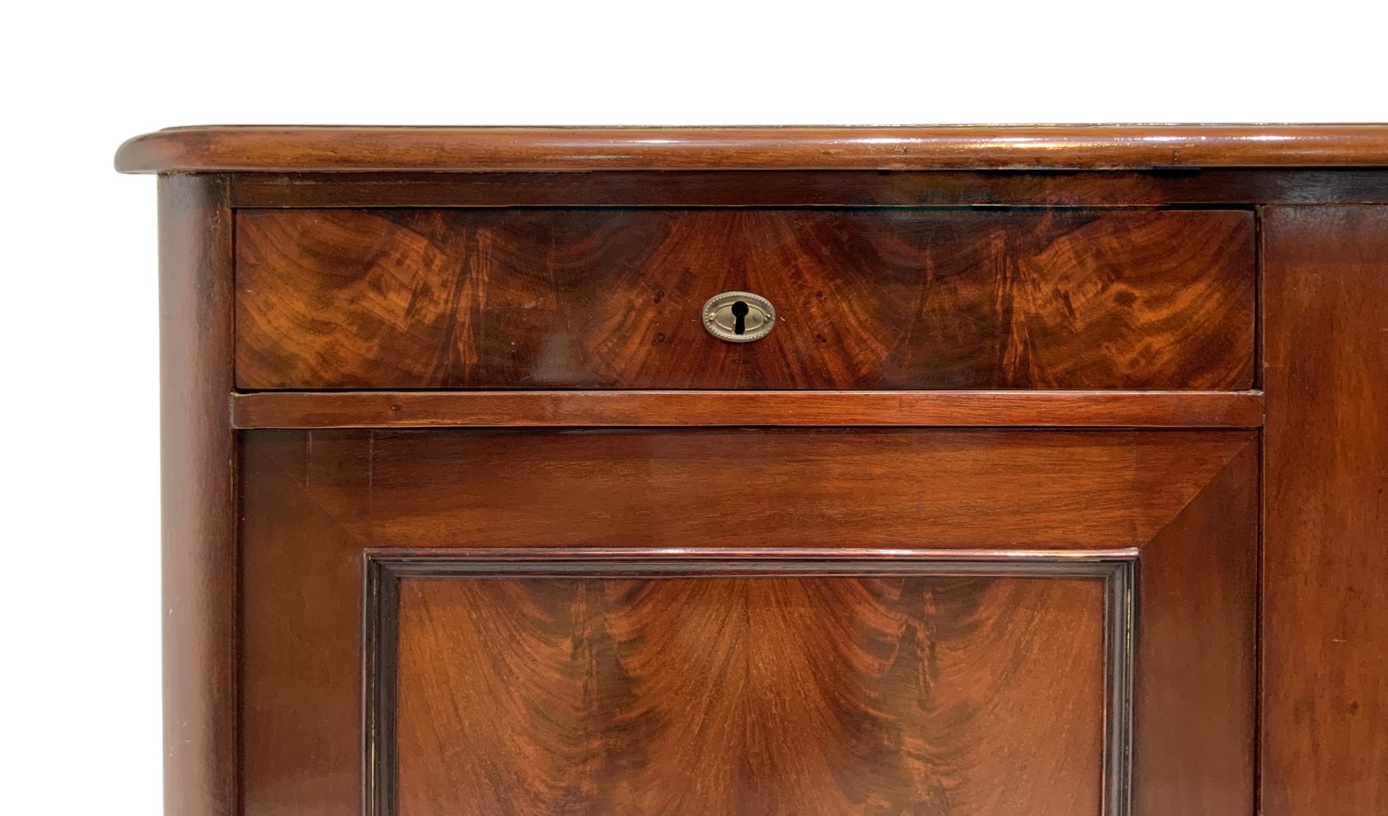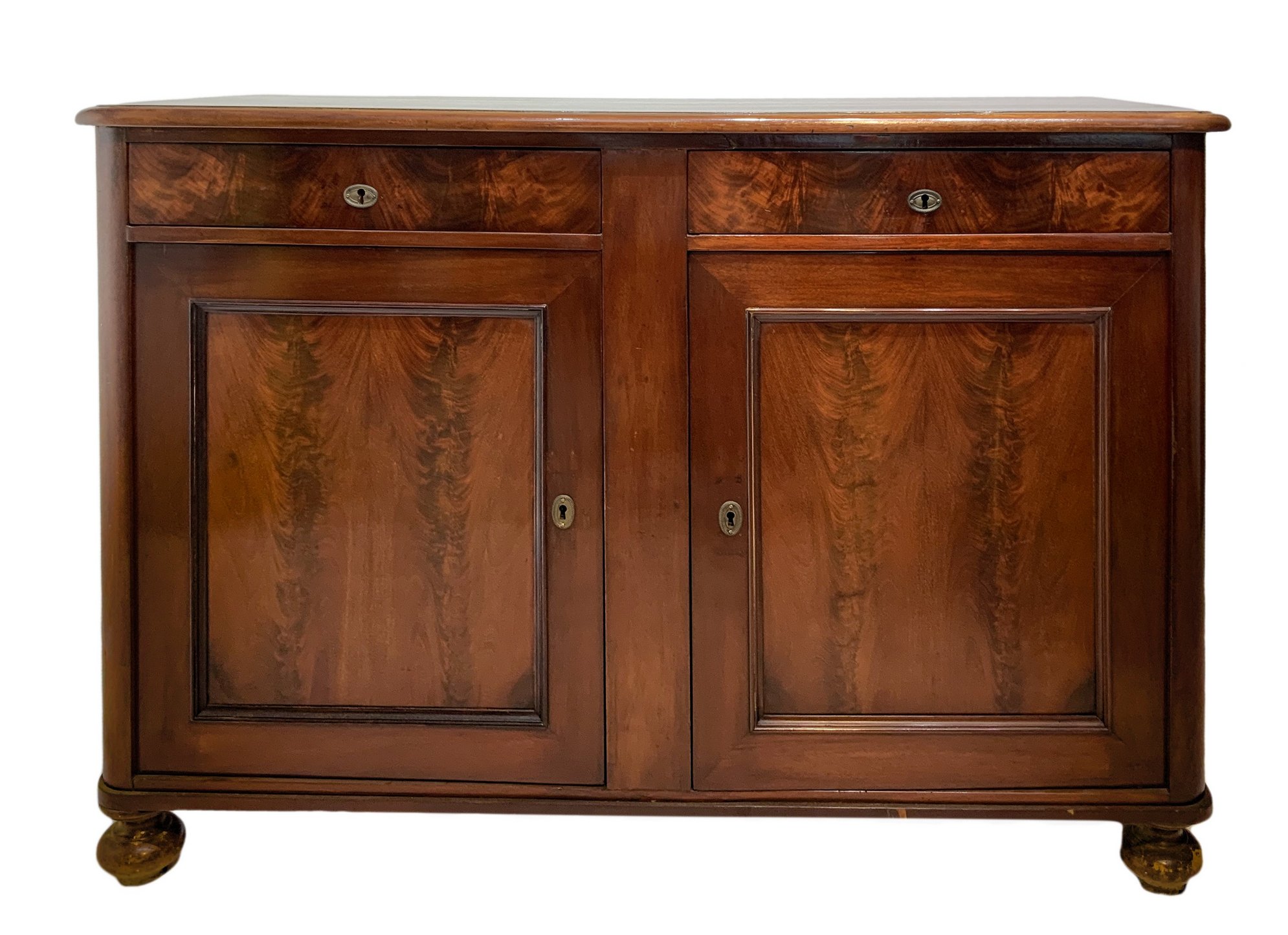 Servante in legno di mogano e piuma di mogano, due cassetti superiori e sportelli inferiori, fine XIX secolo. H cm 86x123x51
