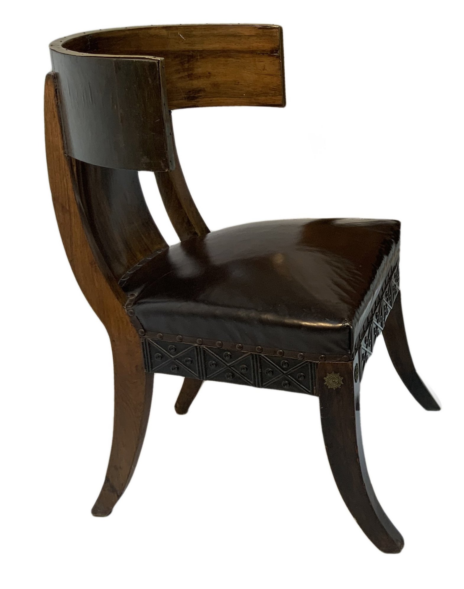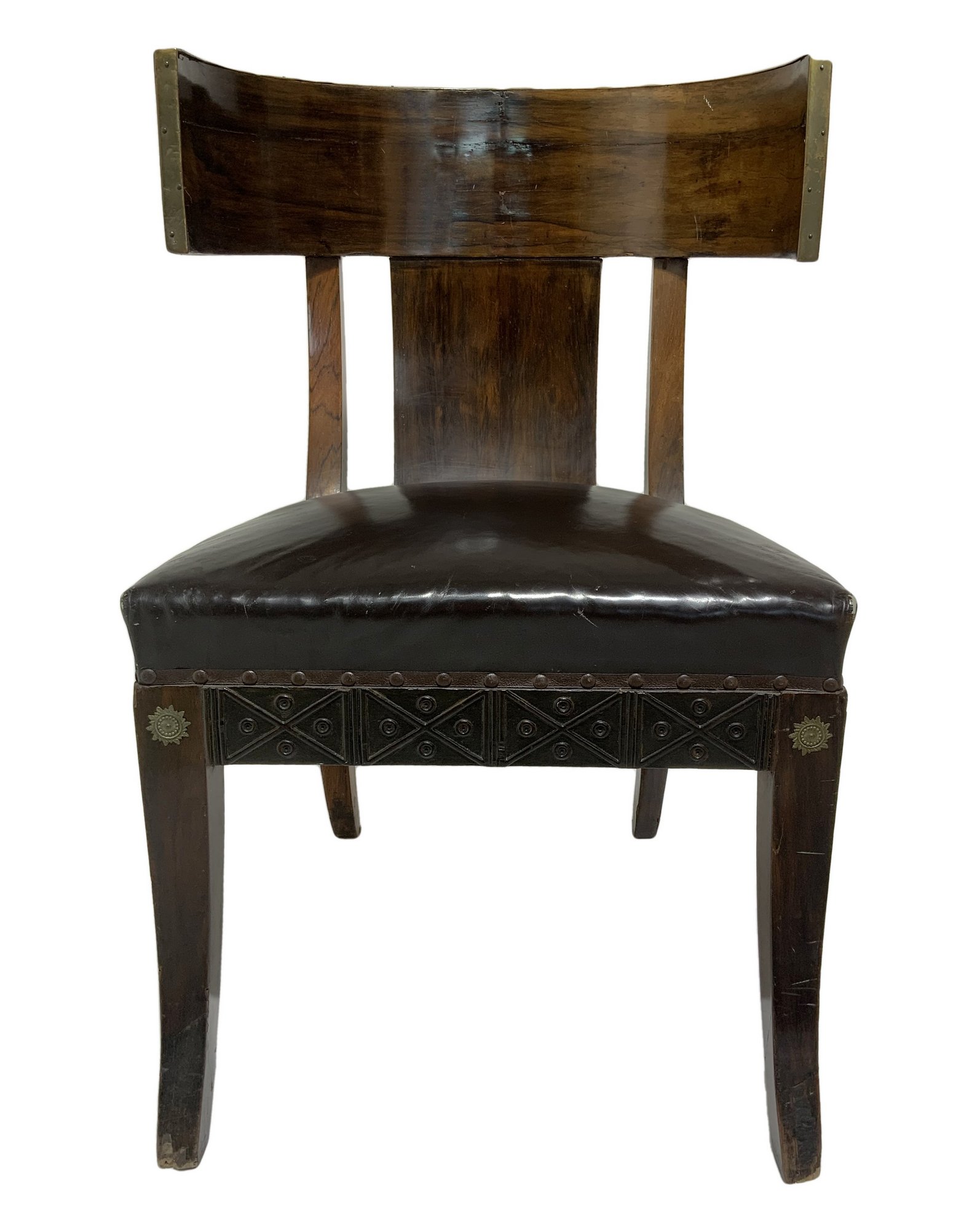 Sedia modello Klismos in legno di noce e seduta in pelle, dettagli in ottone, inizi XIX secolo. H cm 81x53x50.