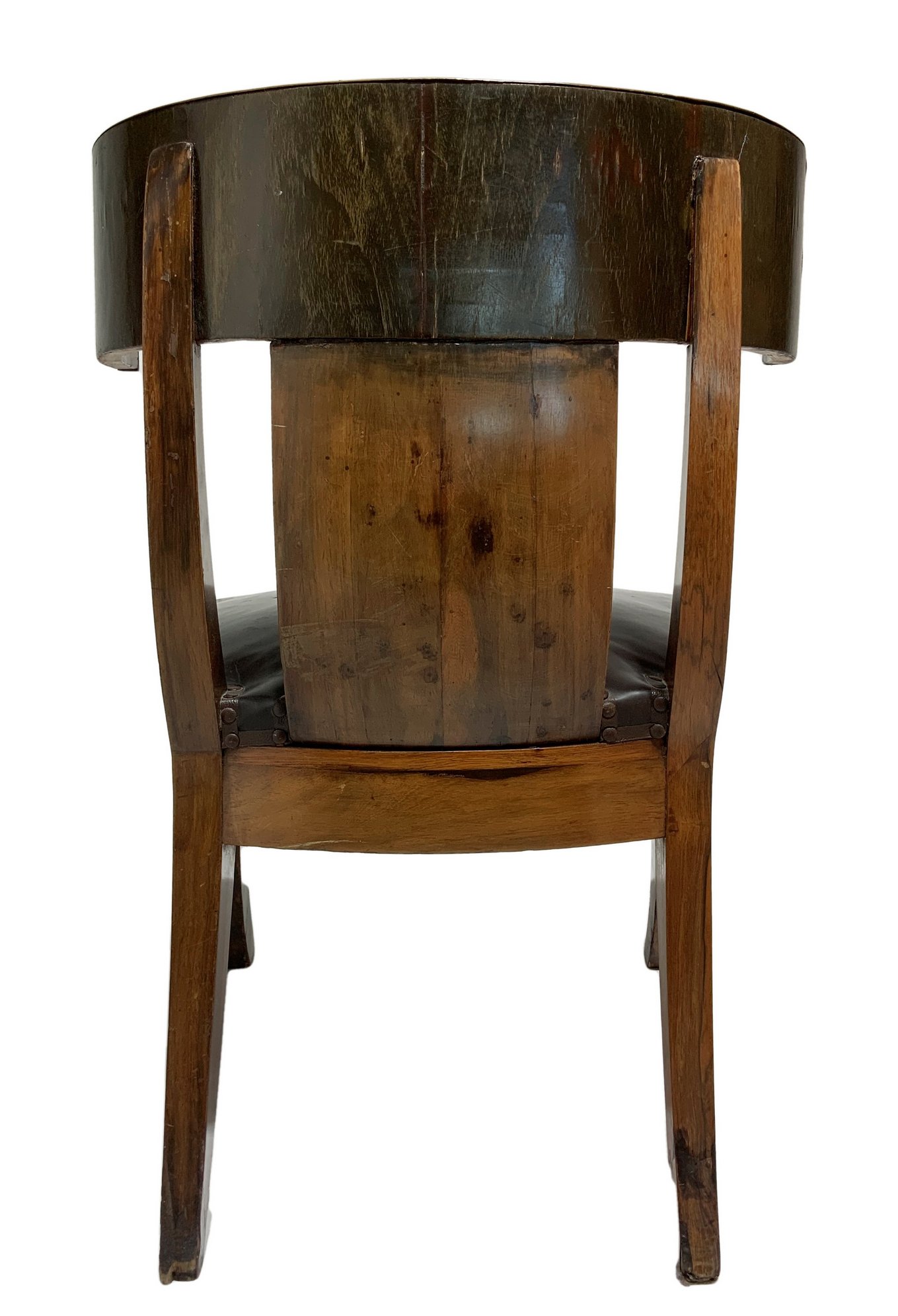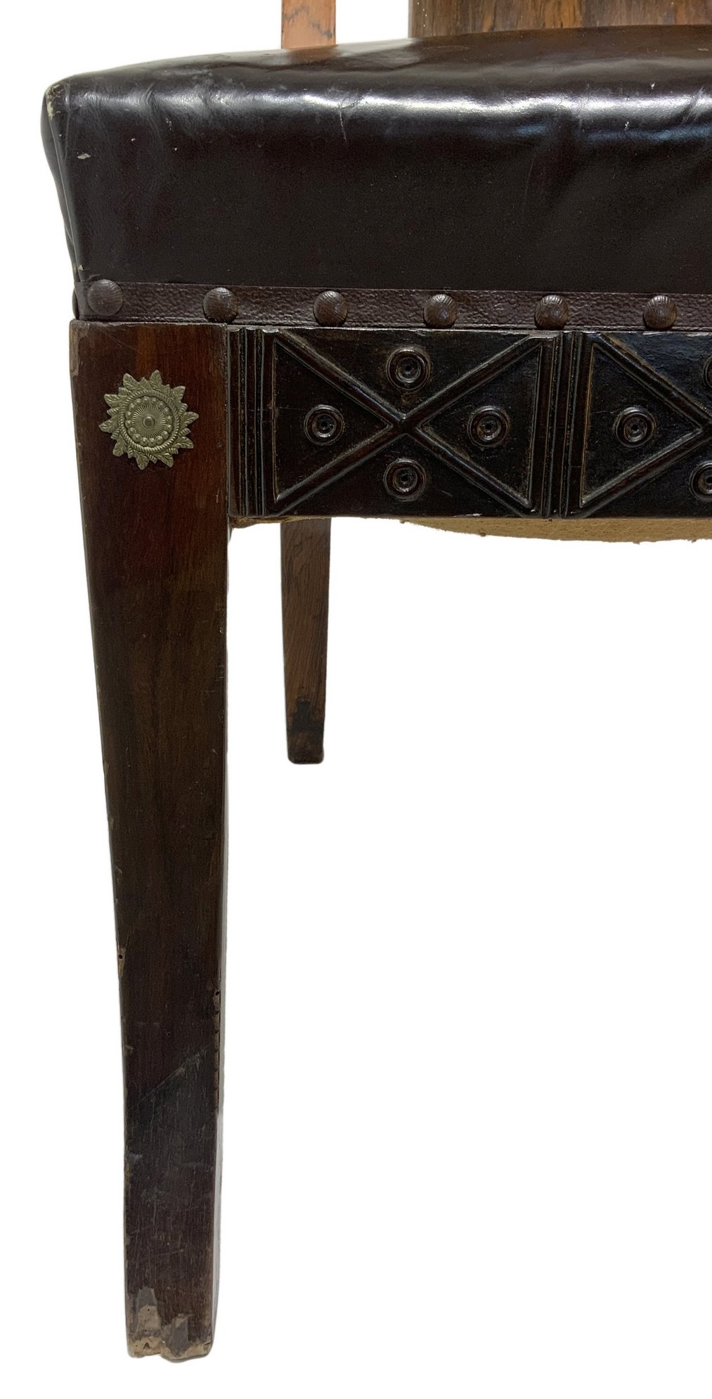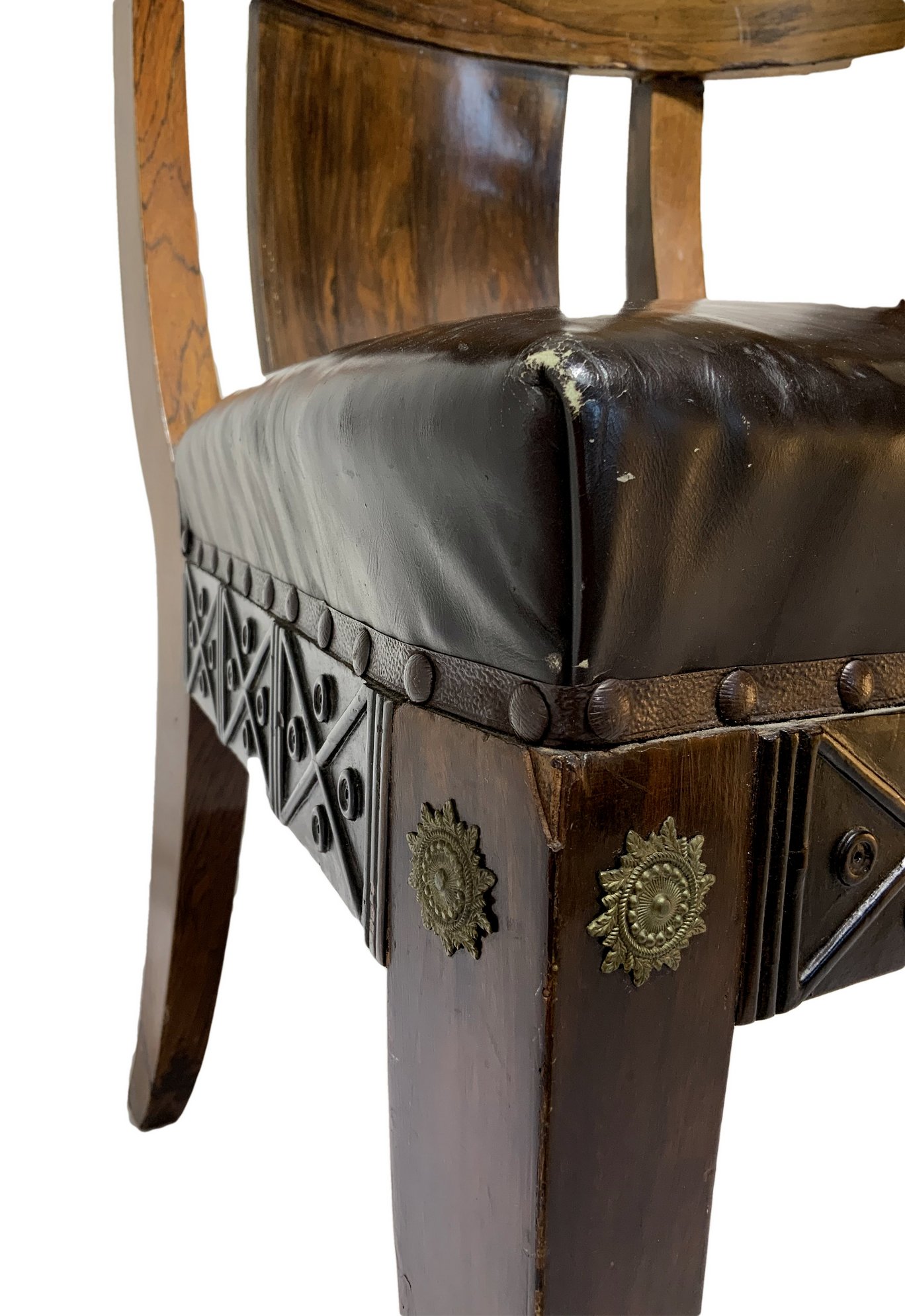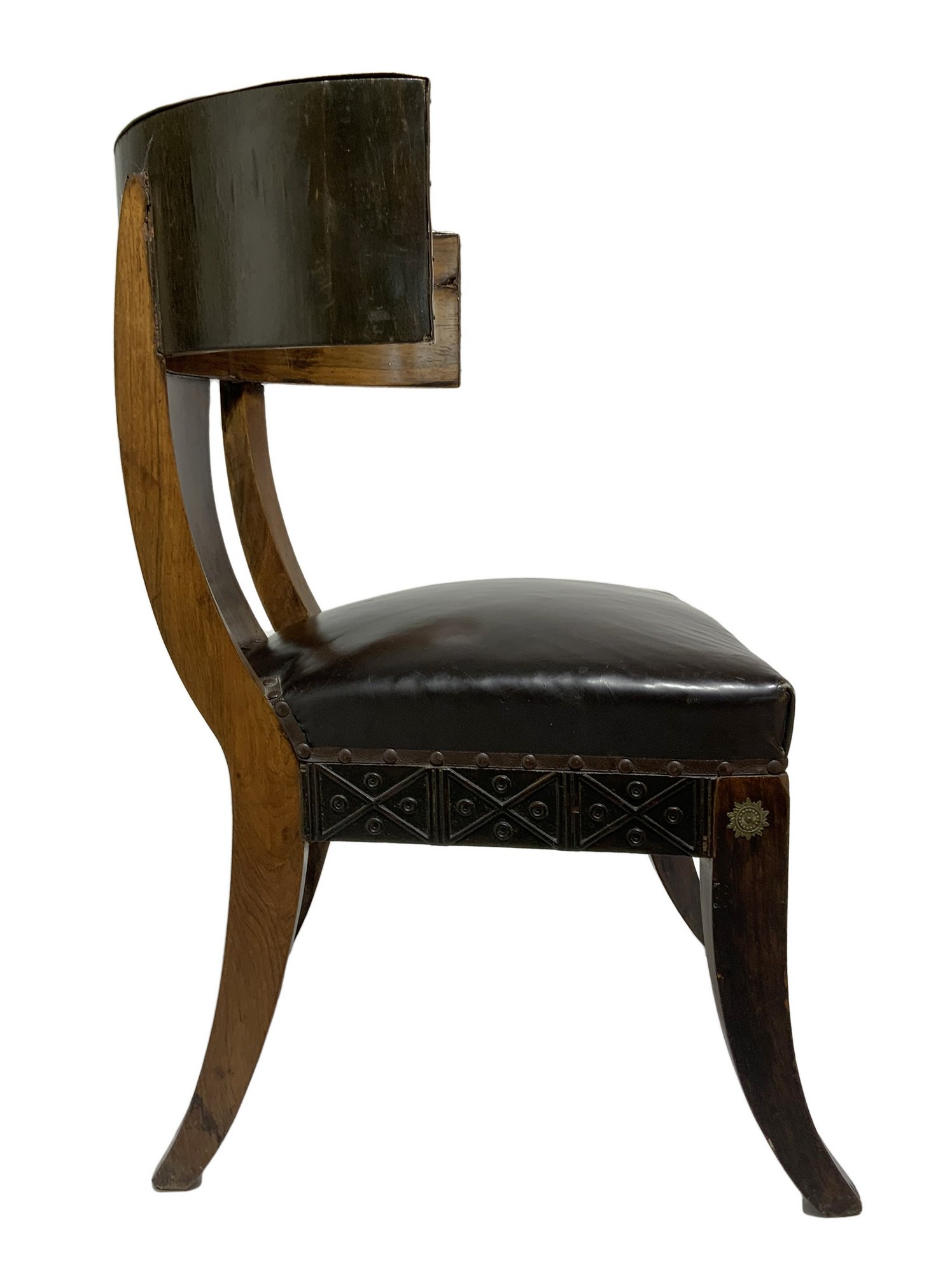 Sedia modello Klismos in legno di noce e seduta in pelle, dettagli in ottone,...