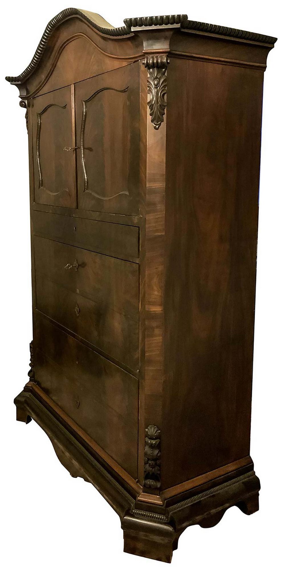 Chiffonier in piuma di mogano, metà XIX secolo, Sicilia. Due sportelli nella parte superiore, cinque cassetti sottostanti. H cm 185x107x50.