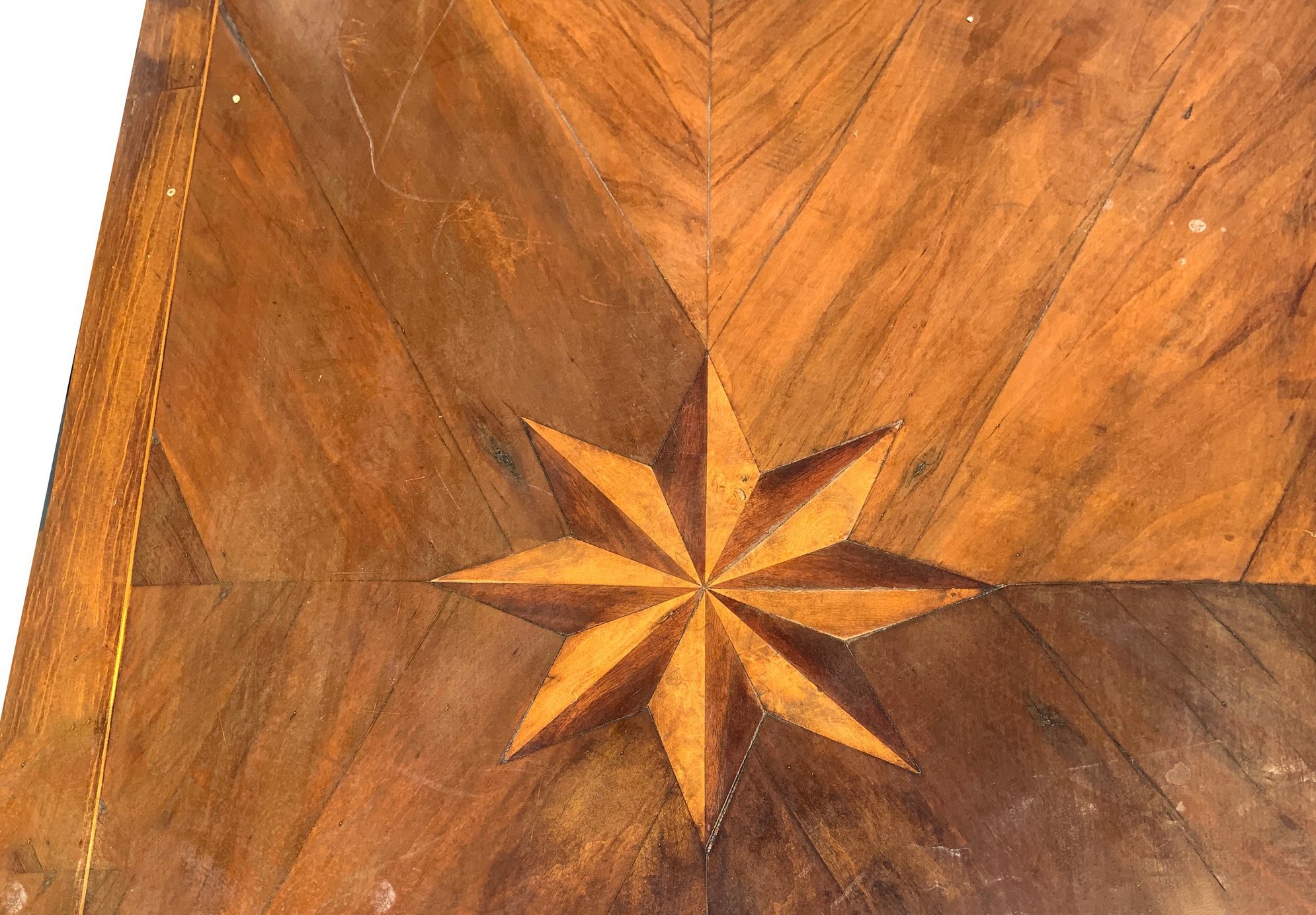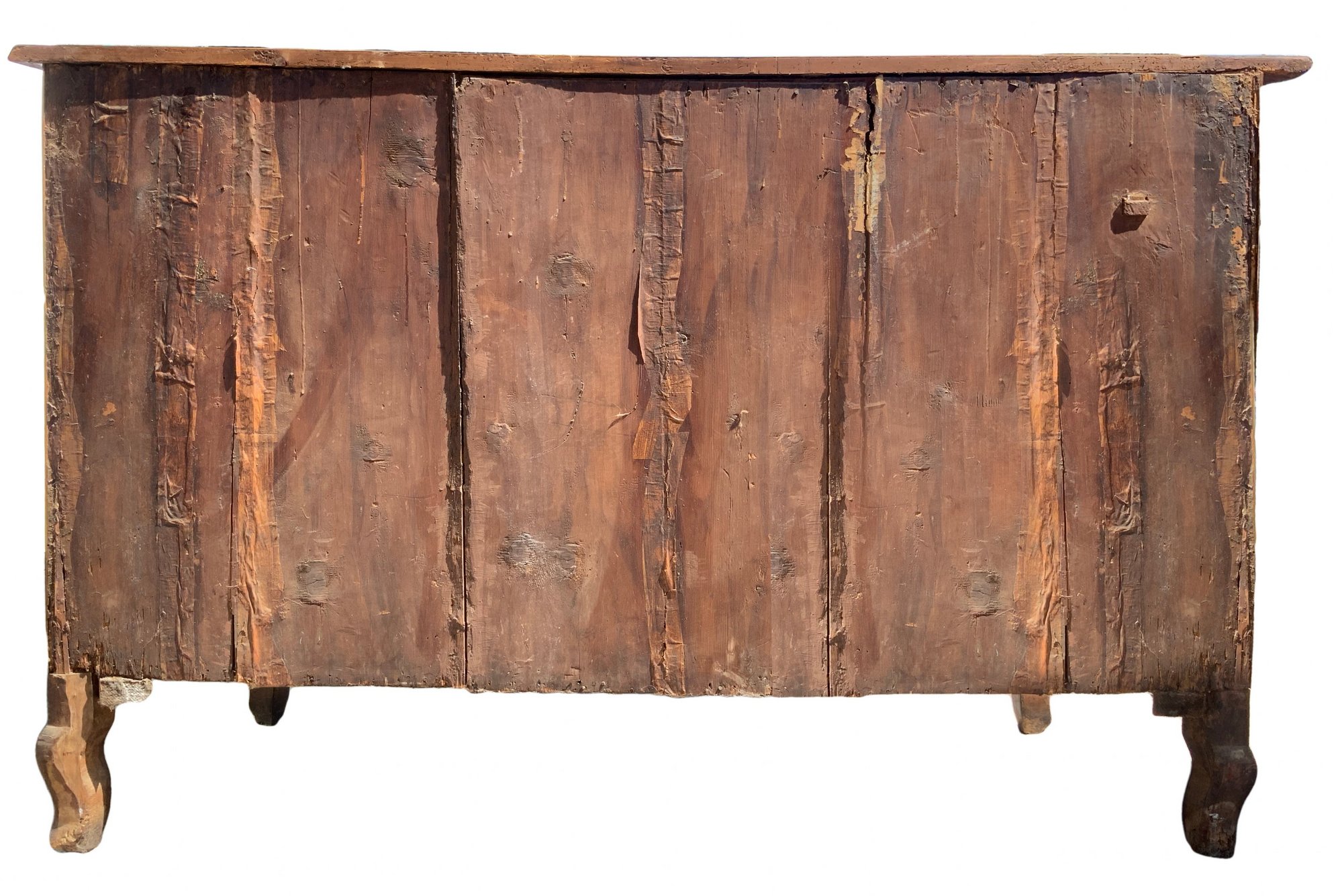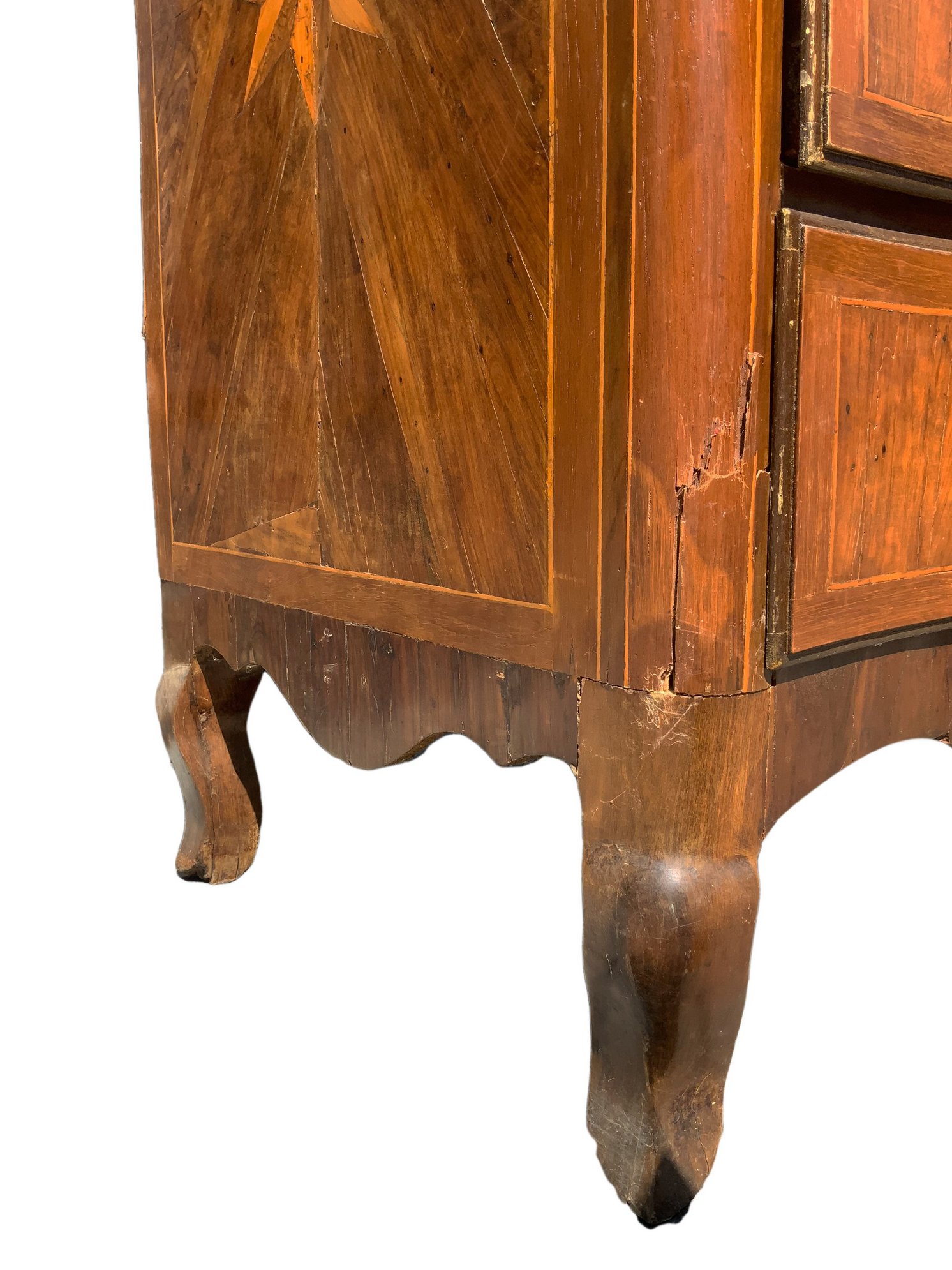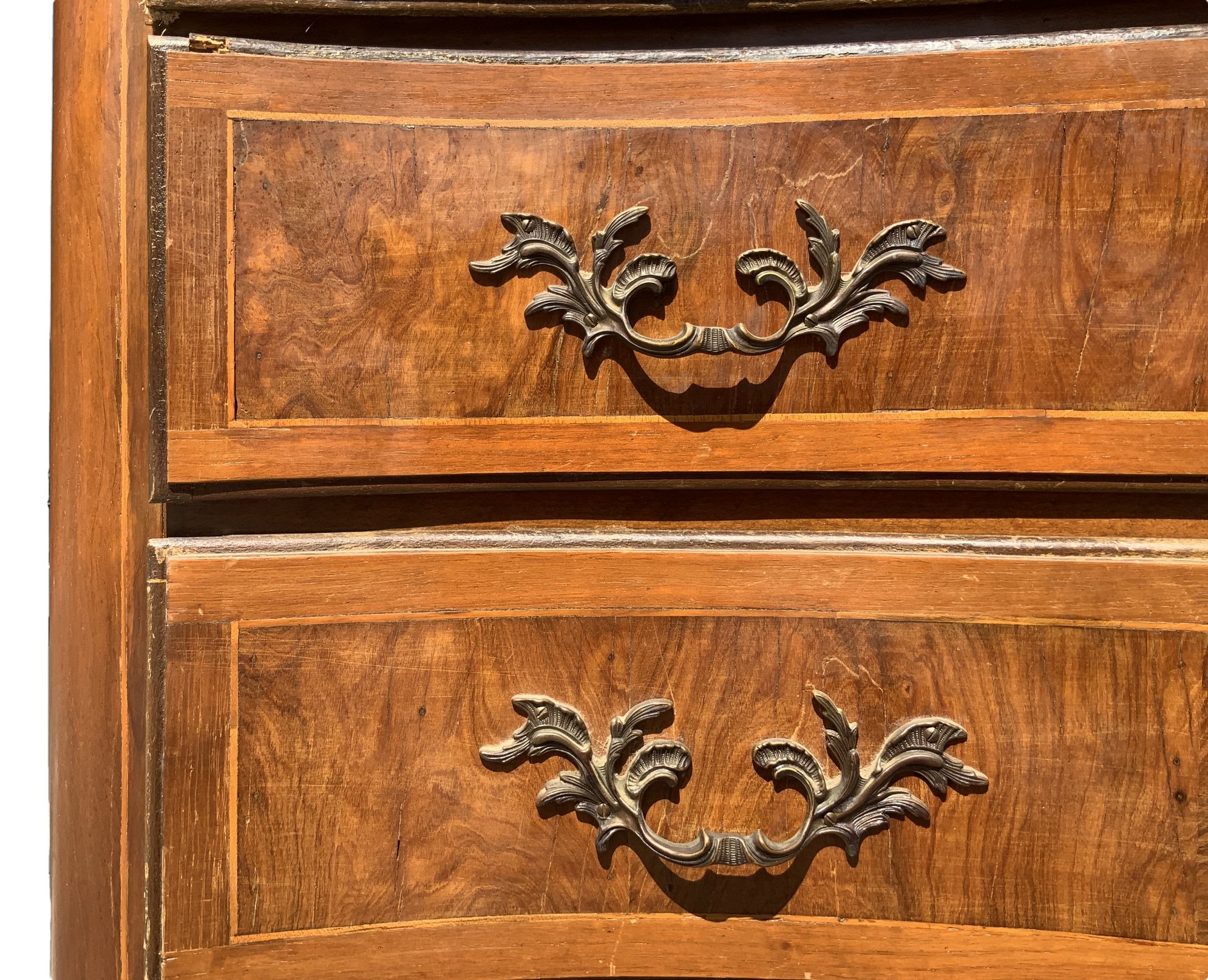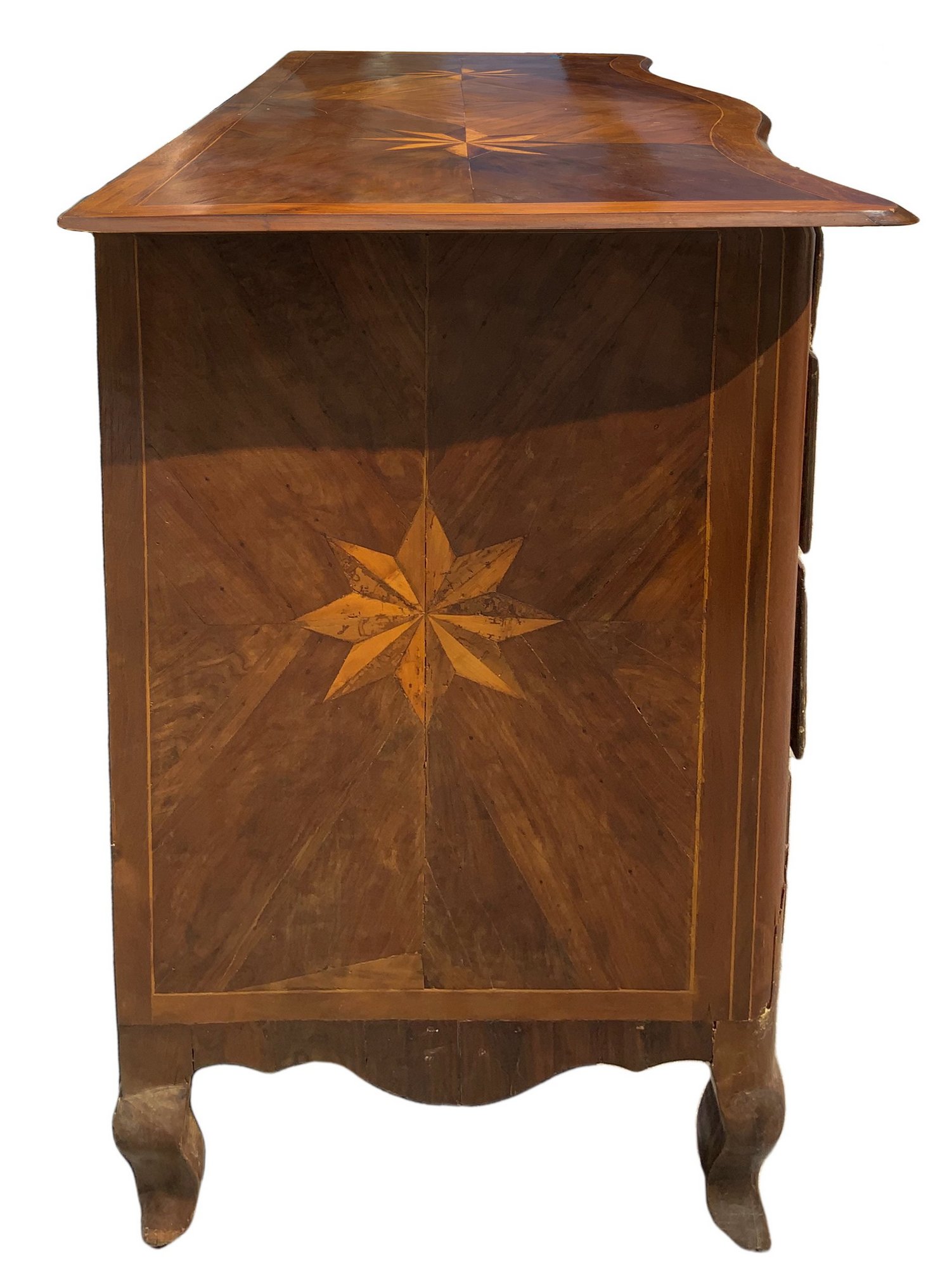 Cassettone in legno di noce e di ulivo a quattro cassetti, piedi a cabriolet, intarsiato sul piano e lateralmente con rose dei venti. Malta, metà XVIII secolo. Cm 110. Cm 157x67.