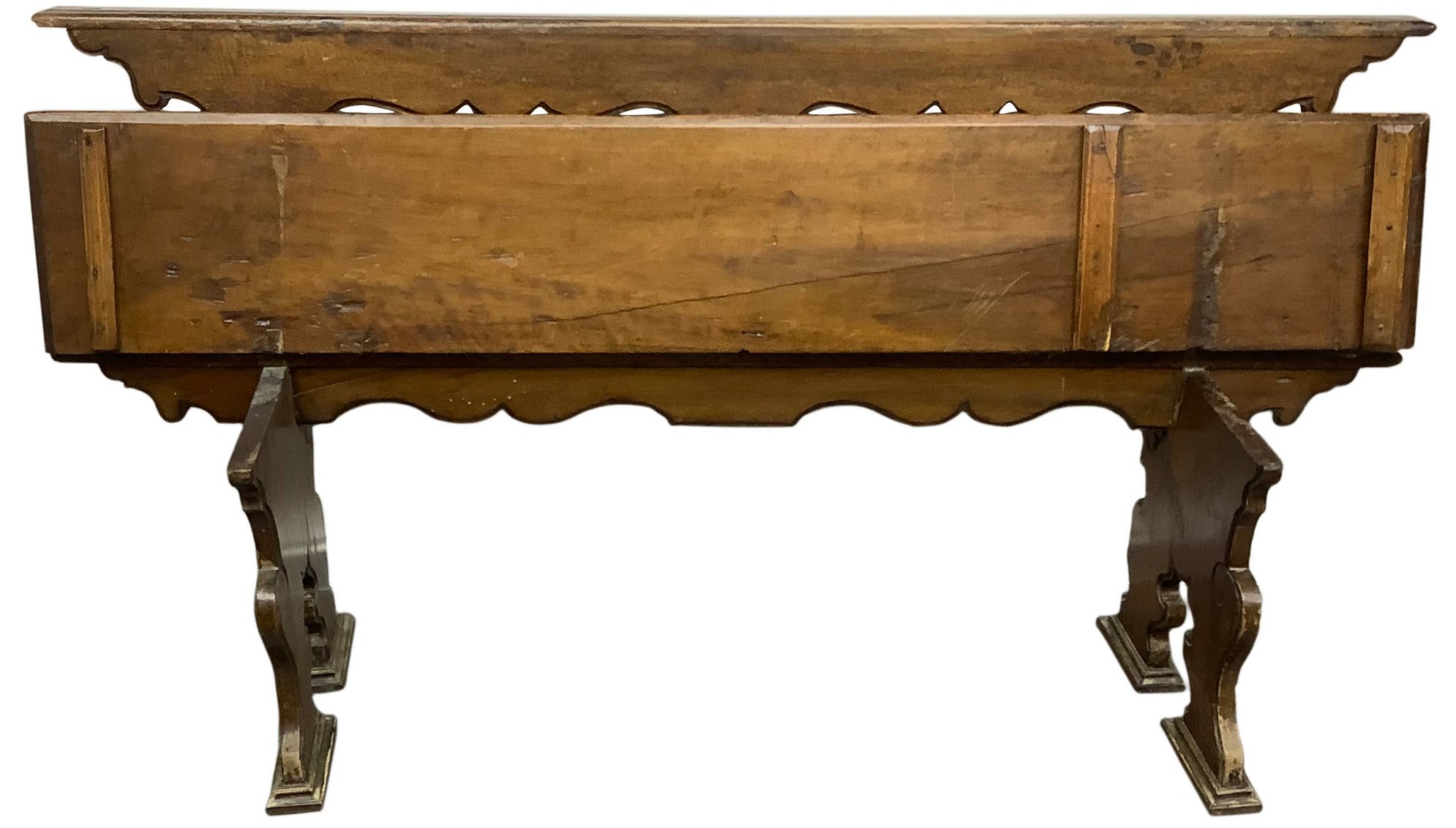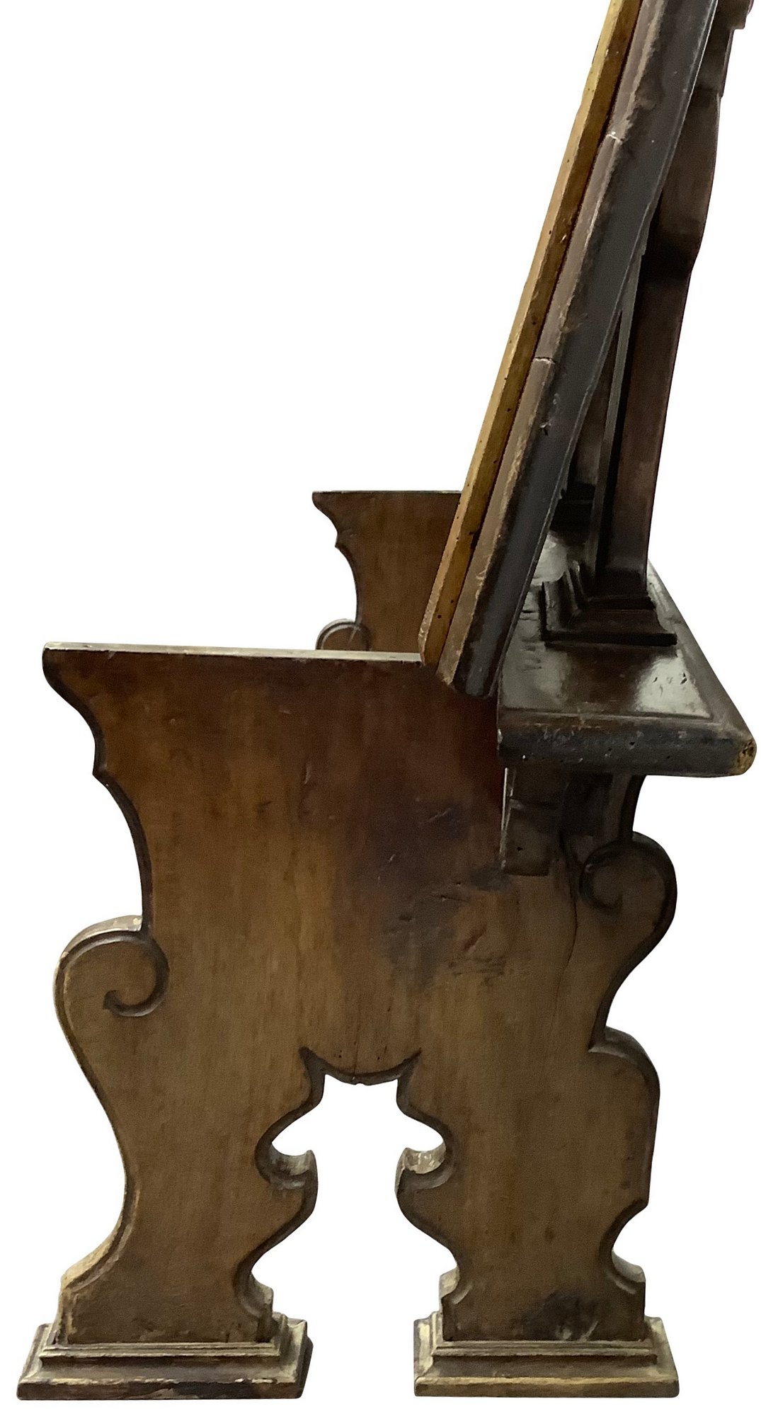 Panca in legno di noce con spalliera e seduta pieghevole, XVII secolo. Spalliera con decoro ad asso di coppe, piedi a lira. H cm 95xcm H 180x44.